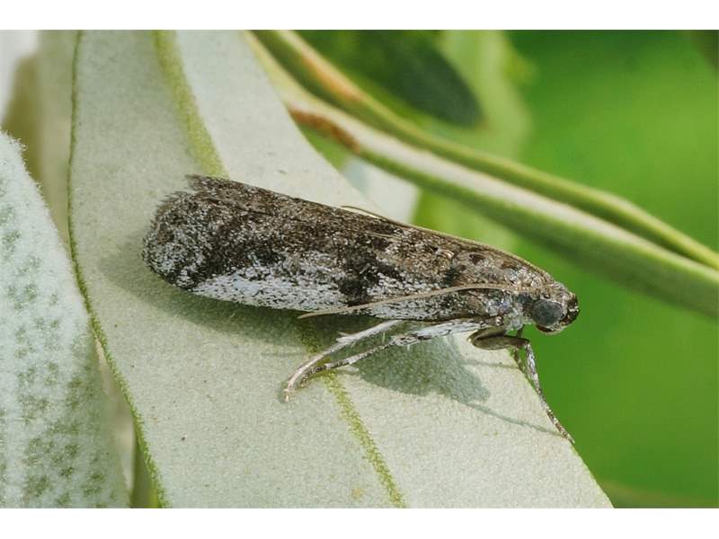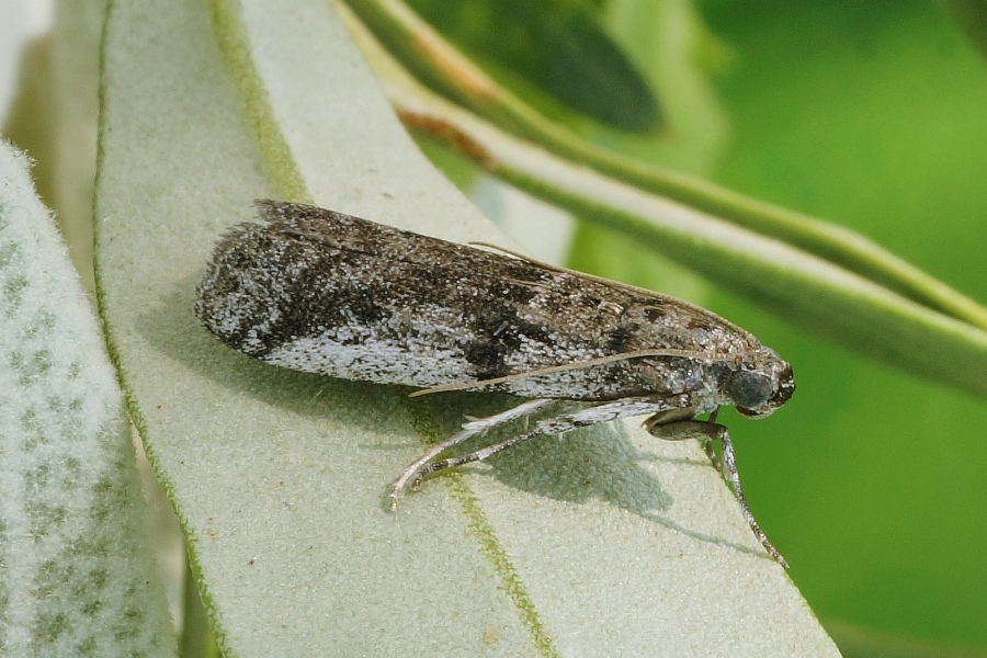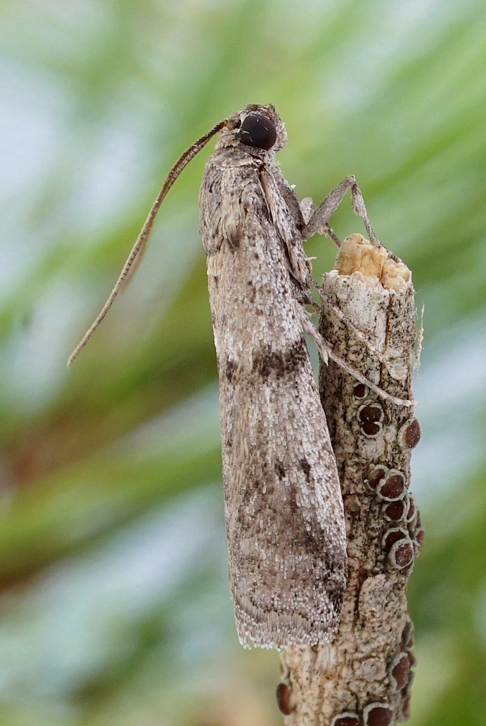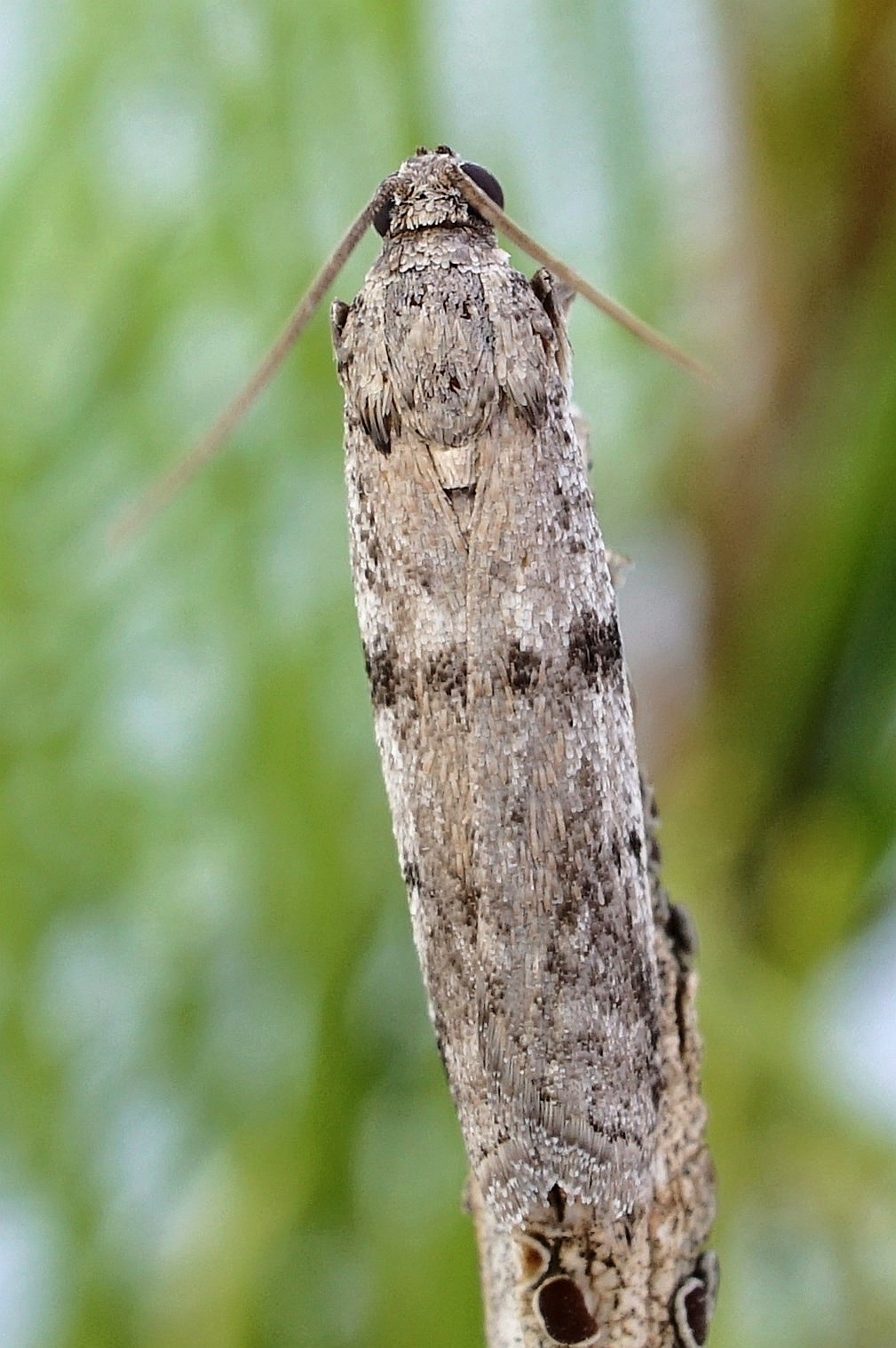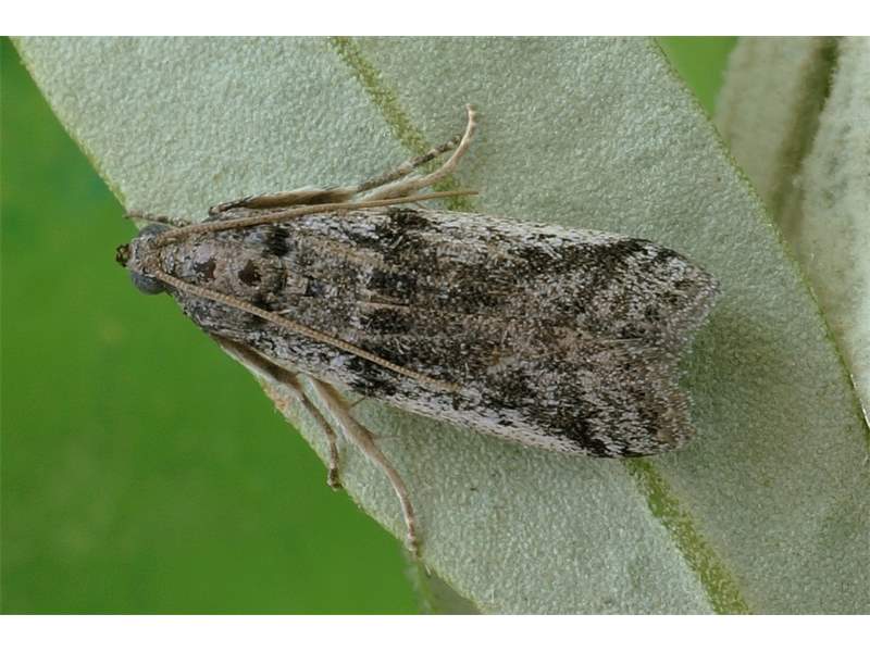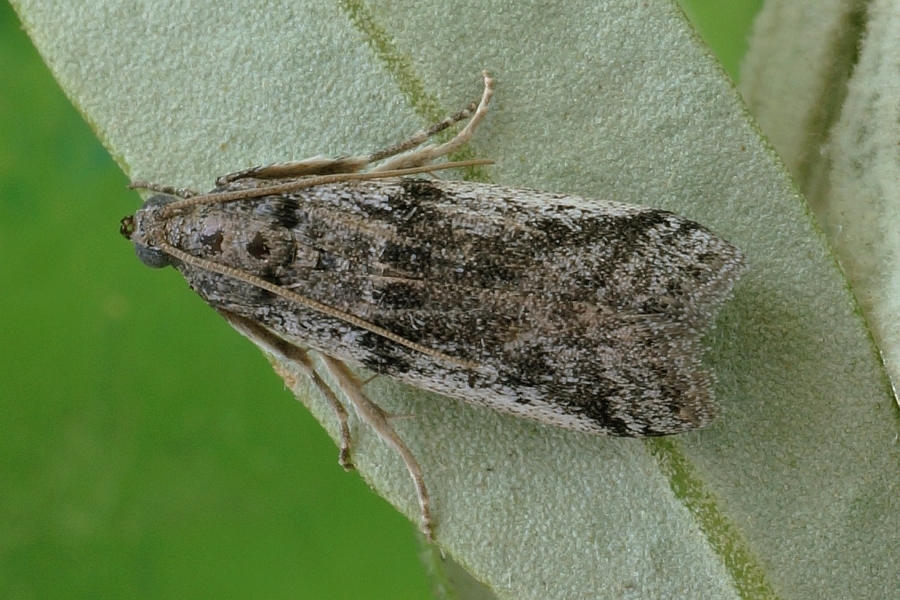 Vorderflügel graubraun mit zahlreichen schwarzen eingestreuten Schuppen; bei 1/4 und 4/5 jeweils eine grauweiße Querlinie; Basal- und Mittelfeld jeweils in der vorderen Flügelhälfte grauweiß; Mittelfeld bisweilen in der hinteren Flügelhälfte mit zwei braunen Längsstriemen; Mittelfeld mit breitem schwarzem Saum entlang der inneren Querlinie und schmalerem schwarzem Saum entlang der äußeren Querlinie; Mittelfeld mit schwarzbraunem Schatten von der Mitte des Flügelhinterrandes bis zur äußeren Querlinie am Flügelvorderrand; Mittelfeld mit zwei schwarzbraunen Diskalflecken, die teilweise mit dem Schatten verschmelzen; Außenfeld mit schwarzbraunem Saum entlang der äußeren Querlinie. Palpen nach oben gebogen und dem Kopf dicht anliegend.