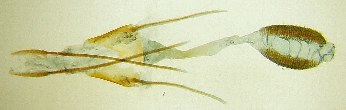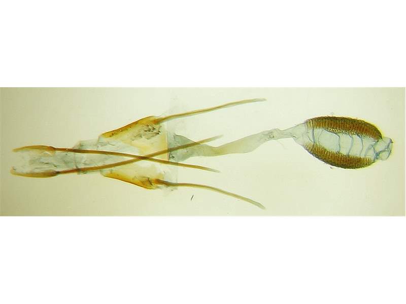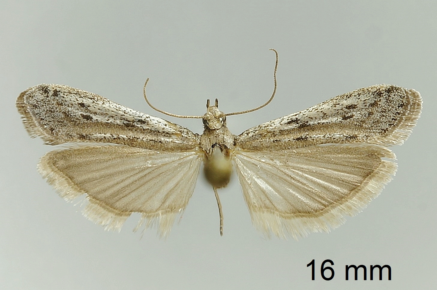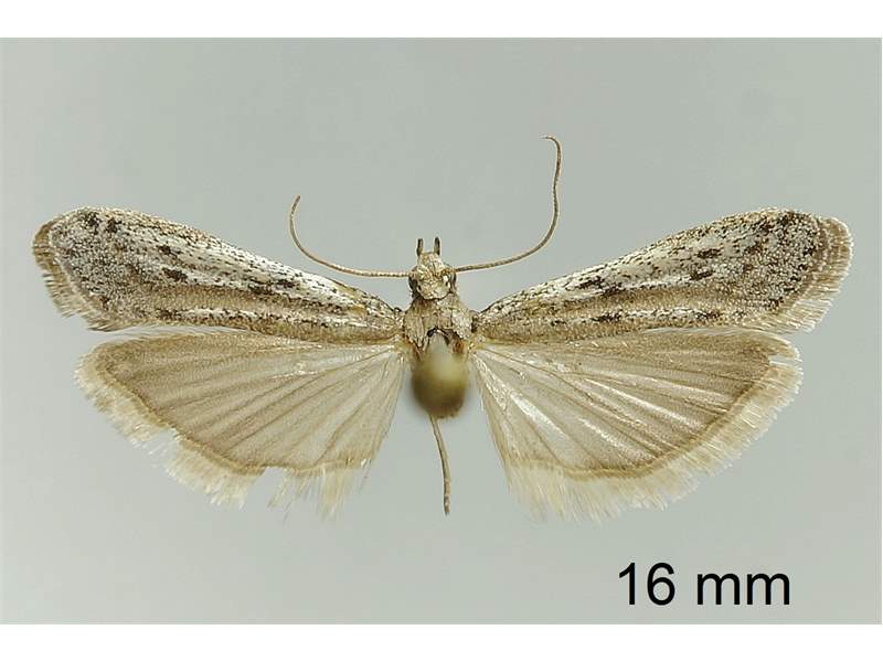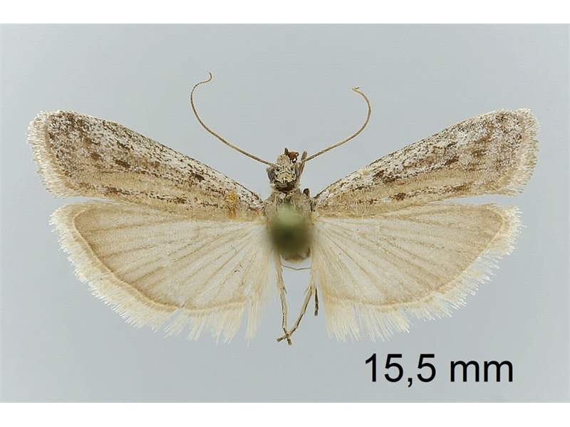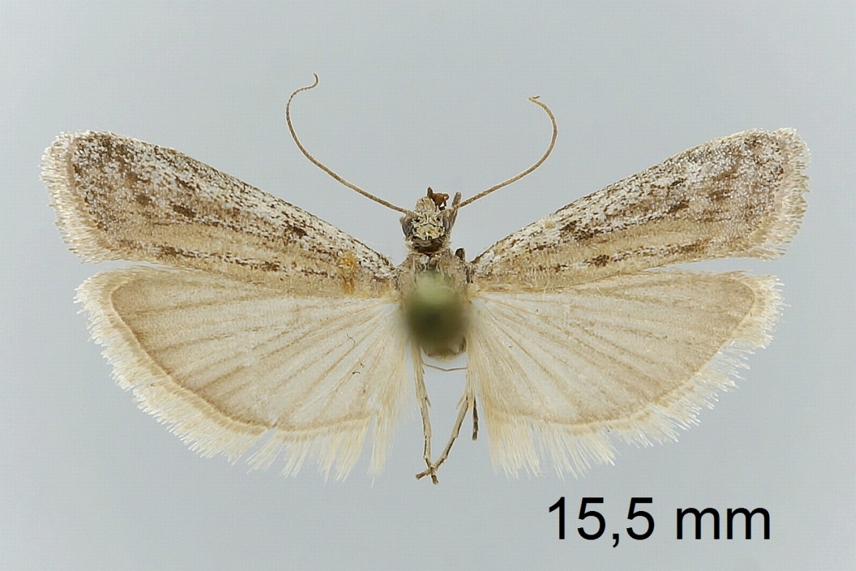 Vorderflügel X–Y mm lang; cremeweiß, hintere Flügelhälfte mit zwei hellbraunen Längsstriemen, die die übrigen Zeichnungselemente überdecken; mit zahlreichen eingestreuten schwarzen Schuppen auf der gesamten Flügelfläche; bei 1/3 eine schwarzbraune Querlinie, die deutlich unterbrochen ist, sodass nur 2–3 Punkte übrig bleiben; bei 5/6 eine cremeweiße, beiderseits schütter schwarzbraun gesäumte Querlinie; Mittelfeld mit zwei dunkelbraunen Diskalflecken, vorderer oft sehr klein.