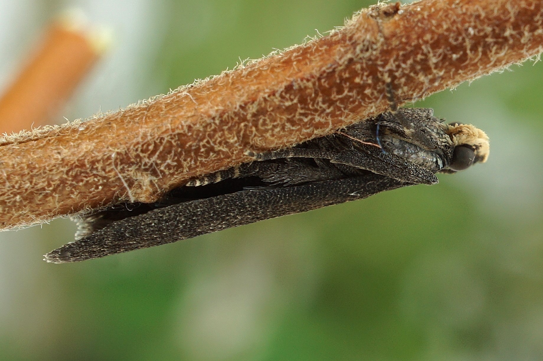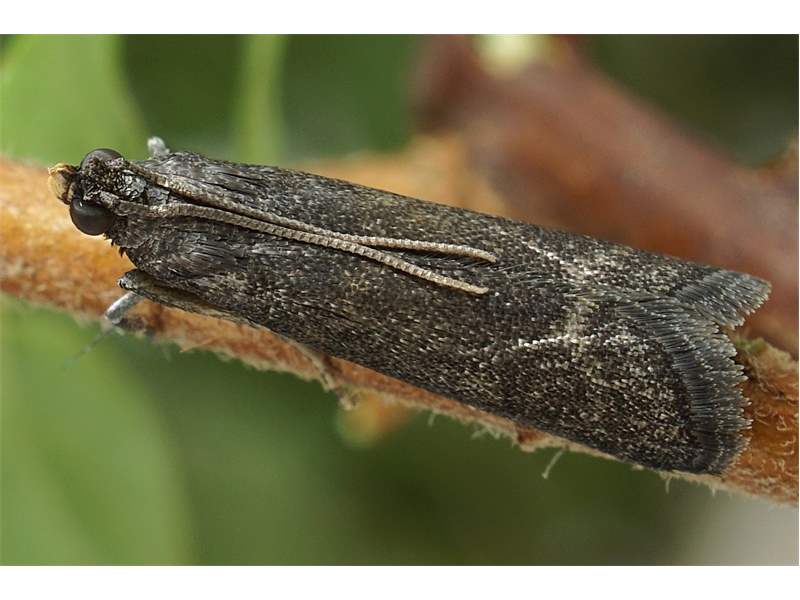 Vorderflügel X–Y mm lang; dunkelgraubraun und nahezu vollständig zeichnungslos; bei 2/5 und 5/6 jeweils eine unauffällige, dünne braune Querlinie; innere Querlinie oft sehr schwach ausgeprägt; Mittelfeld mit zwei sehr unauffälligen dunkelgraubraunen Diskalflecken, die zu einem kleinen Querstrich verbunden sind. Kopf dunkelgraubraun. Palpen beim Männchen vollständig hellgelb, beim Weibchen nur in der proximalen Hälfte.