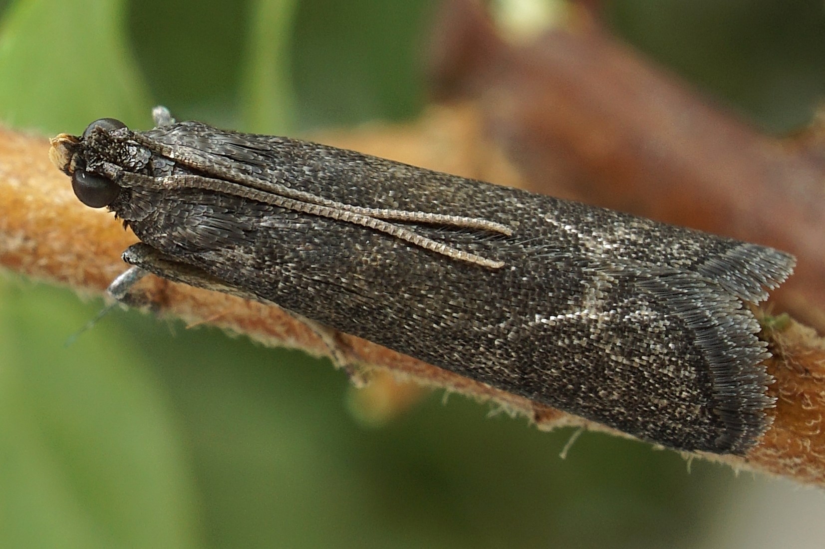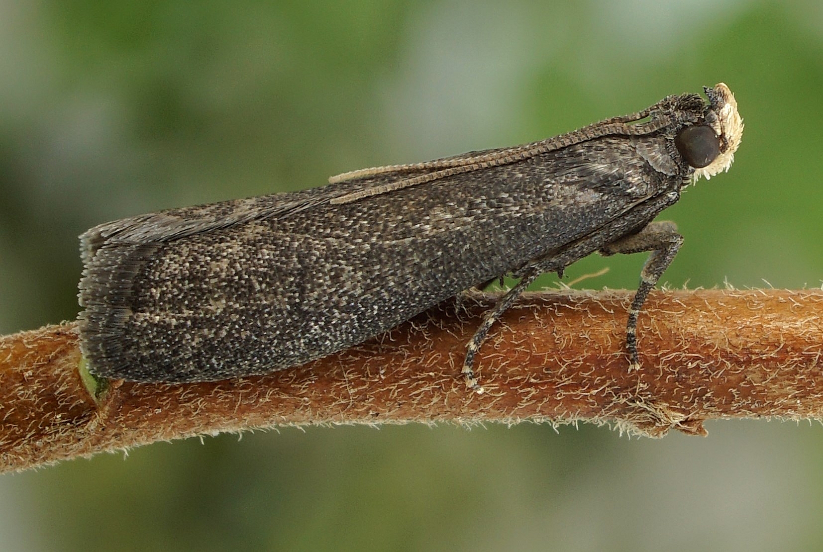 Ähnliche Arten: Salebriopsis albicilla, deren Stirn und Antennenbasis hellgelb beschuppt sind. Episcythrastis tetricella, die über die ganze Flügelfläche verteilt apikal hellgrau gesäumte Schuppen besitzt und deren Palpen ventral hellgrau sind (durch apikal hellgrau gesäumte Schuppen).
