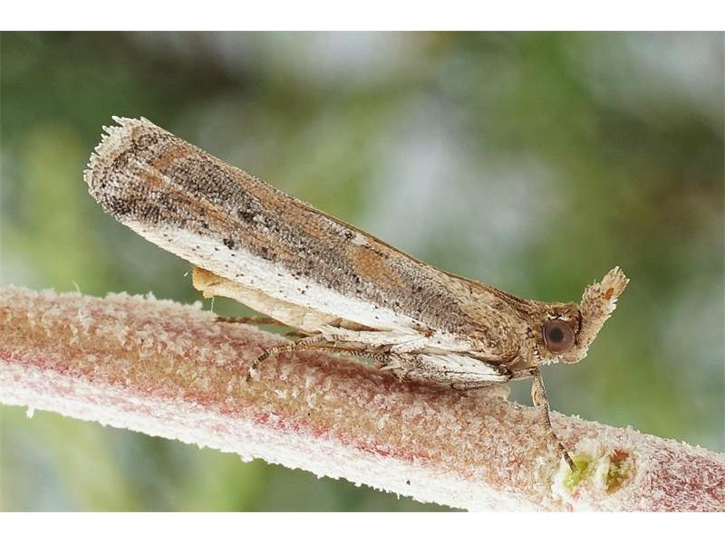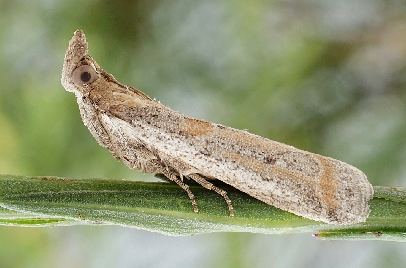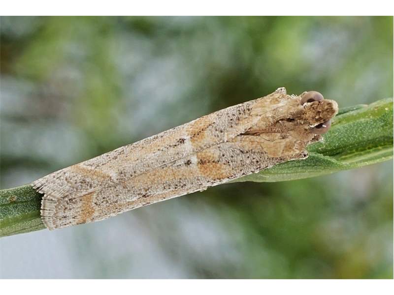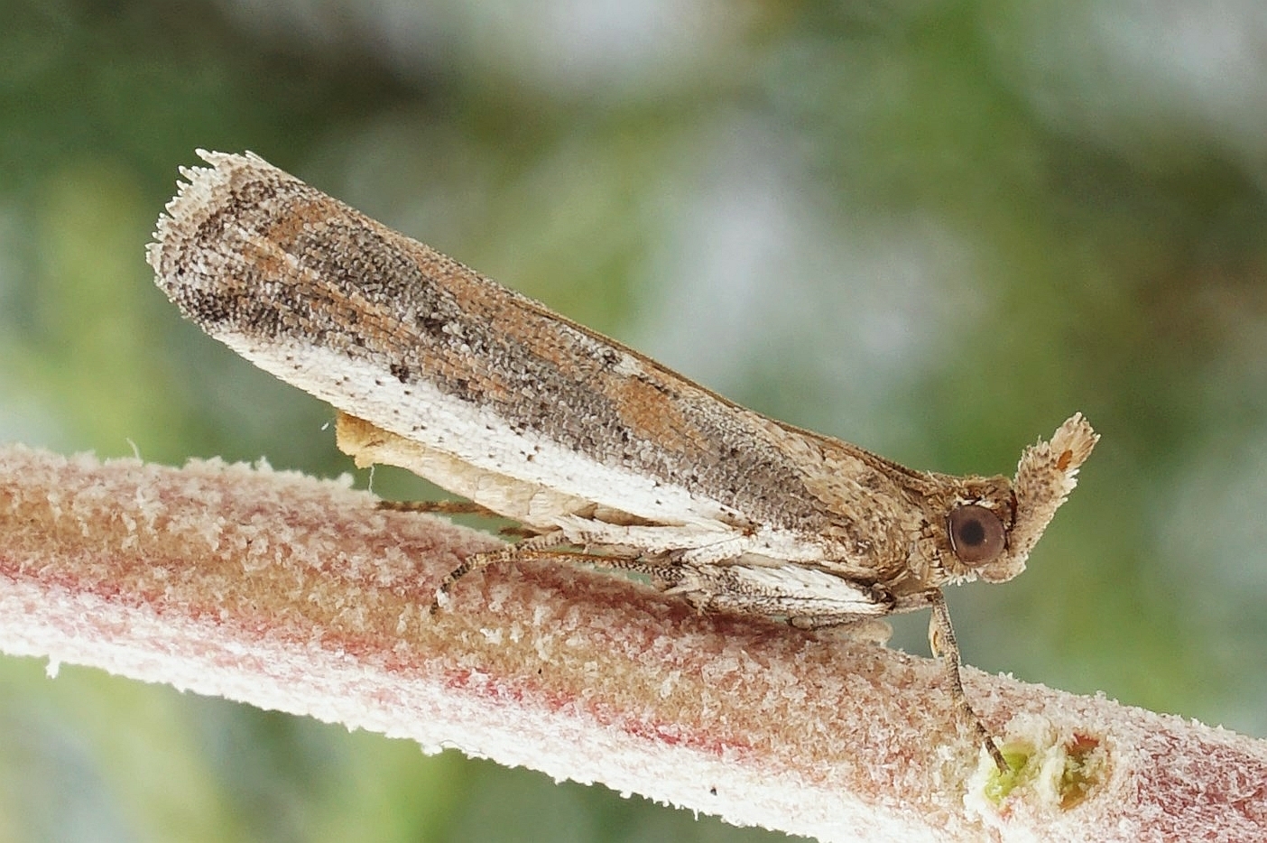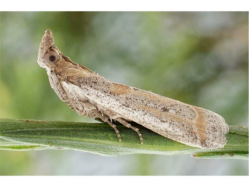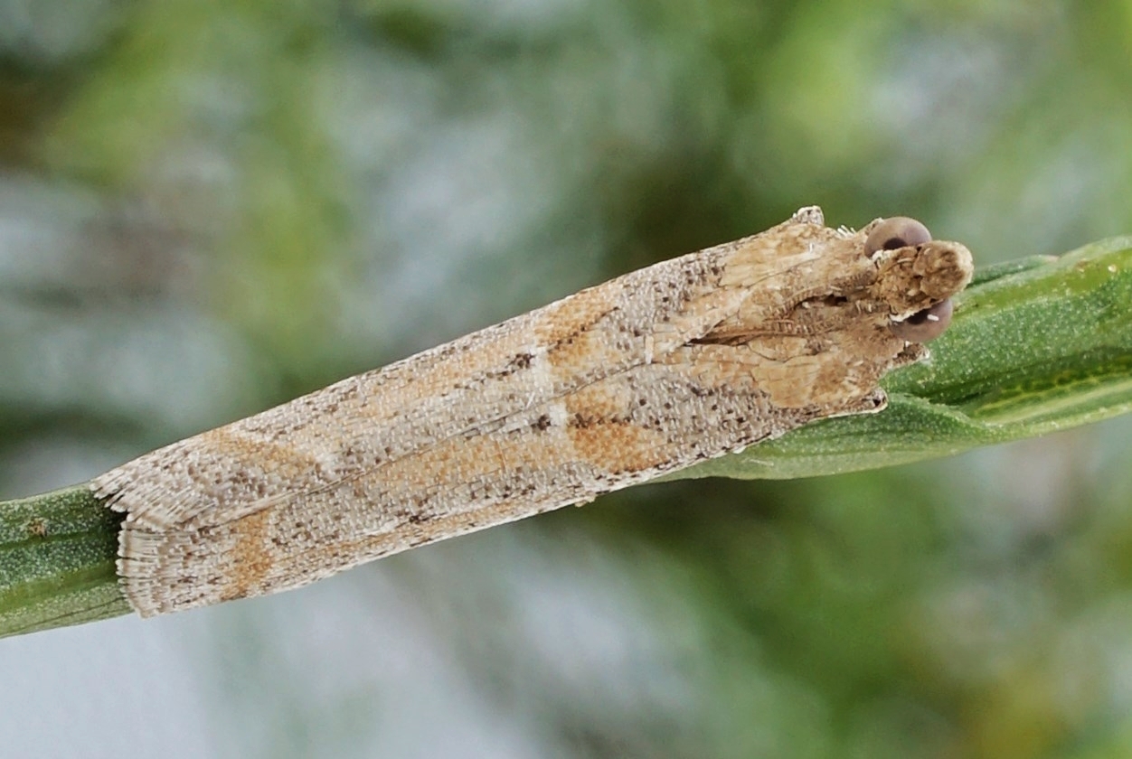 Gymnancyla canella Ende Juli 2017 in Küstennaher Vegetation bei La Frannqui in Südfrankreich am Licht. Foto vom folgenden Tag