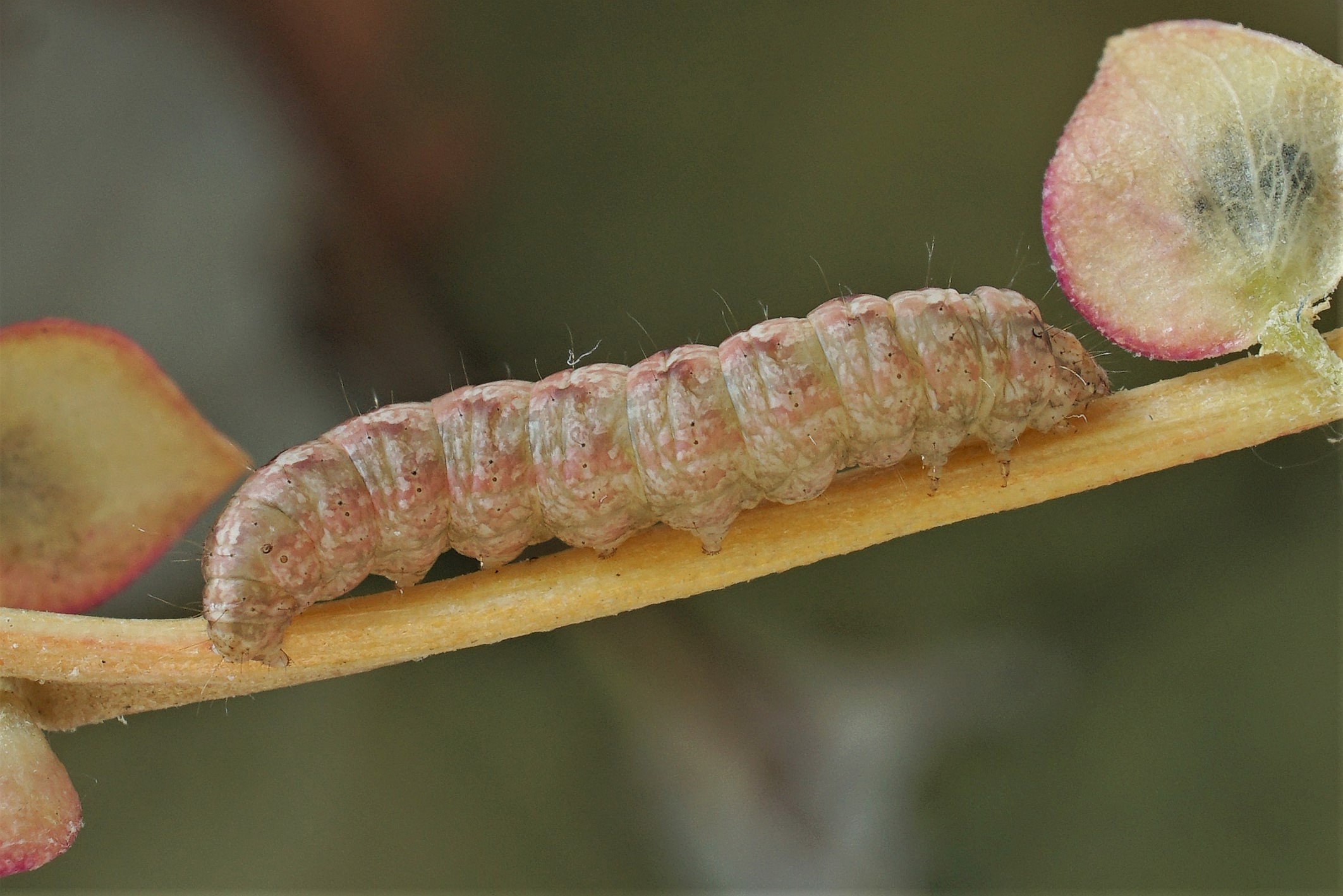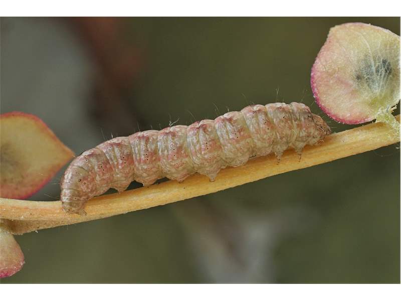 Vorderflügel hell(gelb)braun bis hellgrau, mit zahlreichen schwarzen Schuppen bestäubt, costal und subcostal leicht aufgehellt; auf 1/3 und 7/8 jeweils eine dünne cremefarbene Querlinie; innere Querlinie zum Basalfeld und äußere Querlinie zum Außenfeld hin jeweils breit rotbraun gesäumt; Mittelfeld bisweilen mit dunklem Saum entlang der Querlinien und mit zwei +/- deutlich ausgebildeten schwarzen Punkten in der Mitte; Außenfeld mit dunklem Schatten am Apex, wo die äußere Querlinie endet.
