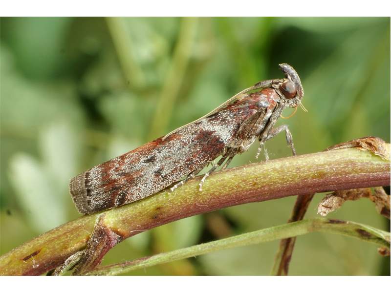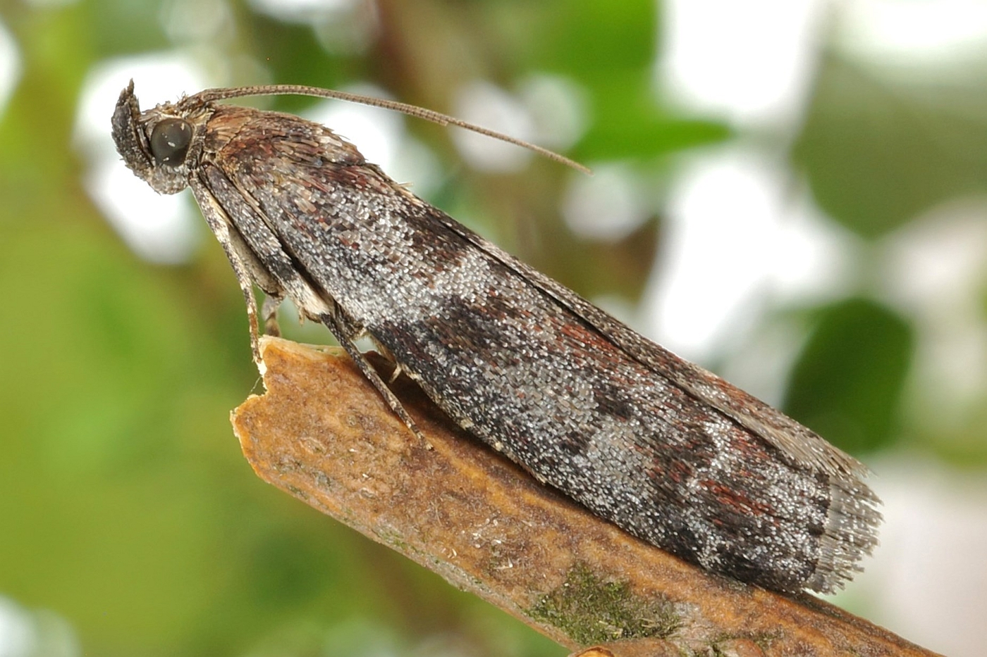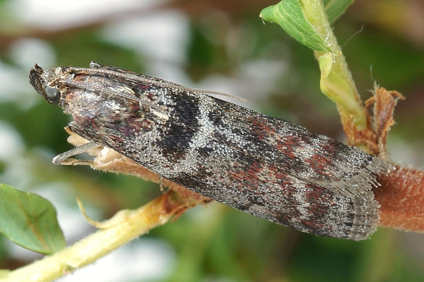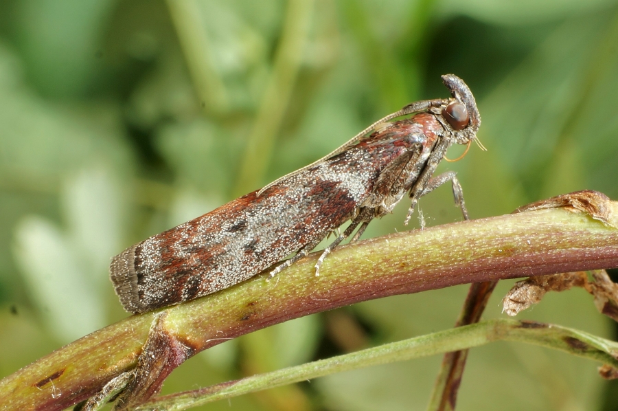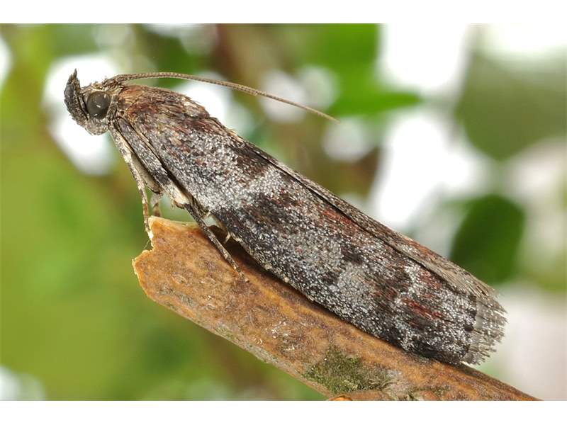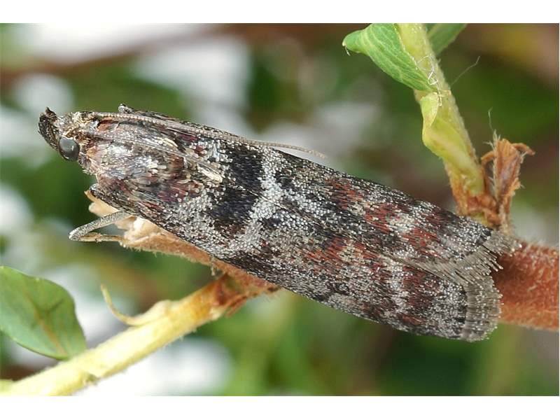 Vorderflügel X–Y mm lang; grau und rotbraun; bei 1/4 und 4/5 jeweils eine hellgraue Querlinie; Basalfeld basal rotbraun, am Flügelhinterrand angrenzend an die innere Querlinie dunkelgrau; Mittelfeld hellgrau, am Flügelhinterrand rotbraun, am Flügelvorderrand angrenzend an die innere Querlinie dunkelgrau oder dunkelbraun, bei 2/3 zwei schwarze Punkte, die äußere Querlinie rotbraun säumend; Außenfeld hellgrau, die äußere Querlinie rotbraun säumend.