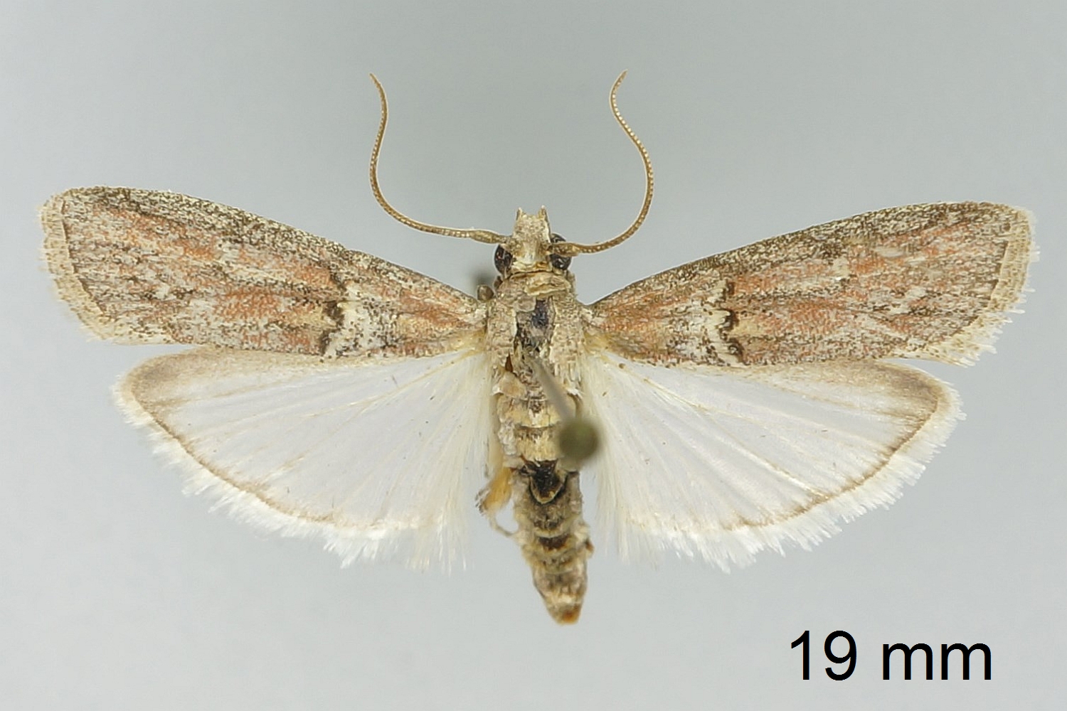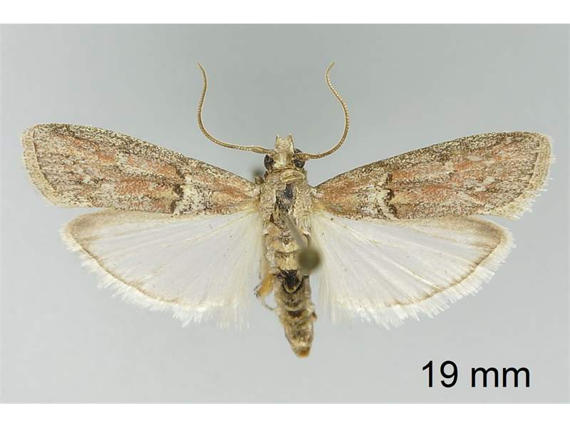 Vorderflügel X–Y mm lang; graubraun; bei 1/3 und 5/6 jeweils eine hellgraue Querlinie; innere Querlinie schwach gezackt, noch vor dem Flügelvorderrand endend, im Basalfeld dunkelgrau und im Mittelfeld schwarz gesäumt; äußere Querlinie stärker gezackt als innere Querlinie und beiderseits undeutlich dunkelbraun gesäumt; Basalfeld basal rotbraun, distal graubraun; Mittelfeld fleckig rotbraun mit undeutlichem schwarzem Diskalfleck.