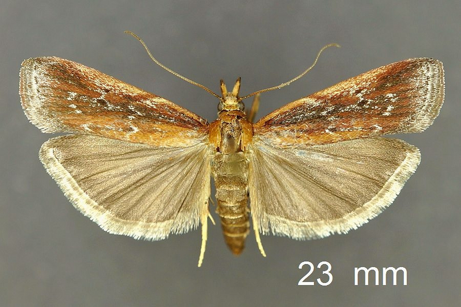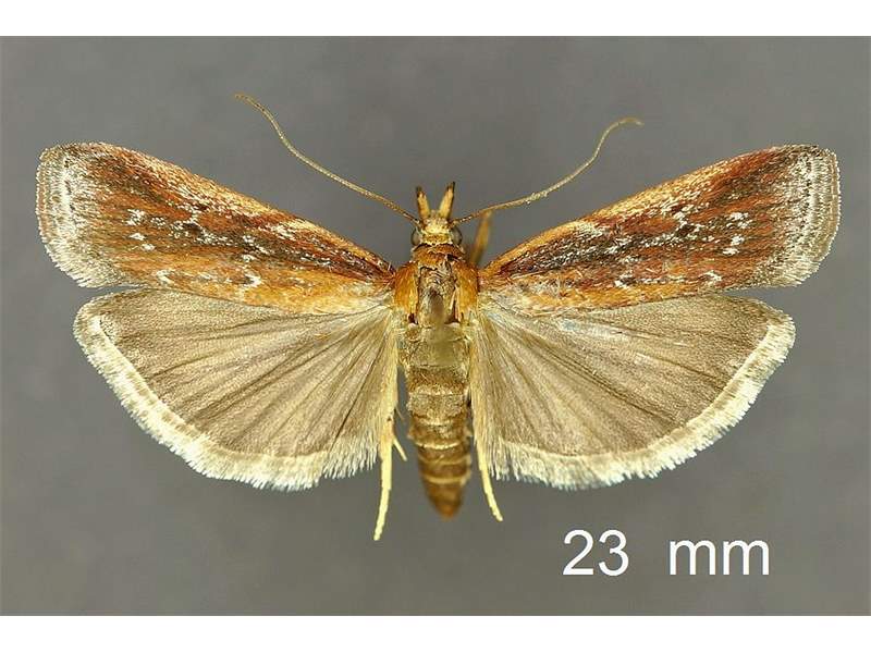 Vorderflügel hellbraun; bei 2/5 und 4/5 jeweils eine hellgraue, stellenweise unterbrochene Querlinie, die meist noch vor dem Flügelvorderrand enden; Basalfeld mit einzelnen eingestreuten hellgrauen Schuppen; von der Basis am Vorderrand bis über die gesamte Breite des Flügelaußenrandes ein unscharf begrenzter weinroter Keil, mit schwarzen Schuppen auf den Flügeladern; Mittelfeld mittig mit länglichem Feld aus hellgrauen Schuppen, in dem zwei undeutliche schwarze Punkte liegen; Flügelaußenrand schwarz und grau gescheckt.