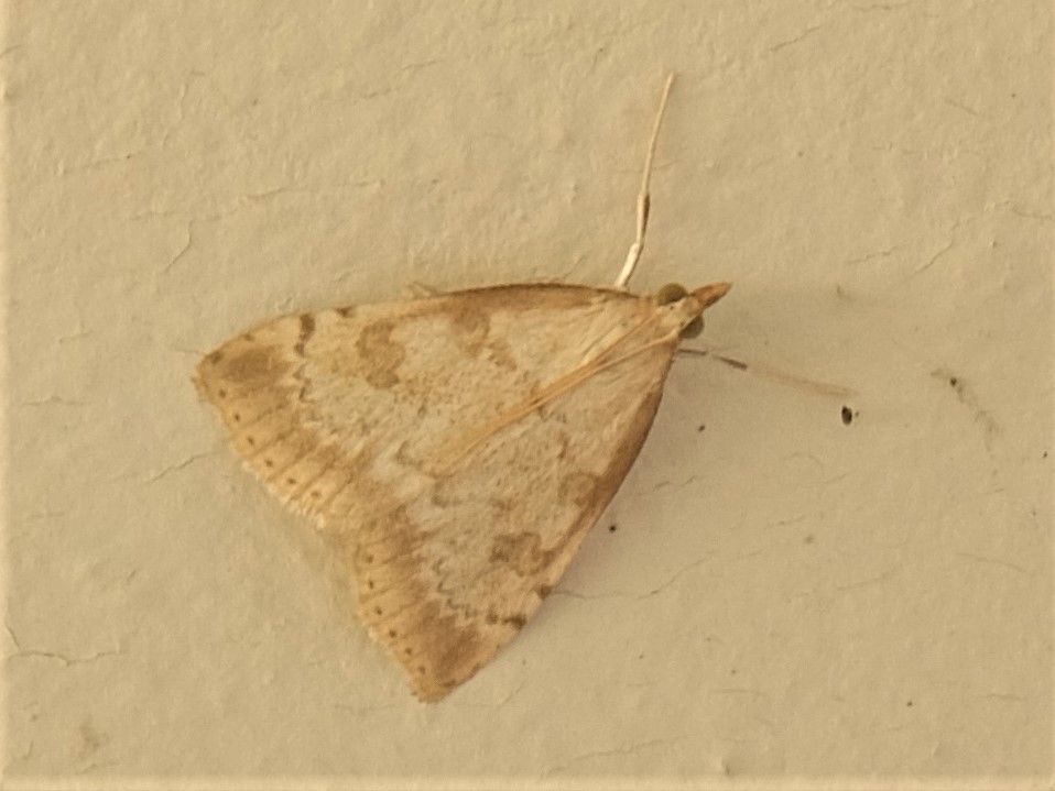 Vorderflügel cremefarben; bei 1/4 und 3/4 jeweils eine dünne hellbraune Querlinie; Mittelfeld mit großem, hellbraun gefülltem Punkt- und Nierenmakel; äußere Querlinie in der Nähe des Flügelhinterrandes deutlich Richtung Flügelbasis gezogen; Außenfeld mit hellbraunem Band zwischen äußerer Querlinie und Flügelaußenrand.