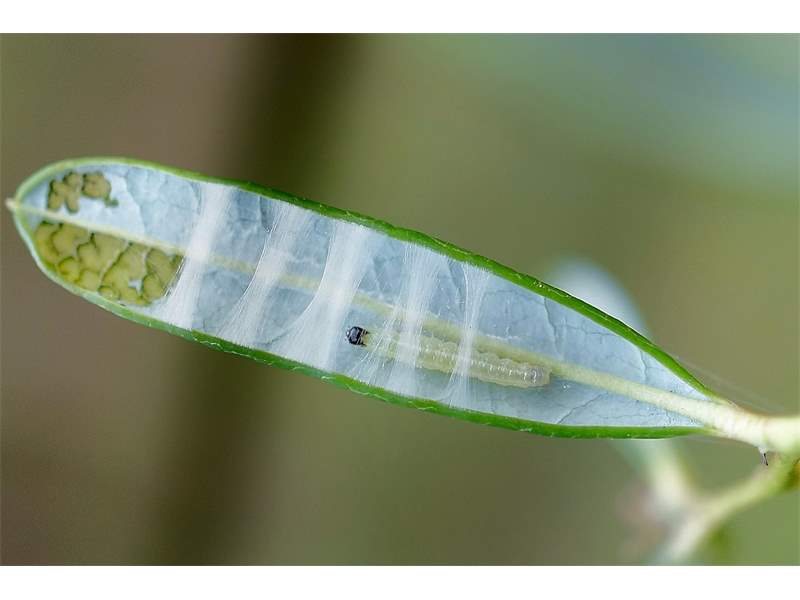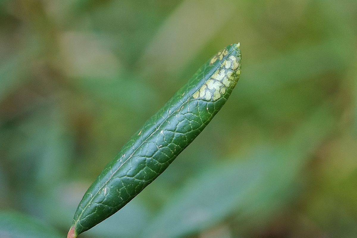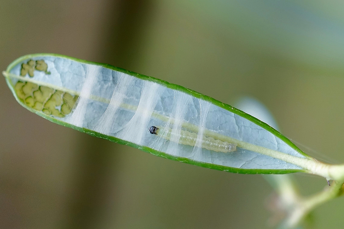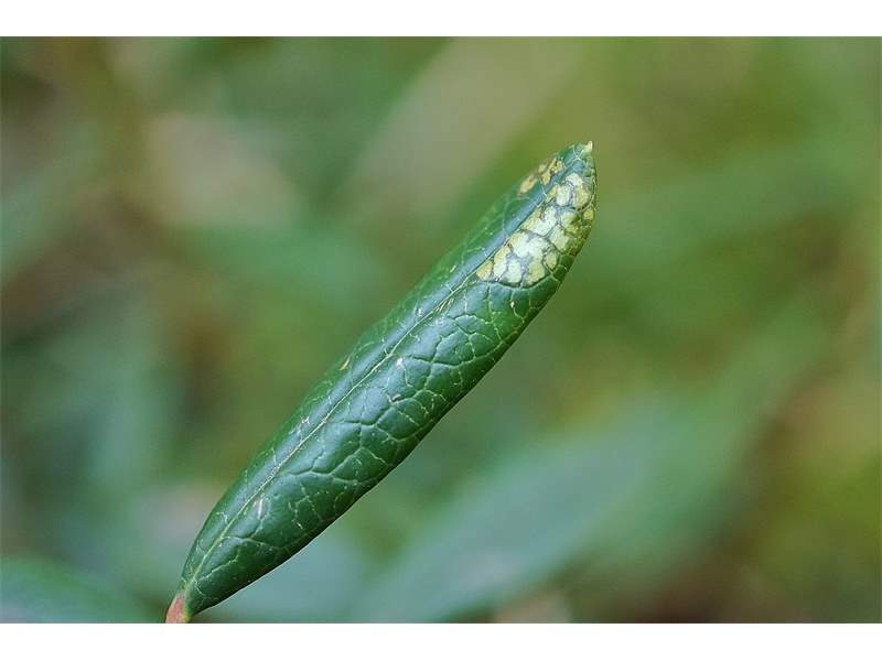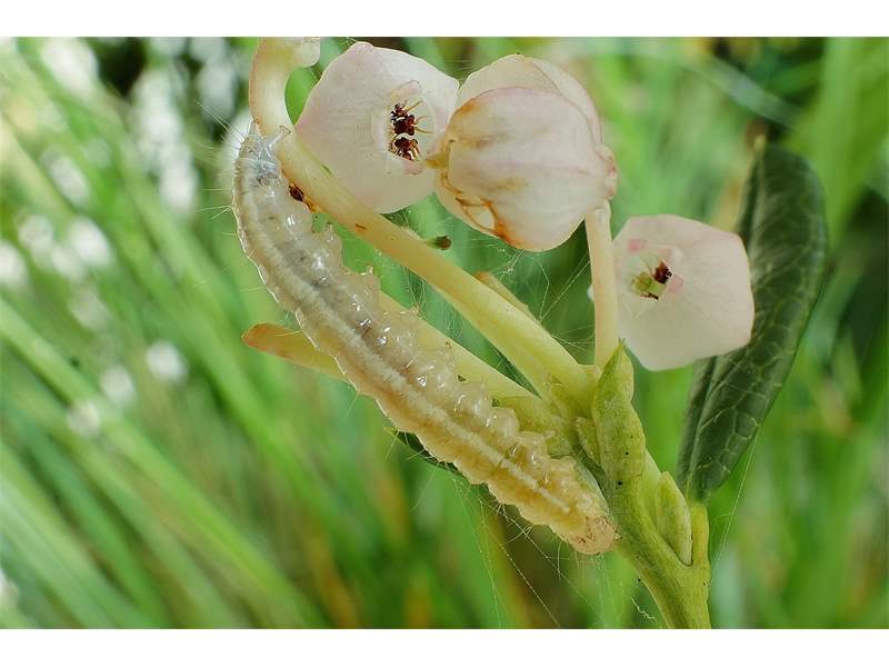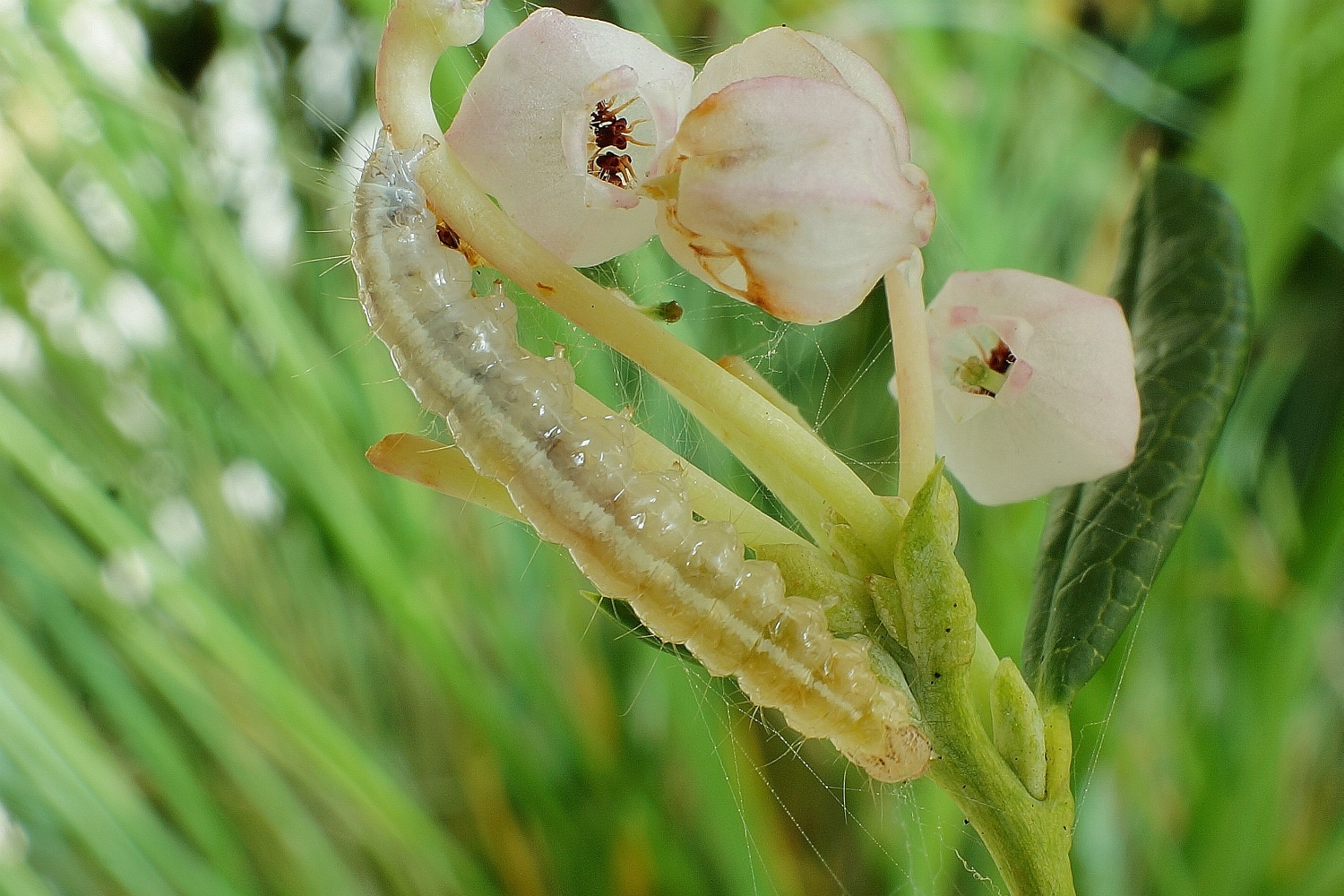 Udea prunalis-Zucht. Larvenfund am 21. April 2014 an Rosmarinheide bei Kreba-Neudorf. Befallssymptom an Rosmarinheide (Andromeda polifolia)