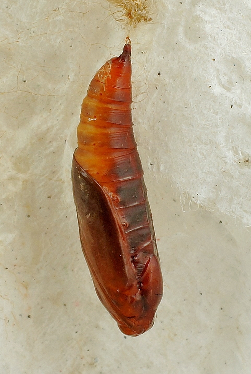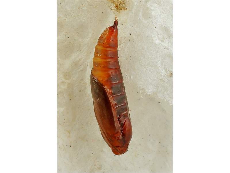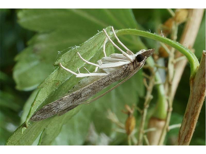 Udea prunalis-Zucht. Larvenfund am 21. April 2014 an Rosmarinheide bei Kreba-Neudorf. Falter am 25. Mai 2014 geschlüpft