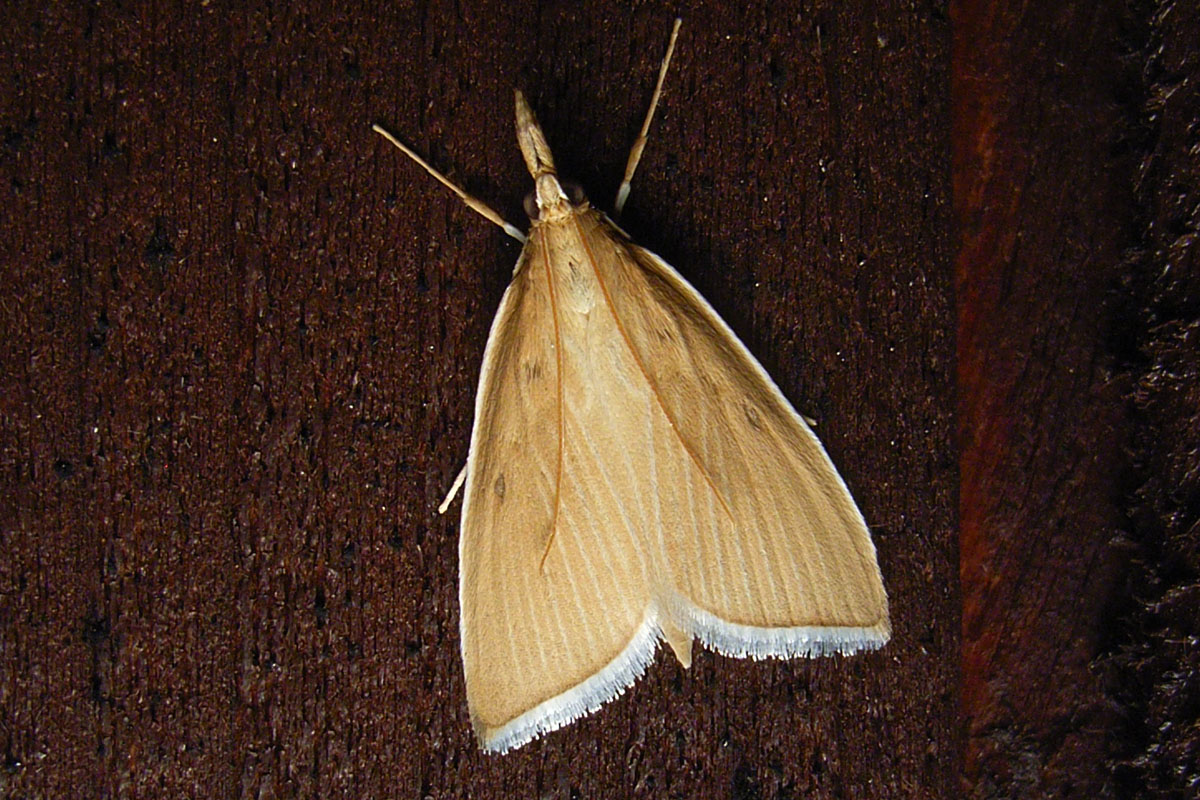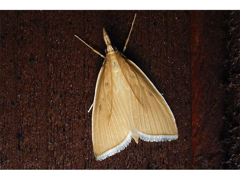 Vorderflügel hellbraun, Vorderand (Costa) schmal weiß gerandet, Makeln unscheinbar als kleine dunkle Depressionen sichtbar, Flügeladern vor allem in der hinteren Flügelhälfte hell oder weiß beschuppt; Apex deutlich spitzwinklig, Flügelaußenrand etwas verdunkelt, Fransensaum weiß.