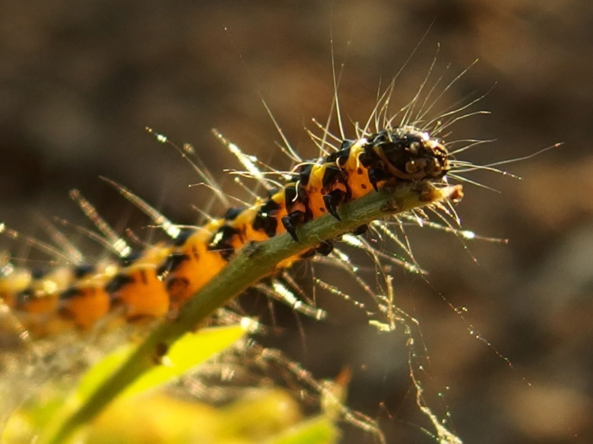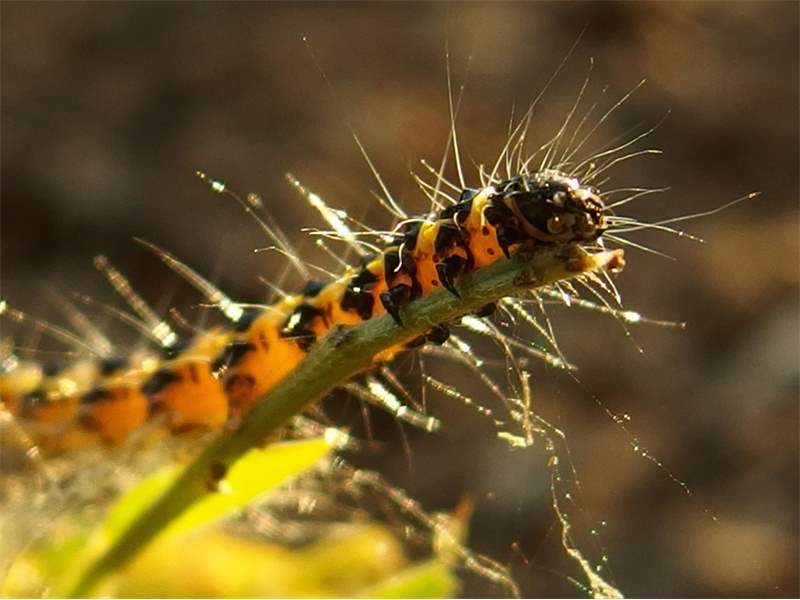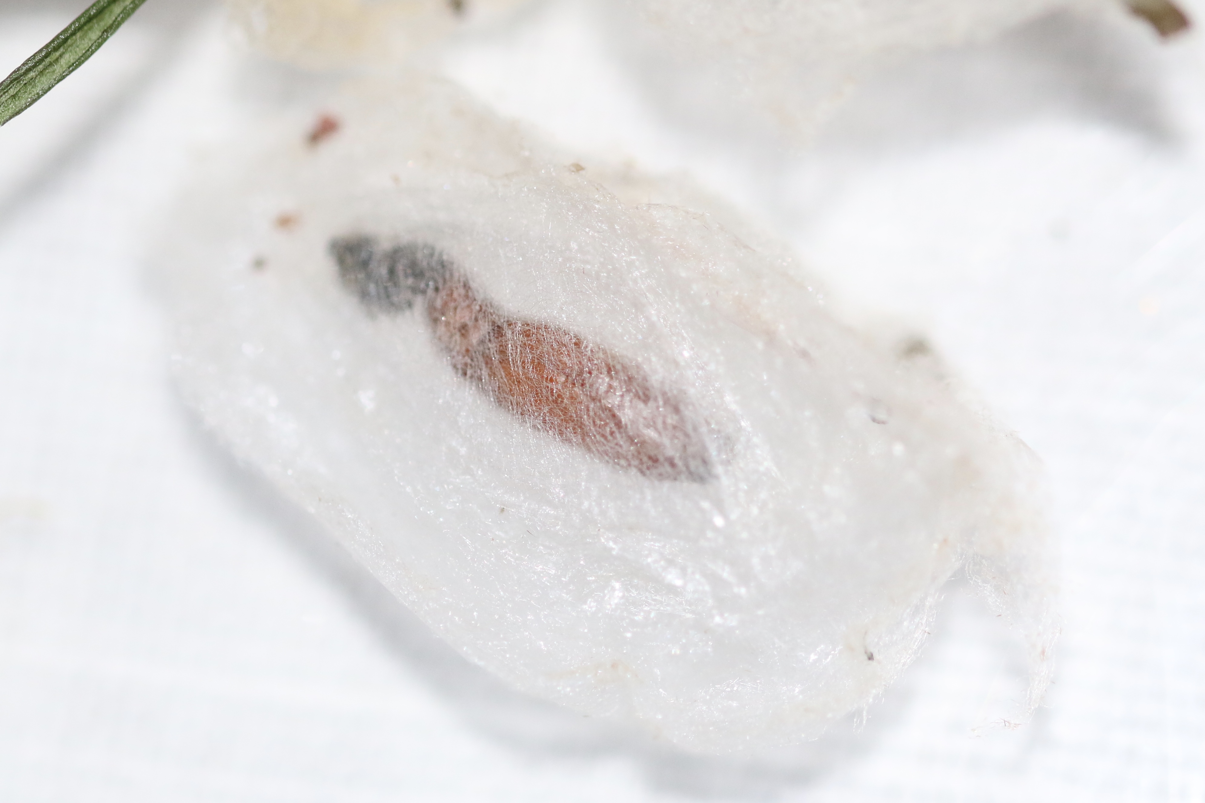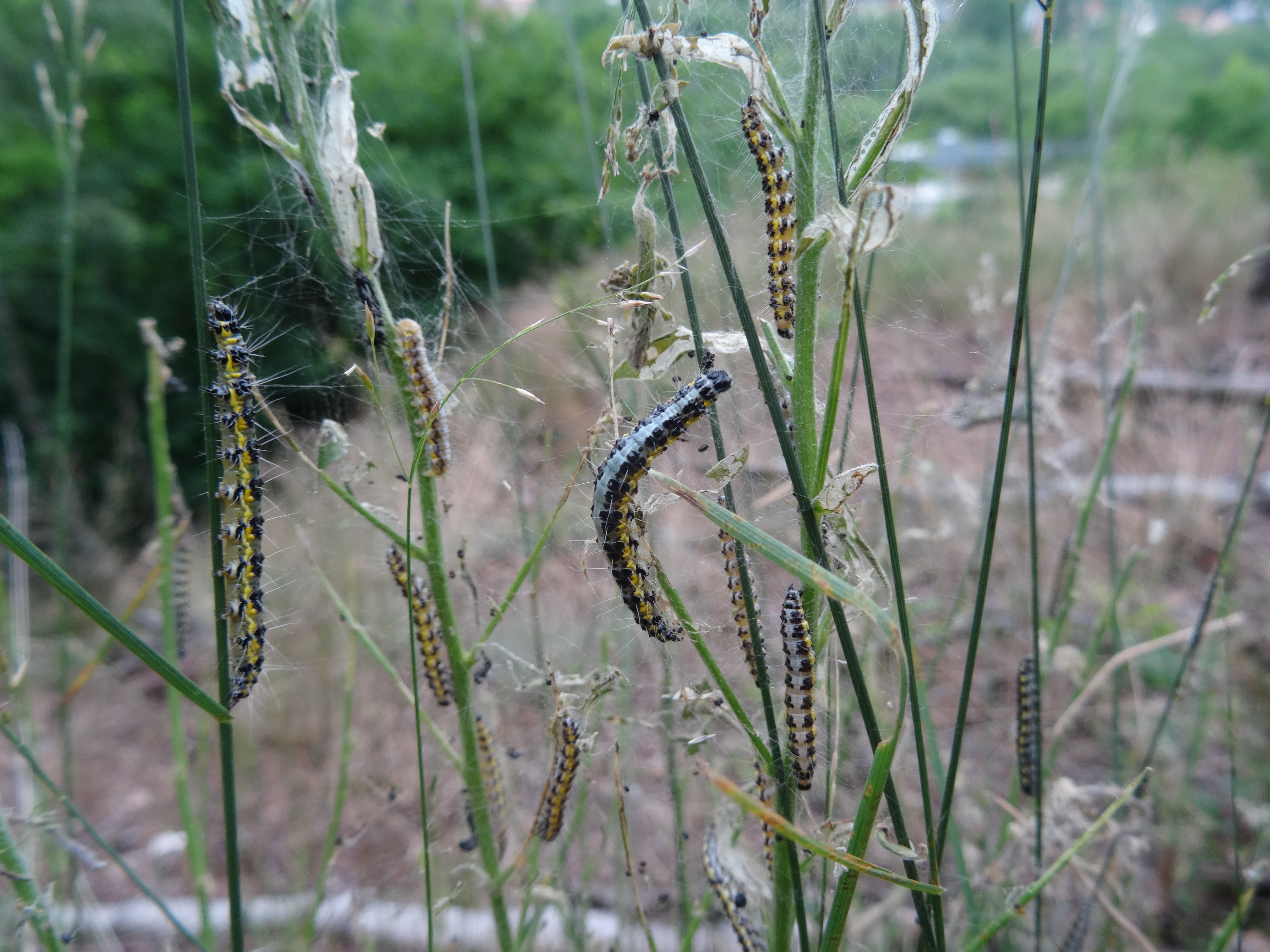 Die Larven fressen an Hülsenfrüchtlern (Fabaceae), welche Chinolizidin-Alkaloide enthalten (Leen 1997). In Europa nachgewiesen von Färber-Ginster (Genista tinctoria), Besenginster (Sarothamnus scoparius), Geißklee (Cytisus) und Stechginster (Ulex) (Genisteae) sowie neuweltlichen Bohnen (Phaseolus) (Hasenfuß 1960). Auf dem Hawaii Archipel an Koa-Akazie (Acacia koa) und Mamane-Baum (Sophora chrysophylla) (Zimmerman 1958) sowie in Neuseeland an Carmichaelia, Schnurbaum (Sophora tetraptera), Besenginster (Cytisus scoparius), Weißklee (Trifolium repens) und Lupine (Lupinus) (Clarke 1971; Leen 1997). Die Larven fressen an Blüten und Blättern, überziehen die Nahrungspflanzen mit Seidenfäden, treten zuweilen in großer Anzahl auf und verursachen dann Kahlfraß. Die Verpuppung erfolgt in einem weißen Seidenkokon.