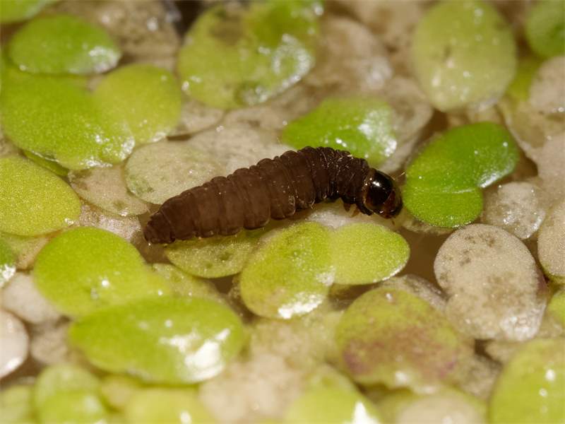 Unmittelbar nach der Kopulation, die an Röhrichthalmen stattfindet, legen die Weibchen die Eier an die Unterseite der Sprosse schwimmender Vielwurzeliger Teichlinse (Spirodela polyrrhiza) (92,6%) und Dreifurchiger Wasserlinse (Lemna trisulca) (7,4%) (Petrischak 2000). Wasserlinsen (Lemnoideae (Araceae): Lemna spp. – Name!) stellen die wichtigsten Larvennahrungspflanzen in unserer Natur. Nach der Überwinterung ist zunächst Lemna trisulca die wichtigste Nahrungsquelle, weil Spirodela polyrrhiza in Form von stärkereichen Ruhesprossen am Gewässerboden überwintert und erste Sprosse erst ab Anfang Mai an der Wasseroberfläche erscheinen; sie ist im weiteren Jahresverlauf aber die überwiegend genutzte Wasserlinse (Petrischak 2000).