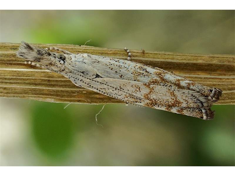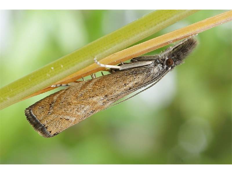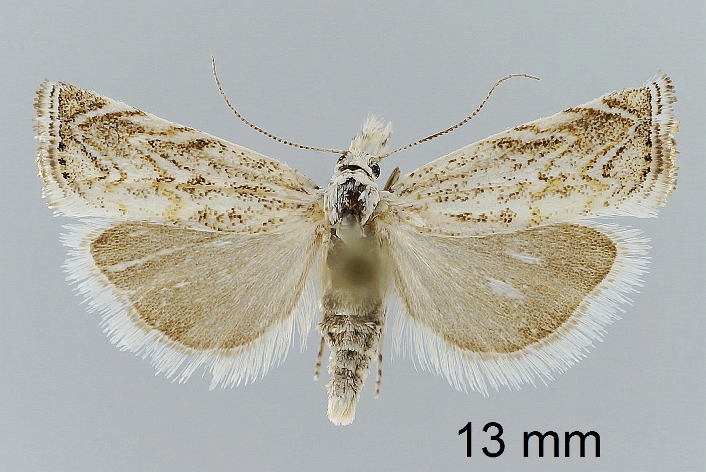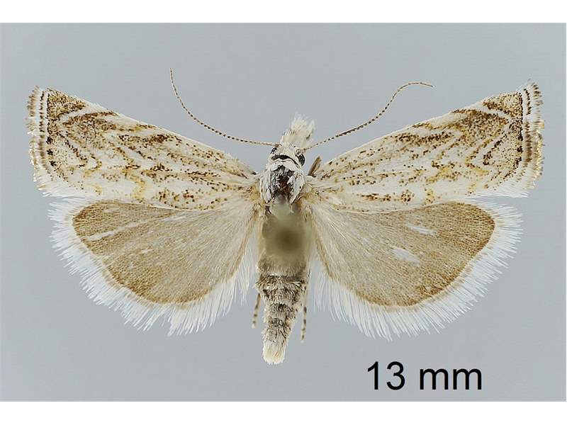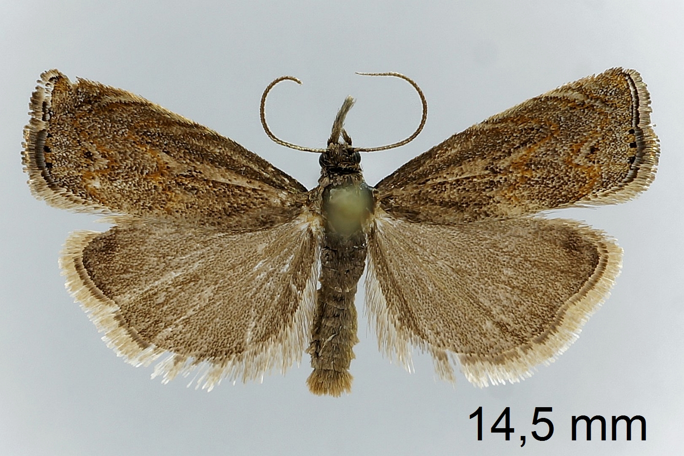 Vorderflügel X–Y mm lang; braun, bisweilen auch cremeweiß; bei 3/5 und 4/5 jeweils eine (sich oft von der Grundfarbe nicht abhebende) braune oder cremeweiße Querlinie, die rot- oder gelbbraun gesäumt ist; innere Querlinie mit nur einer spitzen Ausbuchtung Richtung Flügelaußenrand; äußere Querlinie mit einer großen und einer kleinen spitzen Ausbuchtung Richtung Flügelaußenrand (die großen Spitzen beider Querlinien verlaufen auffallend parallel); drei schwarze Marginalflecken in der hinteren Flügelhälfte; distale Lage des Fransensaums braun, proximale Lage dunkelgraubraun (Fransensaum bei cremeweißen Exemplaren cremeweiß, Schuppen apikal dunkelbraun).