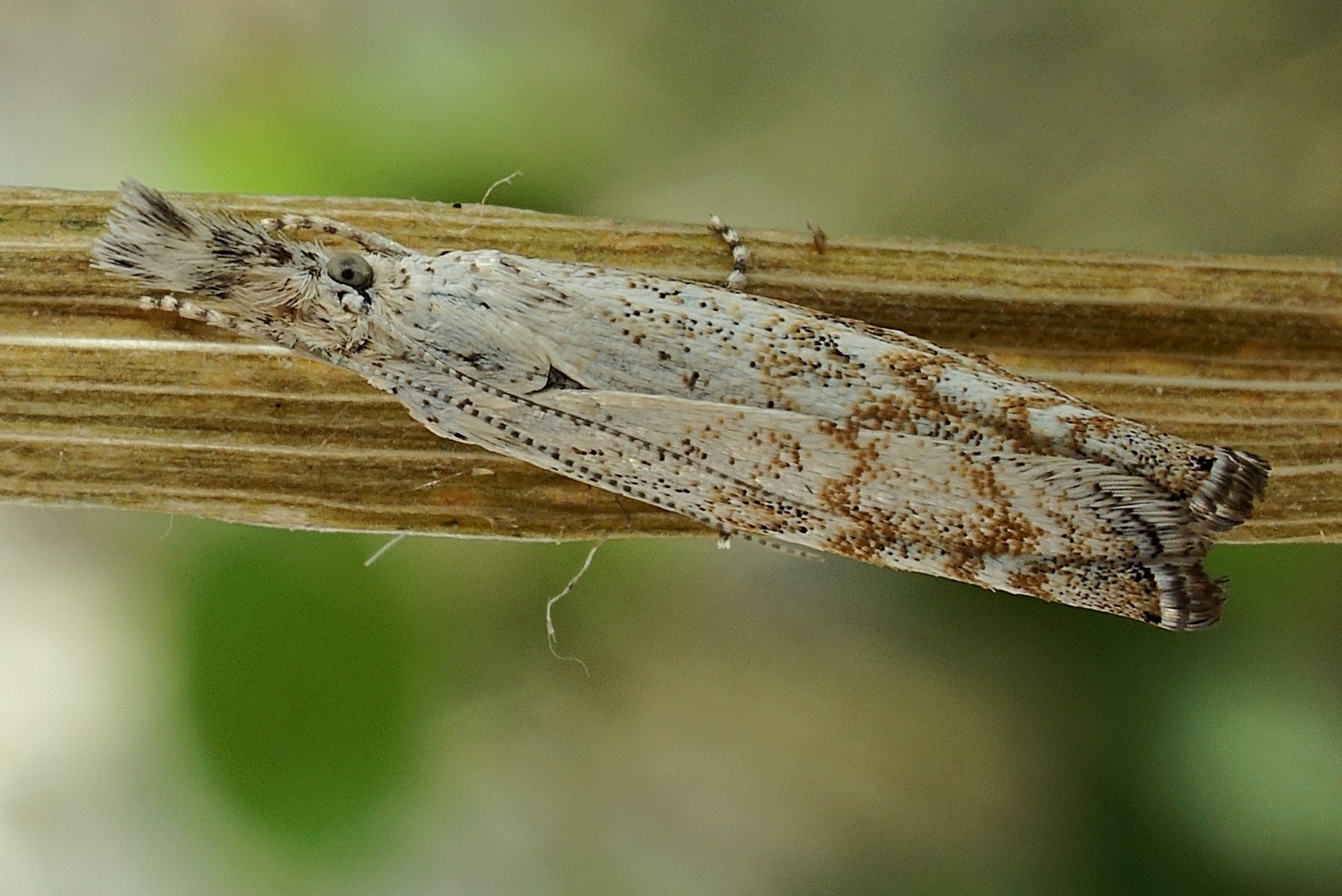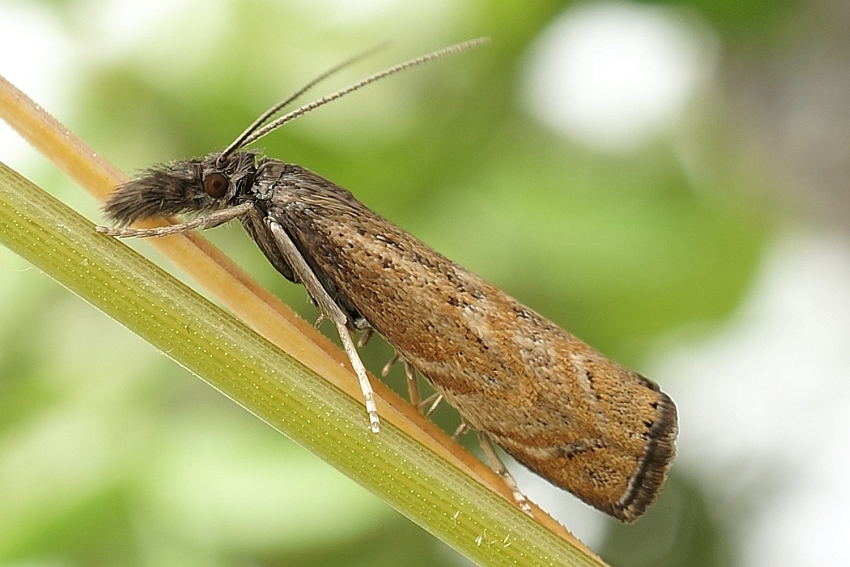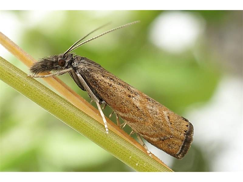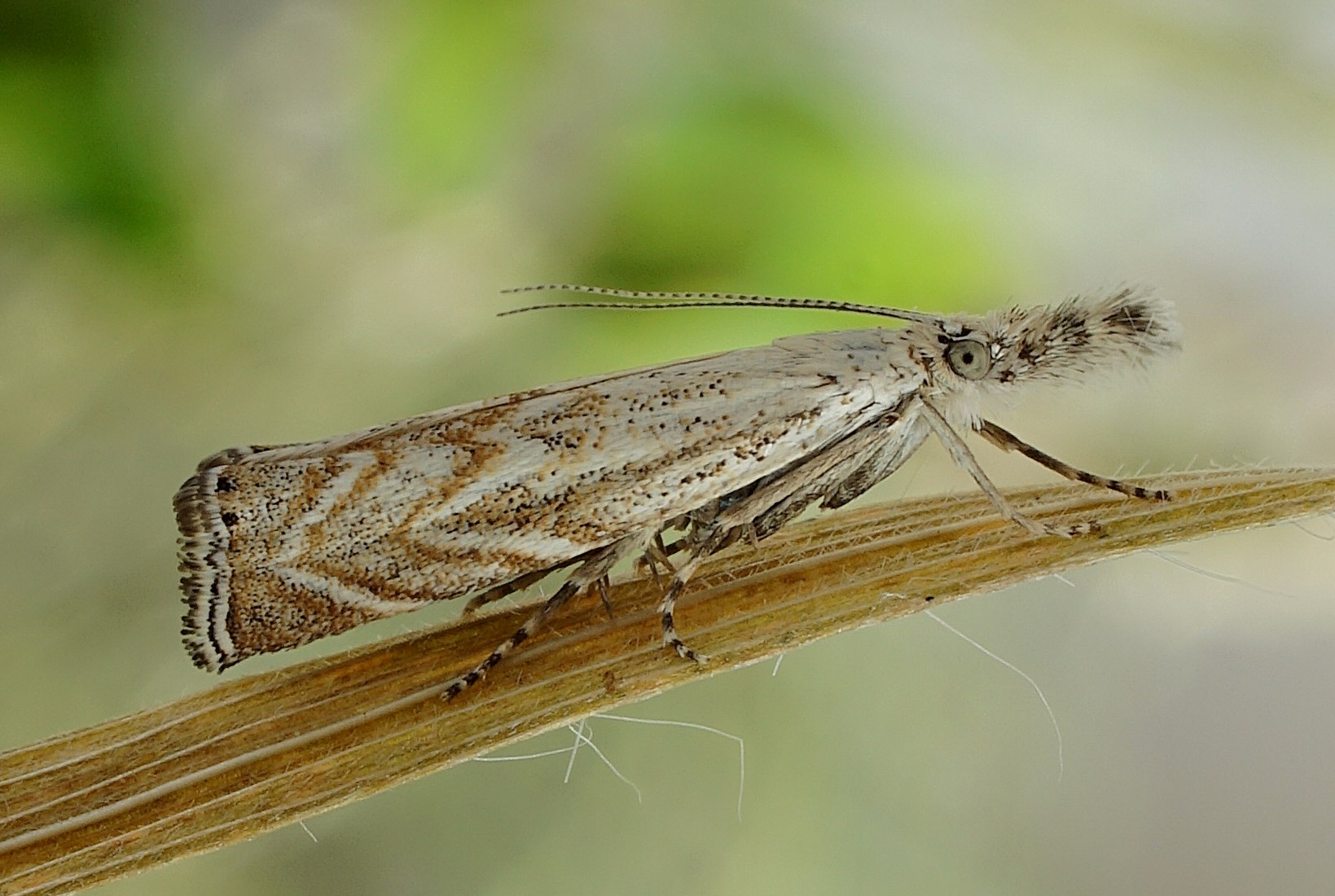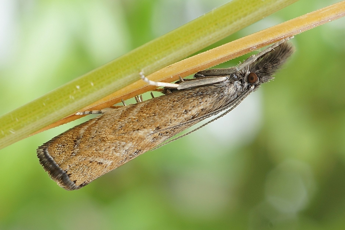 Vorderflügel X–Y mm lang; braun, bisweilen auch cremeweiß; bei 3/5 und 4/5 jeweils eine (sich oft von der Grundfarbe nicht abhebende) braune oder cremeweiße Querlinie, die rot- oder gelbbraun gesäumt ist; innere Querlinie mit nur einer spitzen Ausbuchtung Richtung Flügelaußenrand; äußere Querlinie mit einer großen und einer kleinen spitzen Ausbuchtung Richtung Flügelaußenrand (die großen Spitzen beider Querlinien verlaufen auffallend parallel); drei schwarze Marginalflecken in der hinteren Flügelhälfte; distale Lage des Fransensaums braun, proximale Lage dunkelgraubraun (Fransensaum bei cremeweißen Exemplaren cremeweiß, Schuppen apikal dunkelbraun).