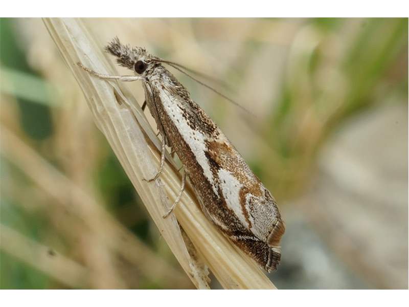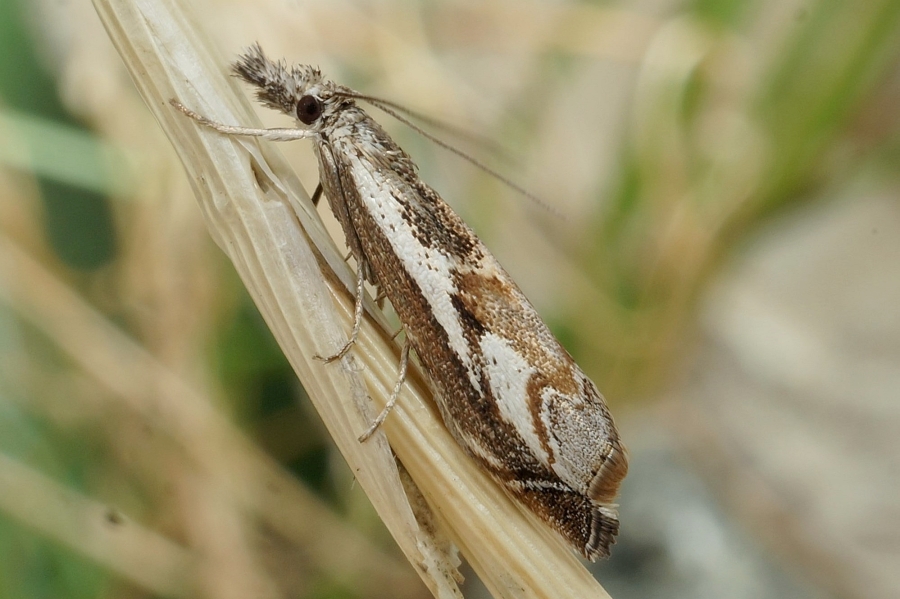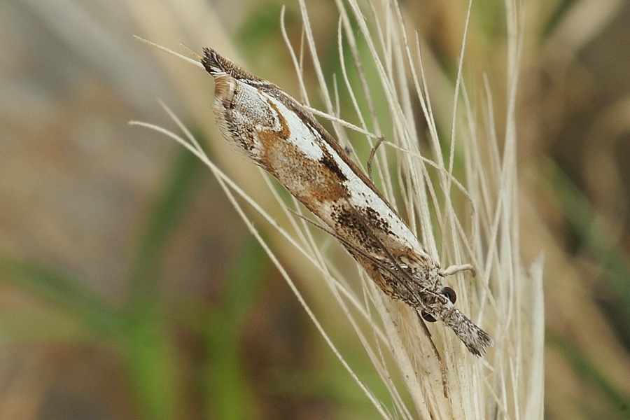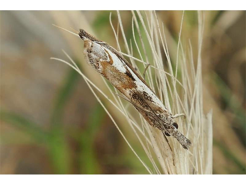 weißer Medianstreifen von der Basis bis 4/5, der bei 3/5 und 4/5 von zwei doppelt gezackten, cremeweißen Querlinien unterbrochen ist; Querlinien im Mittelfeld gelbbraun gesäumt; hintere Flügelhälfte im Basalfeld schütter braun, im Mittelfeld hell gelbbraun und im Außenfeld (hell)graubraun gefärbt; Marginalflecken schwarz, in der vorderen Flügelhälfte zu einer Linie verbunden;