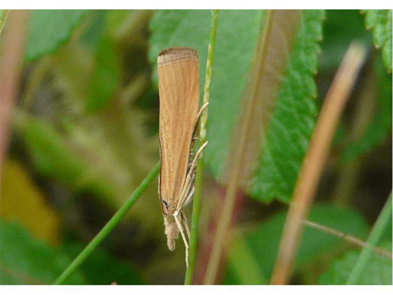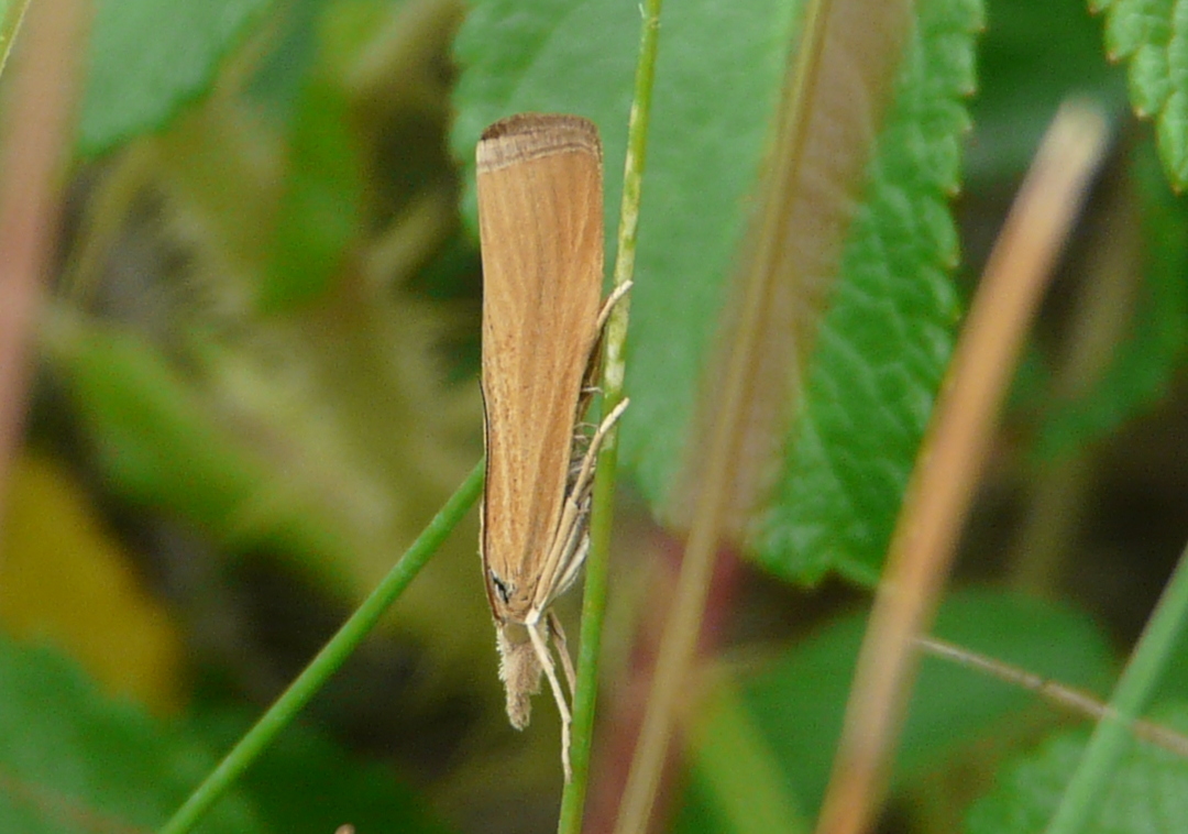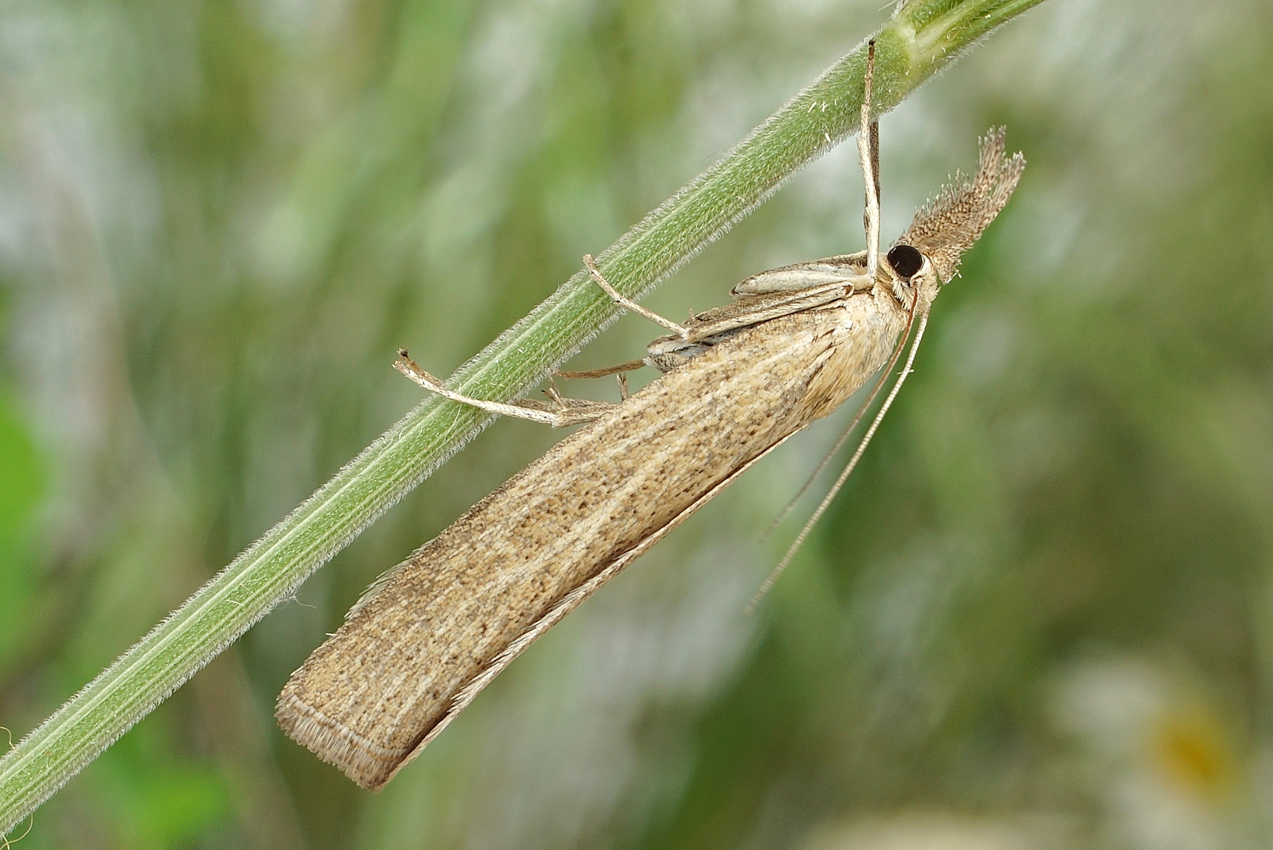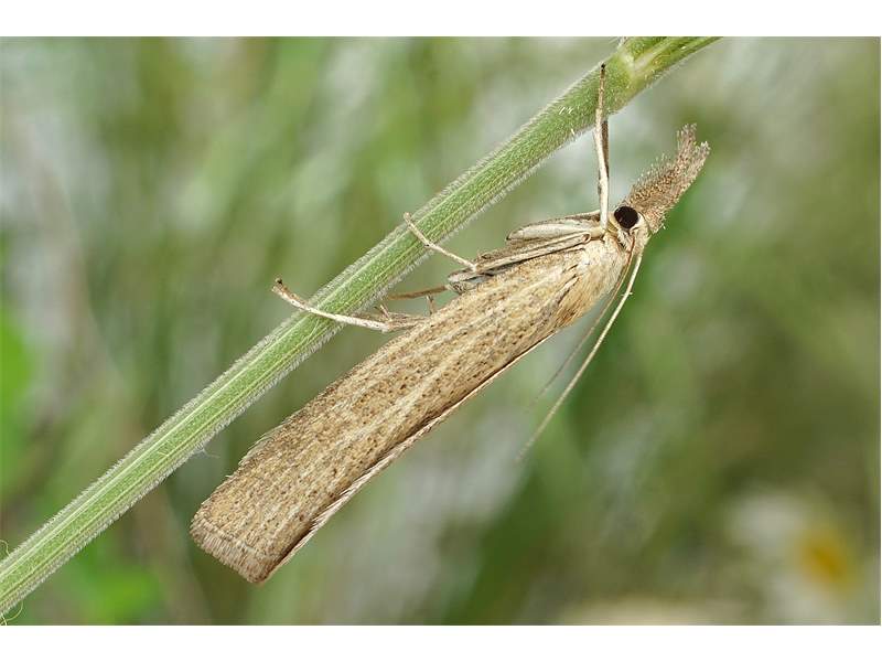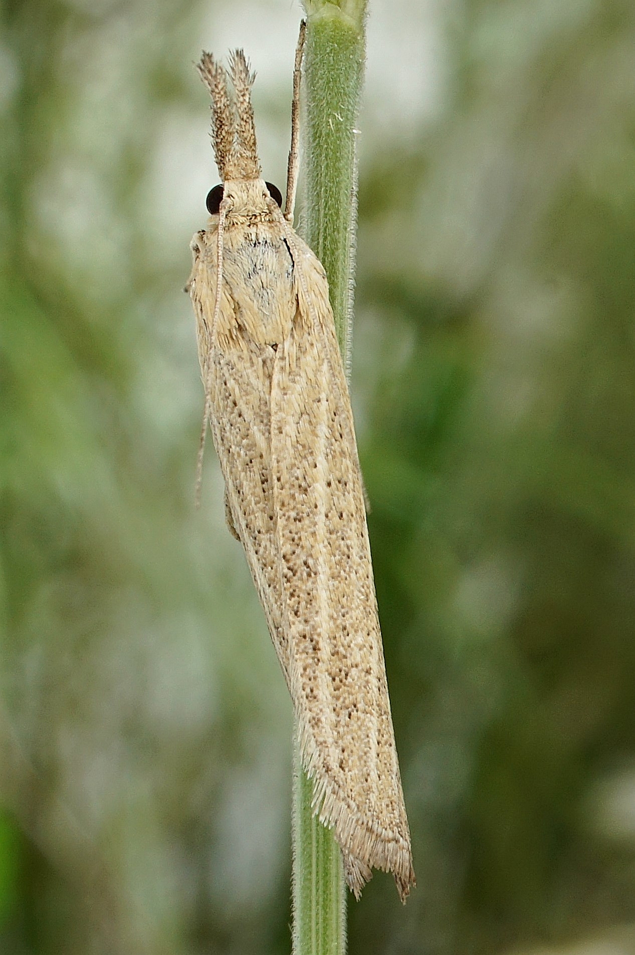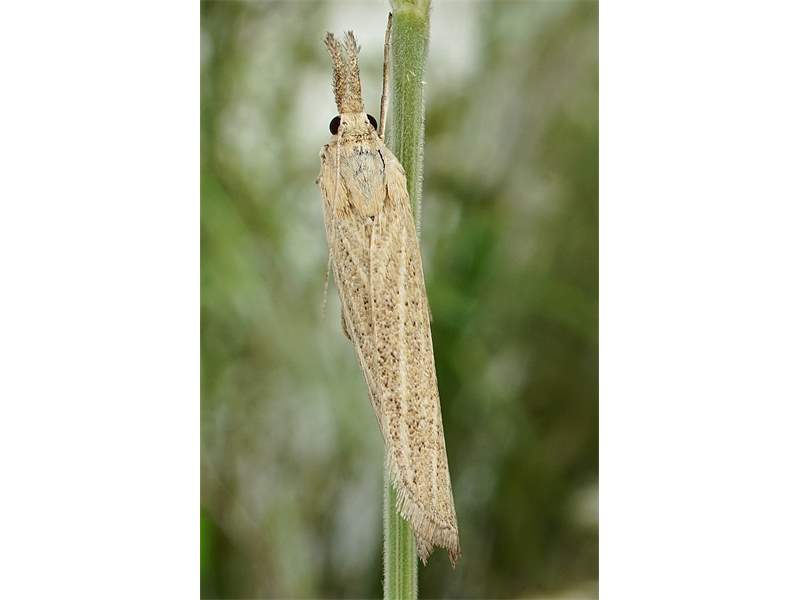 Vorderflügel X–Y mm lang; variabel gelblichbraun, hell rörtichbraun oder graubraun; Bereiche zwischen Flügeladern etwas dunkler, meistens mit variabler Anzahl eingestreuter schwarzbrauner Schuppen (vor allem in der hinteren Flügelhälfte); keine Marginalflecken. Antennen oberseits schmutzig weiß oder hellbraun beschuppt.