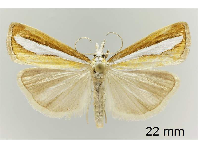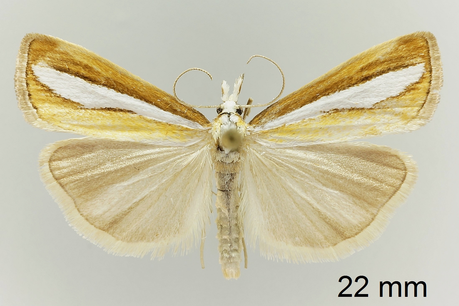 Vorderflügel X–Y mm lang; hell rotbraun oder gelbbraun; breiter weißer, längsverlaufender Medianstreifen von der Basis bis zum Flügelaußenrand, der sich distal verbreitert und häufig dunkelbraun gesäumt ist; Medianstreifen in der distalen Flügelhälfte mit einem kleinen, +/- deutlich ausgeprägten Zahn am Hinterrand; Marginalflecken schwarz; Fransensaum einheitlich hellgraubraun.