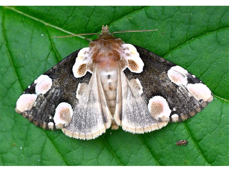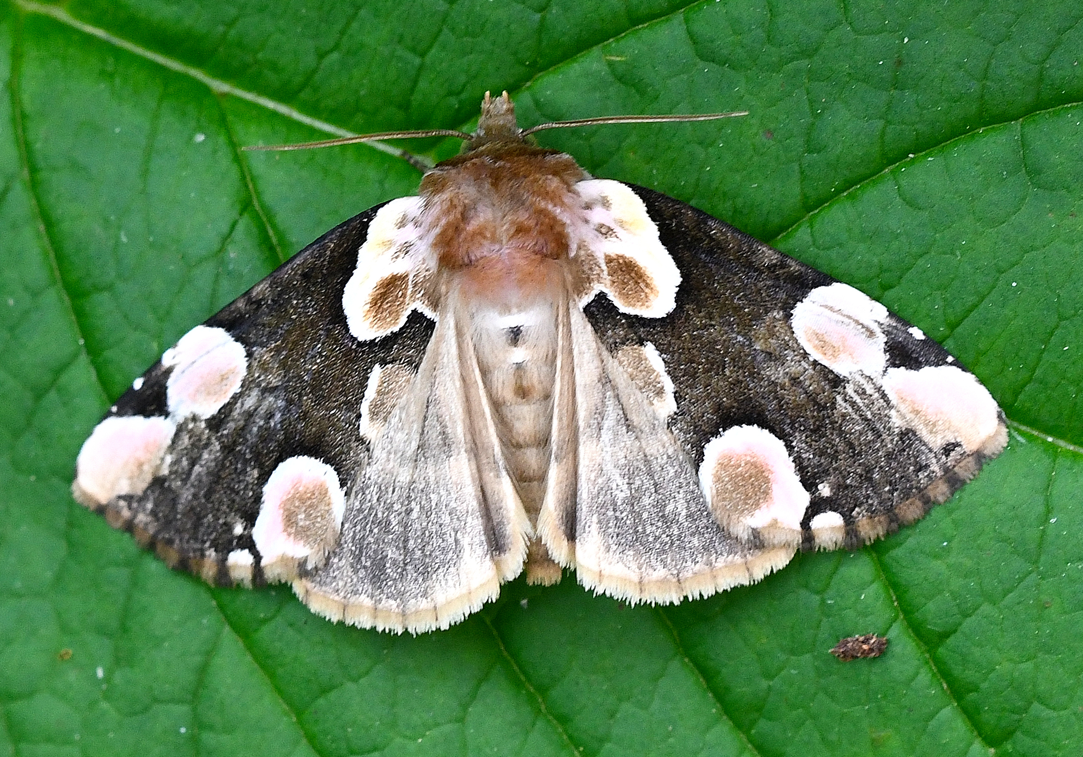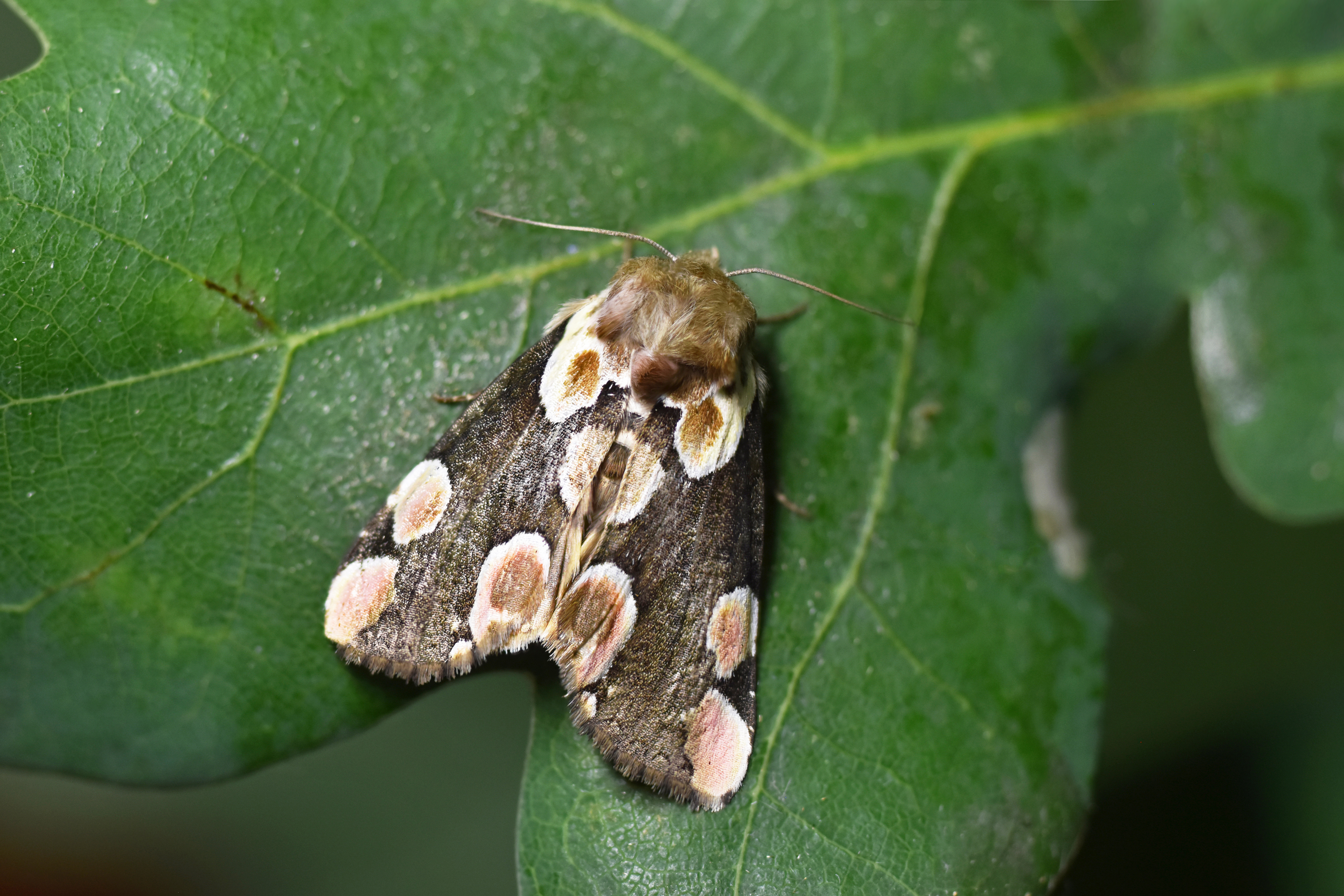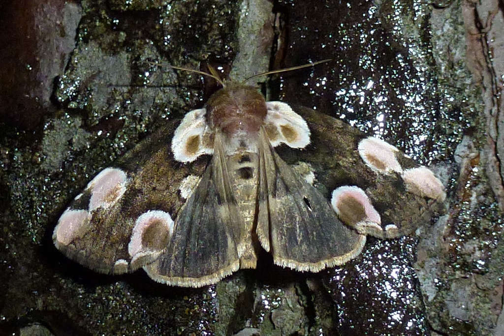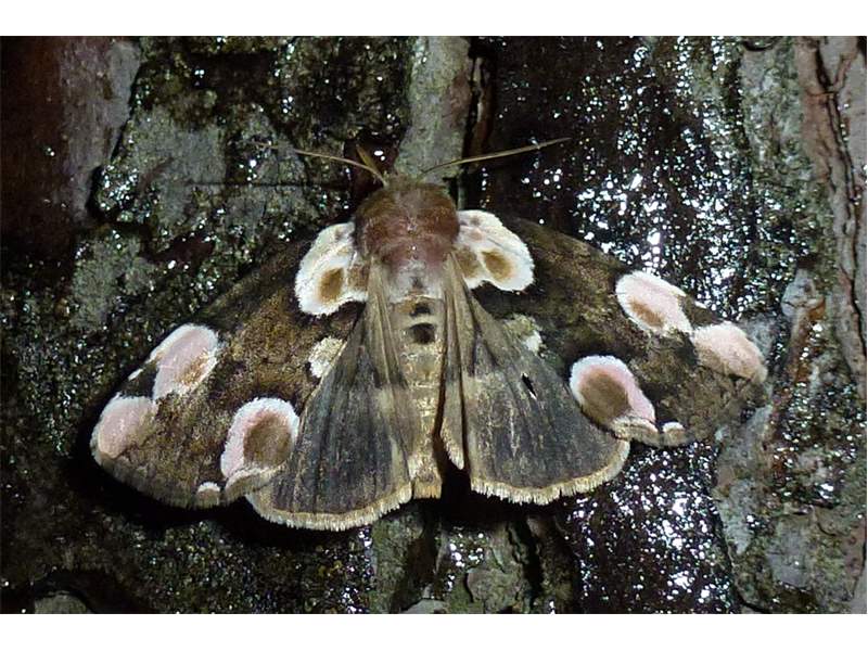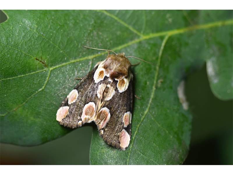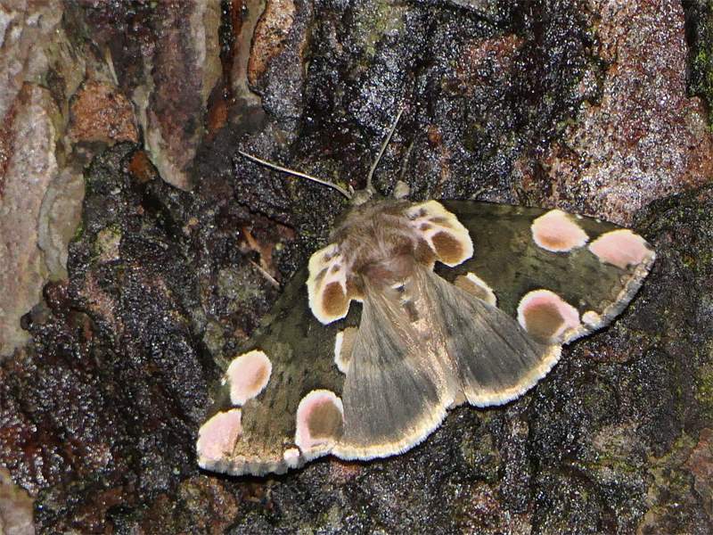 Vorderflügeloberseite: Grundfarbe grau bis graugrün, mit in der Regel fünf rosa bis rosefarbenen Flecken.