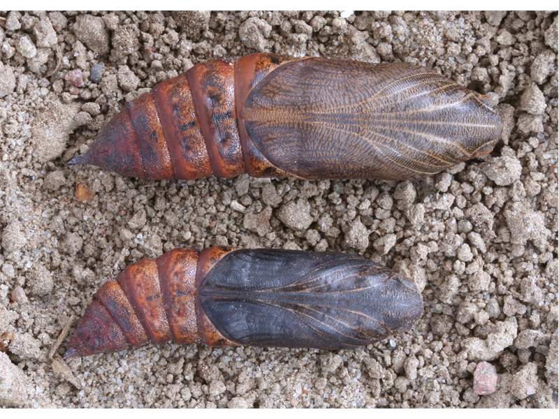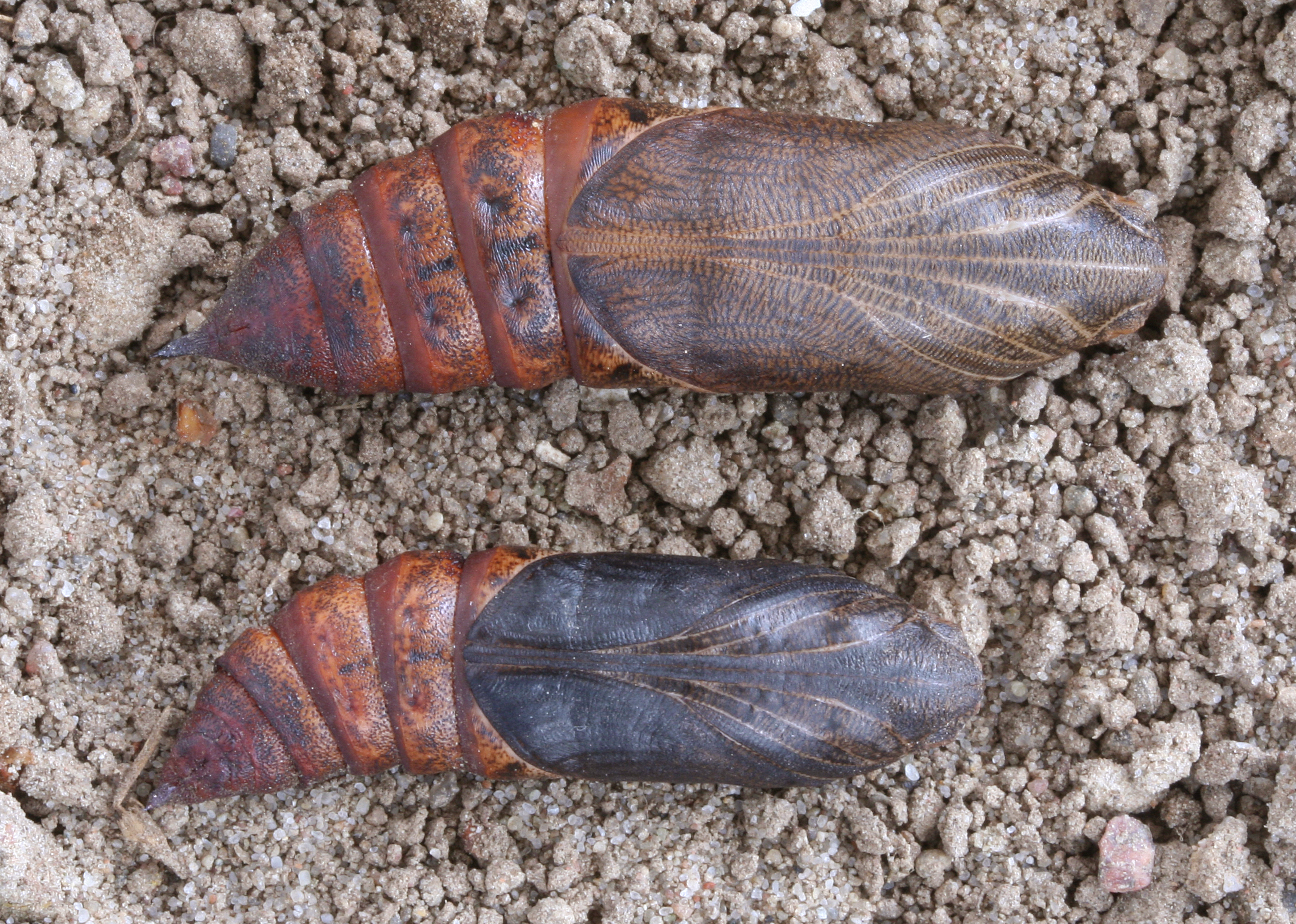 Weibliche Puppe (oben; Raupe gefunden am 24.09.2006, Dresden-Johannstadt) und männliche Puppe (unten; Raupe gefunden am 01.10.2006, Dresden-Johannstadt)