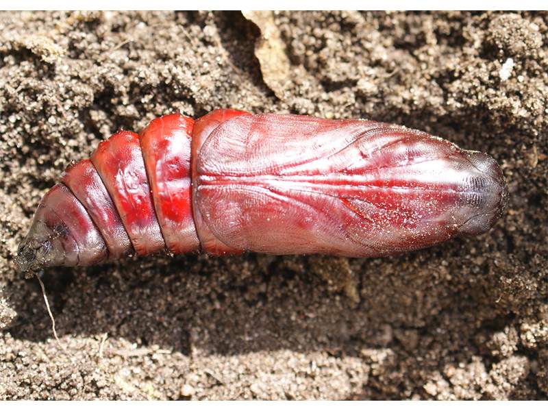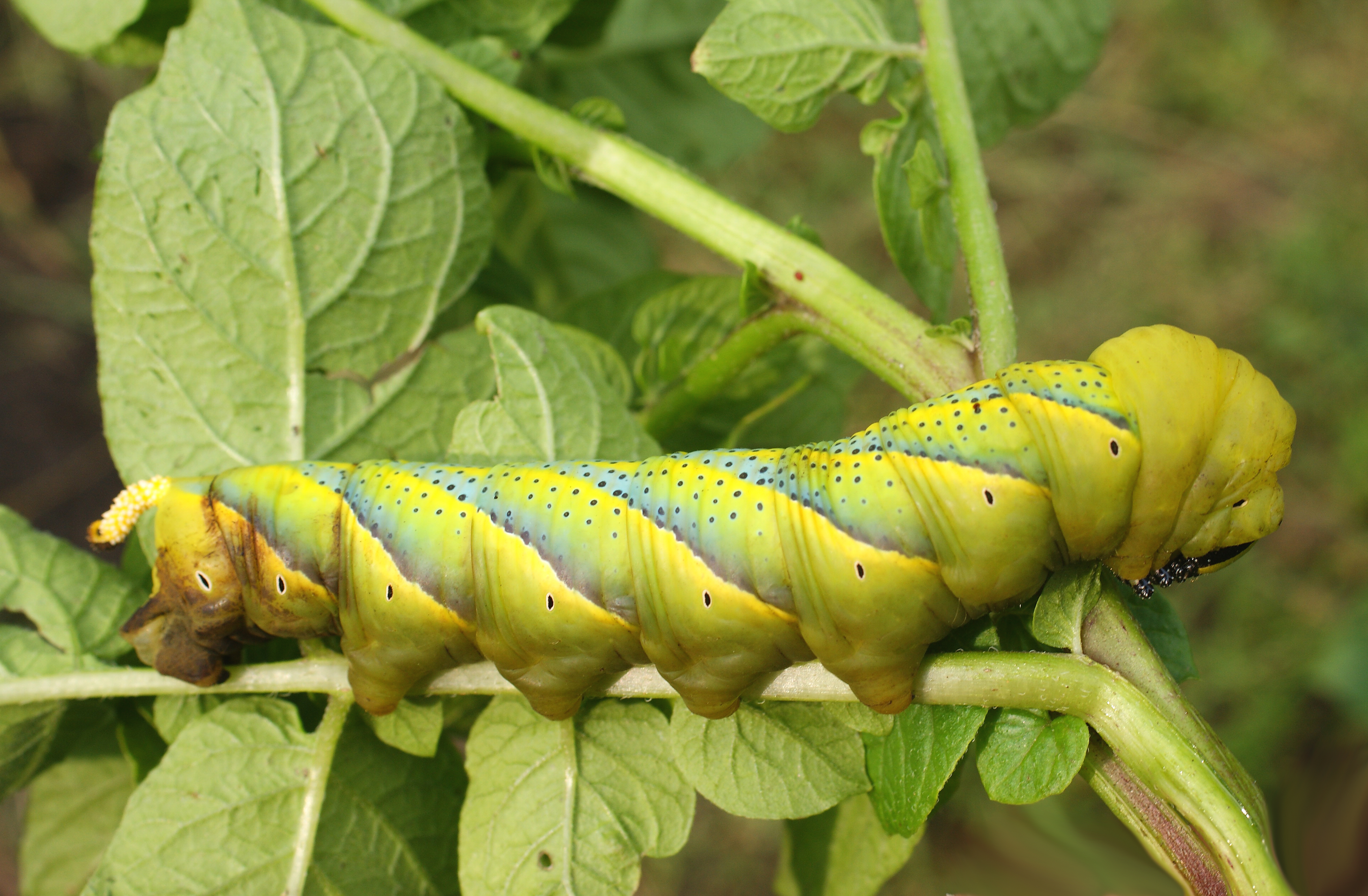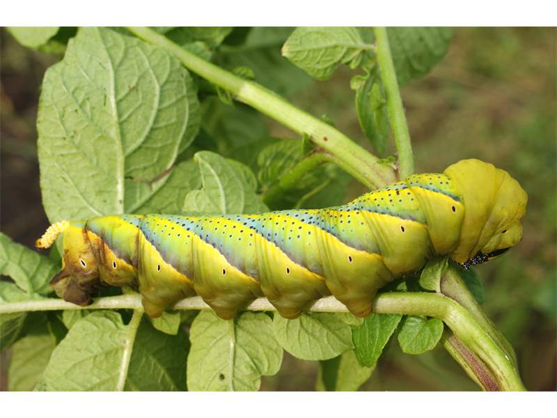 Nach der Eiablage entwickelt sich in Mitteleuropa eine Folgegeneration. Die Raupen fressen an verschiedenen Pflanzen. In Sachsen werden sie vor allem an Kartoffel und Liguster gefunden. Die Raupen werden bis 13 cm lang und sind dann fingerstark. Auffallend ist ein Horn am hinteren Ende. Die Färbung der Raupen ist meist gelblich oder grün. Seitlich befinden sich verschiedenfarbige, oft hellblaue, Schrägstreifen. Die Verpuppung erfolgt in der Erde und etwa im August und im September schlüpfen die Falter. Sie fliegen wieder in den Mittelmeerraum.