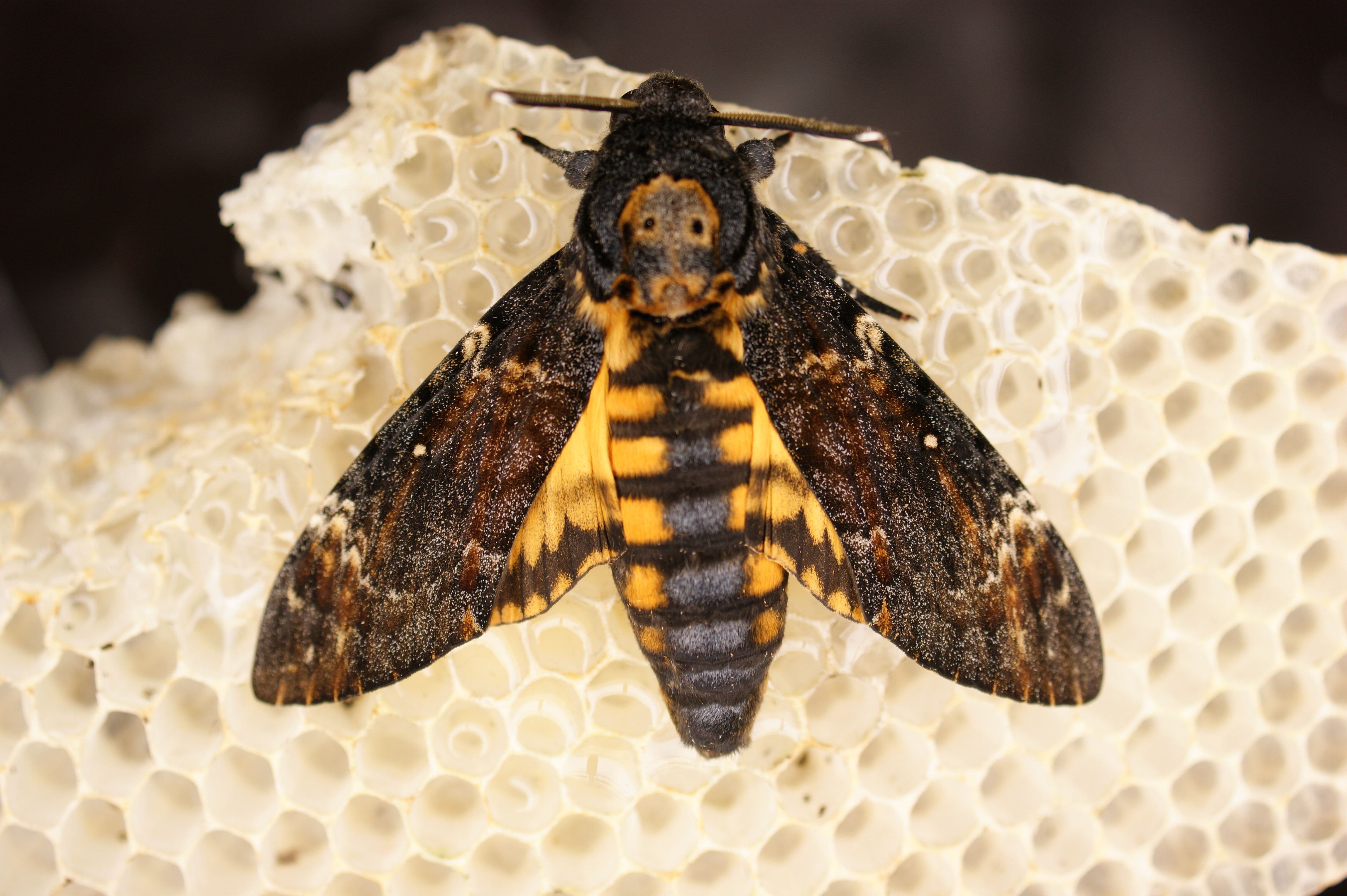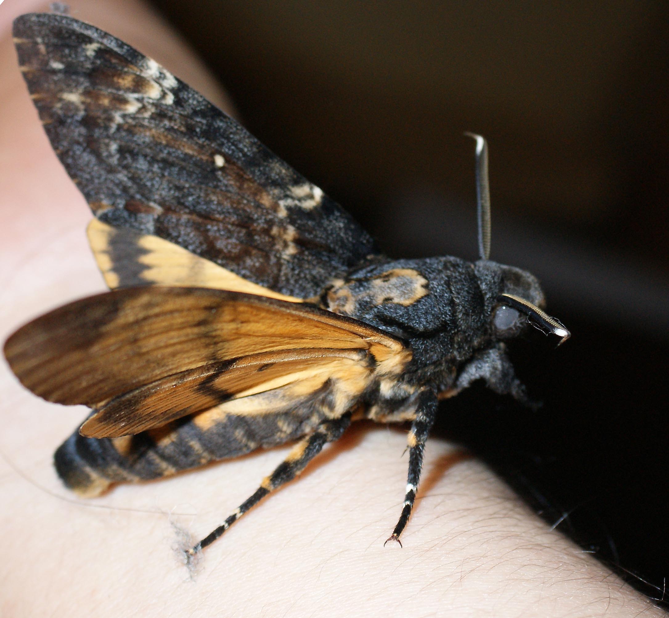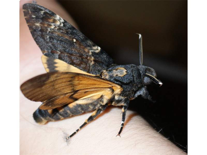 Thorax: oberseits dunkel, mit heller Zeichnung, an einen Totenkopf erinnernde Zeichnung (Name!); unterseits gelb. Flügel schmal. Vorderflügel dunkelgrau bis blauschwarz und mit heller Zeichnung; auffallend ist ein kleiner weißer Fleck in der Flügelmitte; einige Querlinien und variabel weißliche oder bräunliche Flecken und Linien besonders im äußeren Flügeldrittel. Hinterflügel gelb, in der Mitte eine schmale sowie nahe dem Rand eine breitere schwarze Querbinde; die Adern in diesem Bereich dunkel beschuppt. Unterseiten von Vorder- und Hinterflügeln gelb, mit einer schmalen schwarzen Mittelbinde und einer breiteren Verdunklung zum Rand.