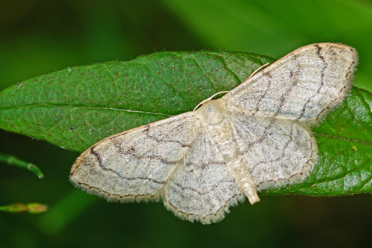 Grundfarbe aller Flügel weißgelb bis weißgrau. Vorderflügeloberseiten: Beide Querlinien und Mittelschatten leicht geschwungen, innere Querlinie oft nur sehr schwach ausgebildet; Mittelschatten scharf begrenzt verläuft saumwärts vom Mittelpunkt; äußere Querlinie vor dem Vorderrand deutlich (meist spitzwinklig) nach innen geknickt. Wellenlinie undeutlich. Alle Flügel mit dunkler strichförmige Saumlinie und dunklen Fransenpunkte. Äußere Querlinie und Mittelschatten setzen sich auf den Hinterflügeln fort.
