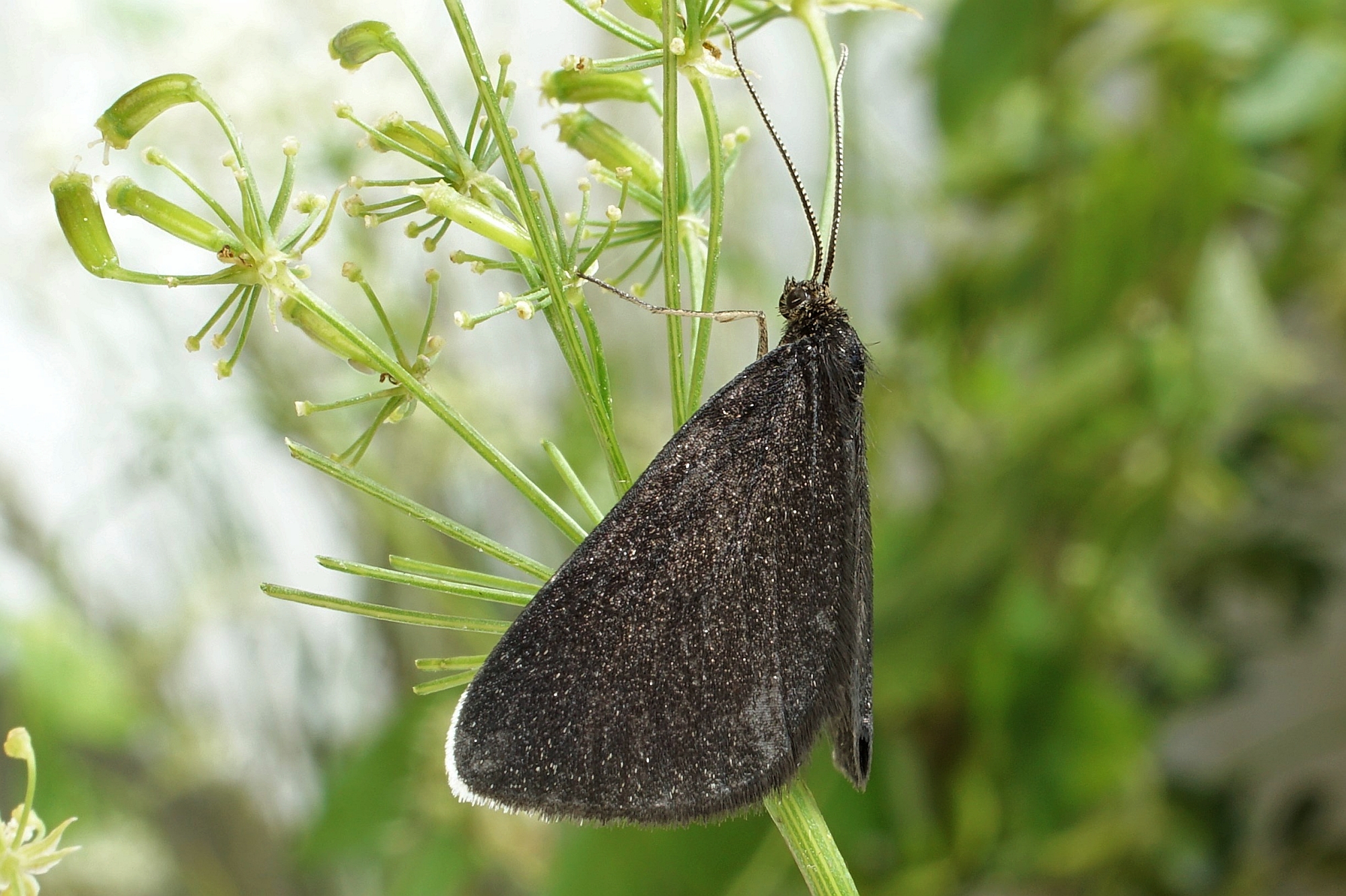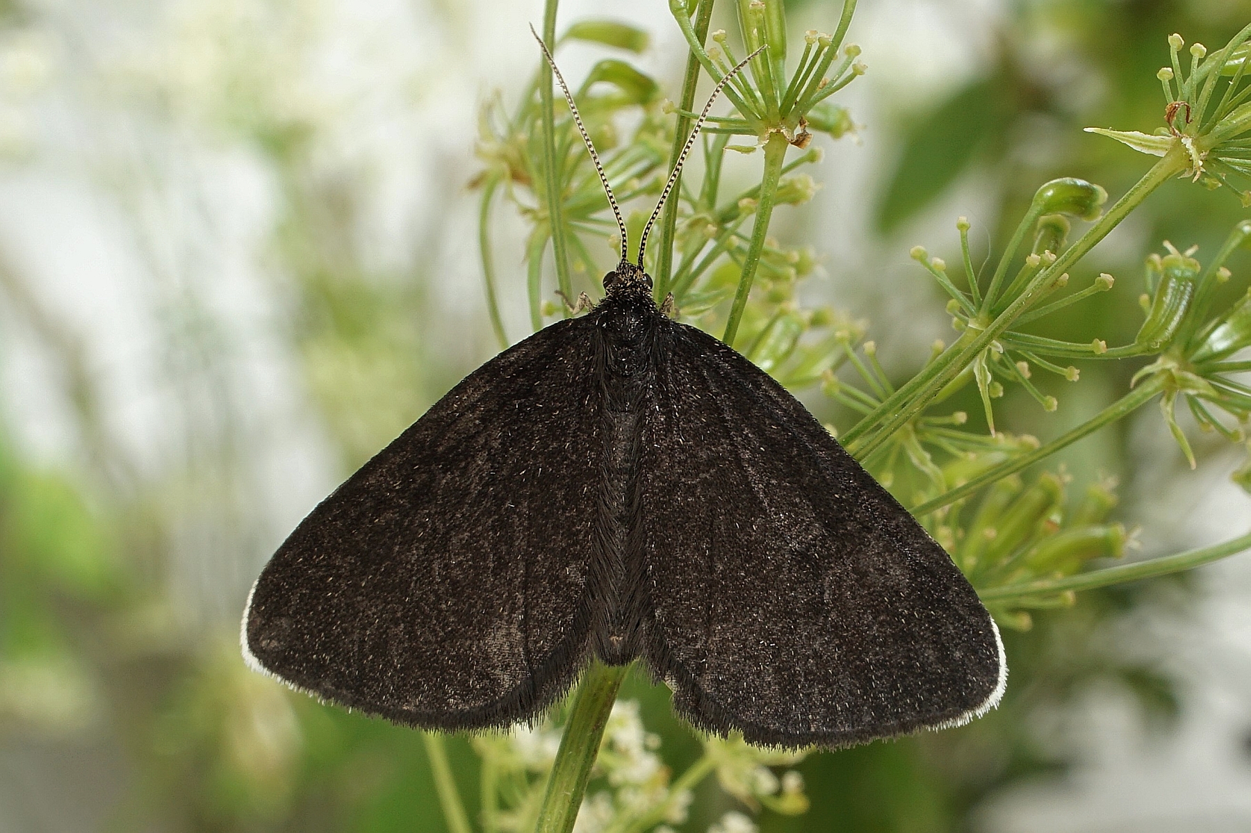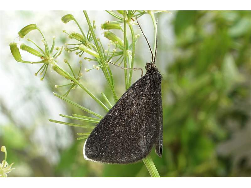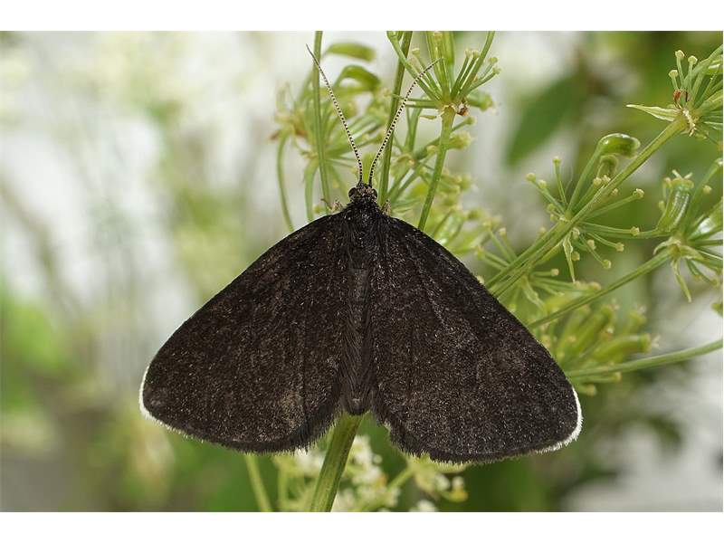 Alle Flügel schwarz, nur die Ränder der Vorderflügelspitzen weiß.