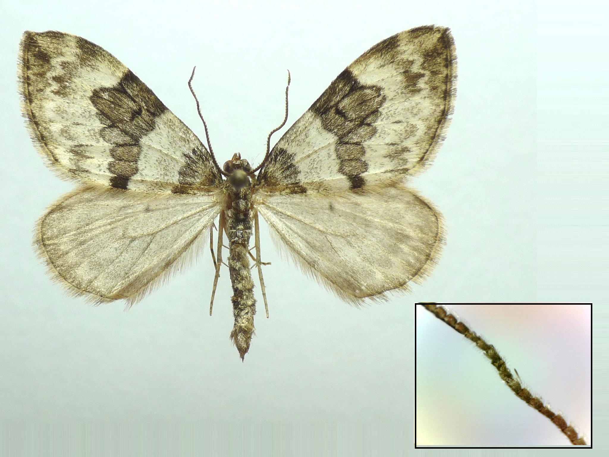 Vorderflügel: Grundfarbe weiß bis blassgrau mit grauer bis brauner Zeichnung; Mittelbinde in der Diskalregion kontrastreich, in der Postdiskalregion eine weiße Wellenlinie.