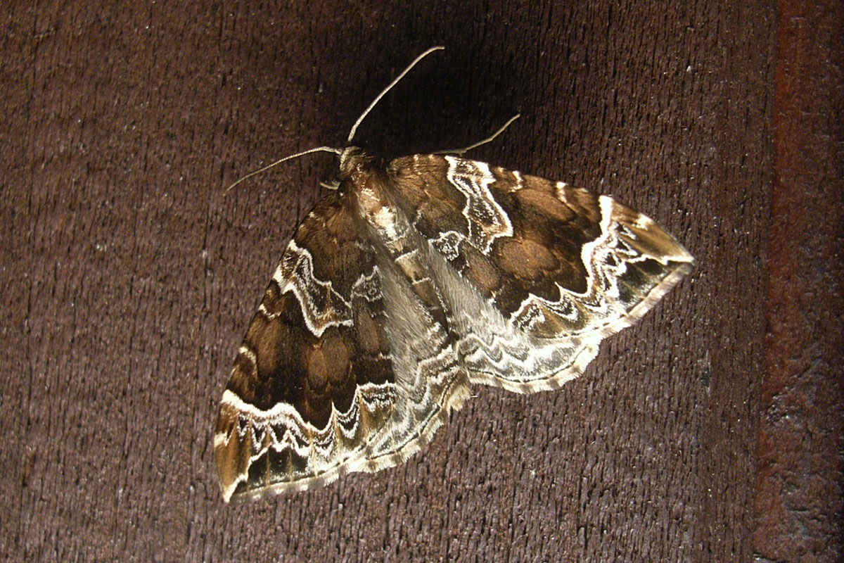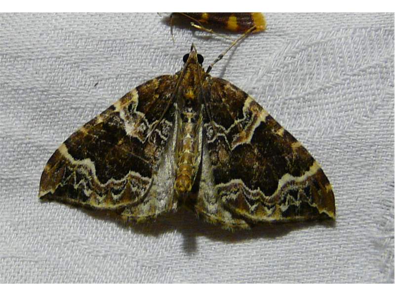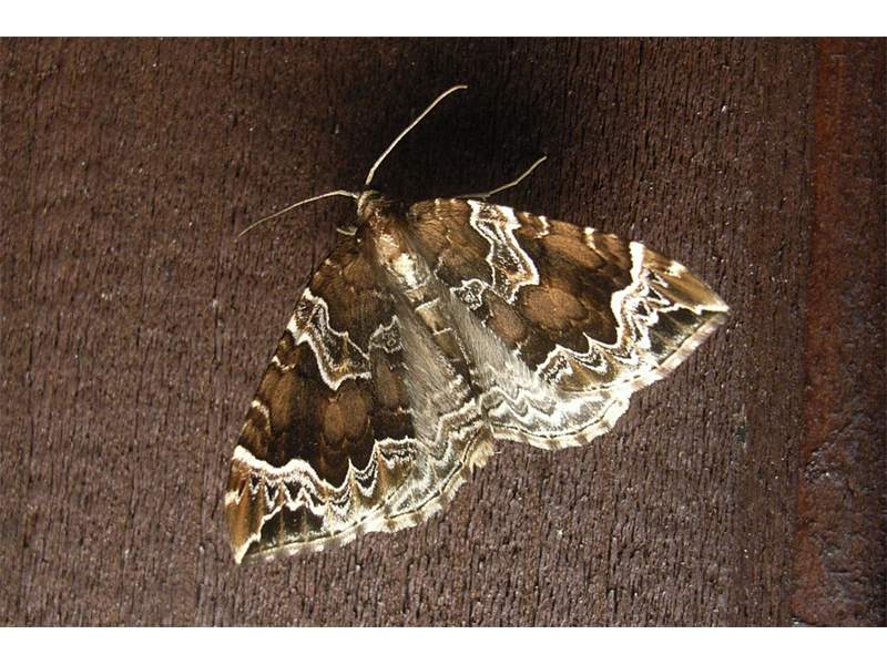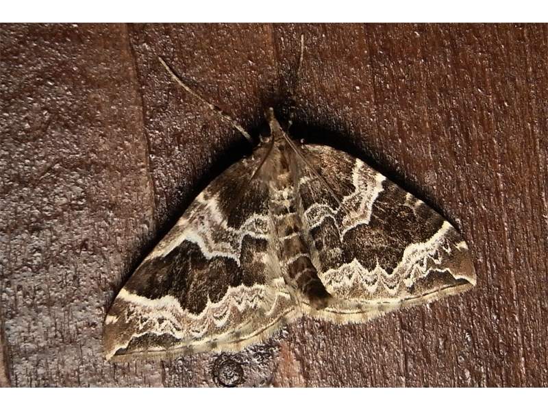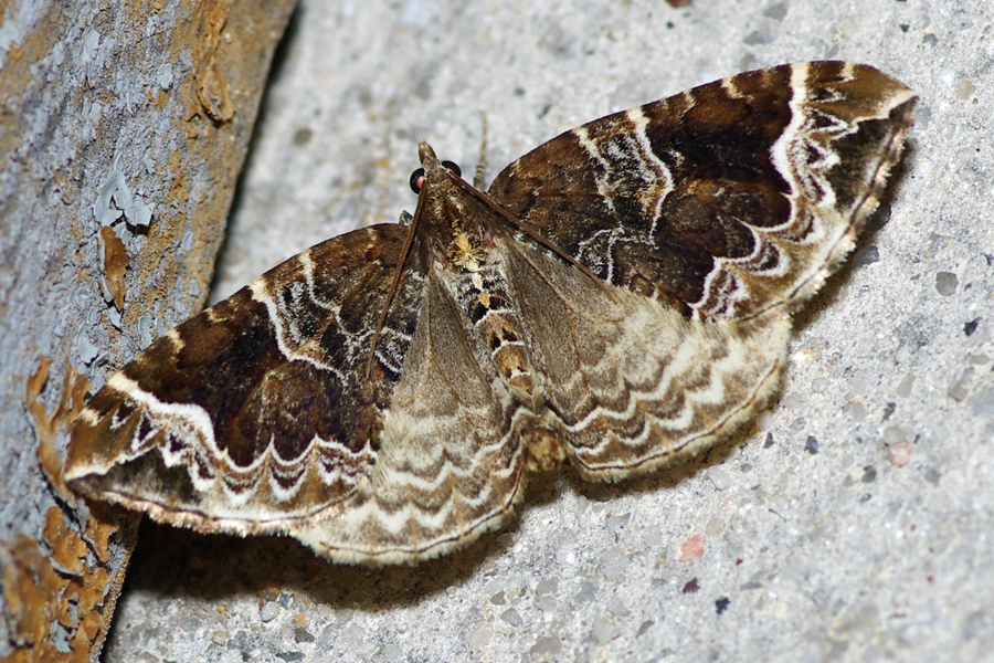 Vorderflügel: Kontrastreich gefärbt, Basal- und Mittelfeld braun bis dunkelbraun, oft von dünnen weißen Linien durchzogen; dazwischen die hellere bandförmig ausgeprägte innere Querlinie, die beiderseits unregelmäßig gezackt und weiß begrenztes ist. Aus dem nach außen weiß begrenzten Mittelfeld ragen zwei stumpfe Zähne ins Saumfeld. Die weiße Wellenlinie verläuft in deutlichen Bögen und Zacken, die dunkel gefüllt sind. Am Außenrand befindet sich unterhalb des weißen Teilungsstriches, der in der Vorderflügelspitze beginnt, ein dunkelbrauner halbmondförmiger Fleck, der bis zu der dort mehr gezackten Wellenlinie reicht. Somit wird dieser Fleck von einer gezackt verlaufenden weißen Linie begrenzt. Fransen gescheckt.