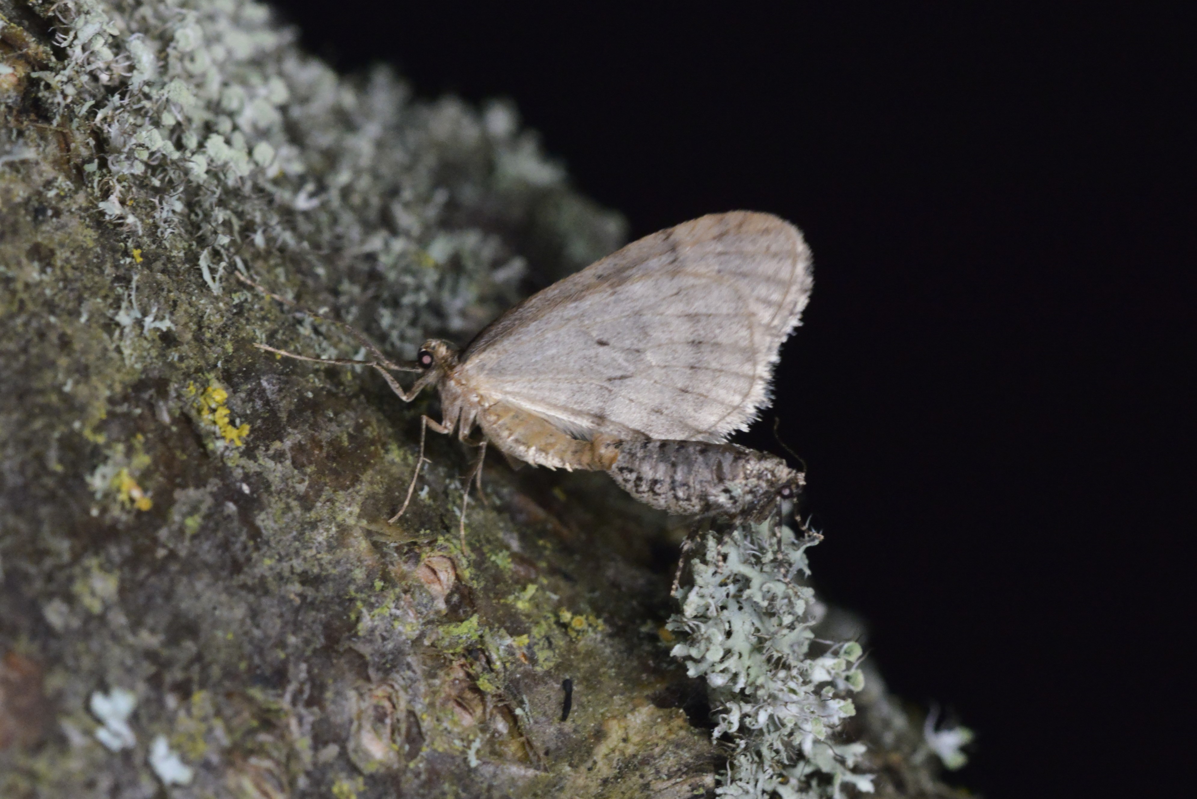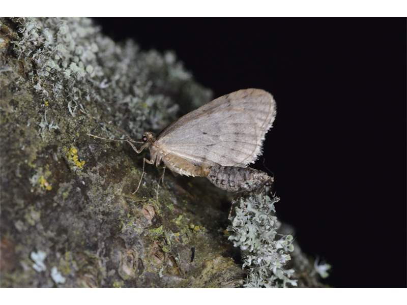 Paarung des Kleinen Frostspanners (links Weibchen, rechts Männchen). Gemarkung Hohenprießnitz, November 2014. Hunderte Männchen schwärmten abends im Schlosspark, aber es waren nur wenige Weibchen zu beobachten.