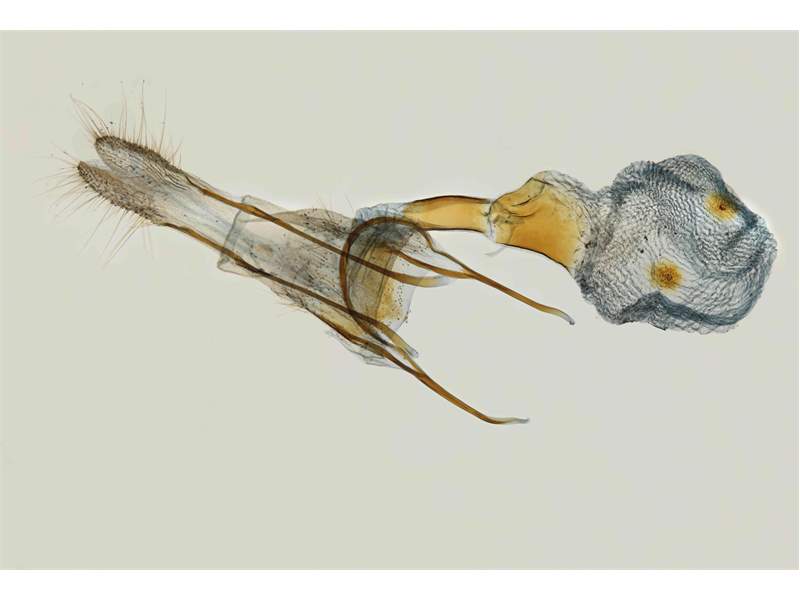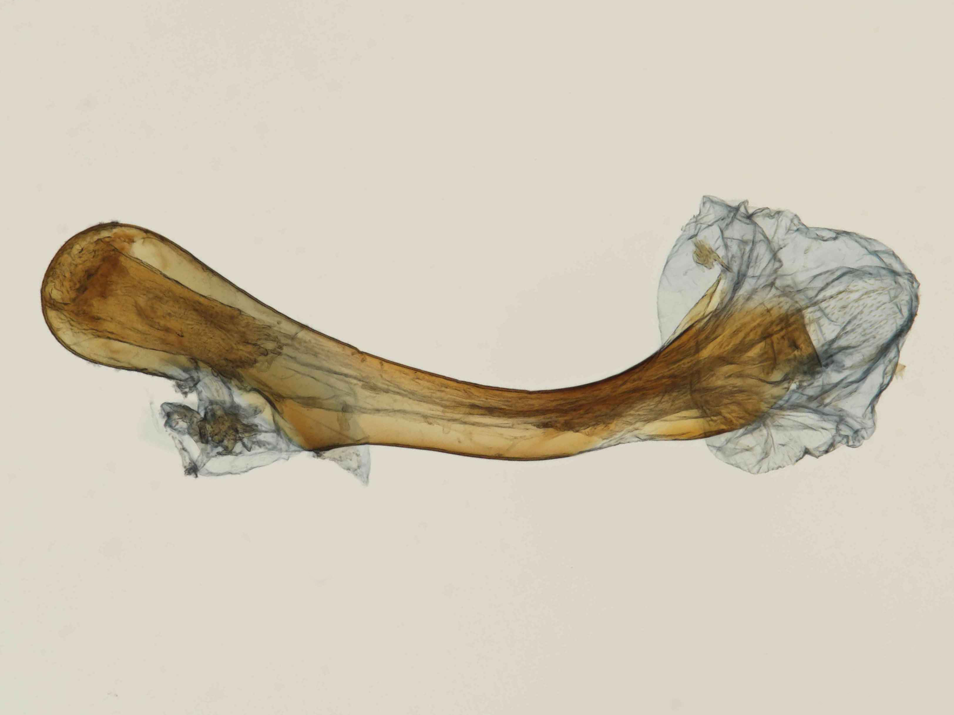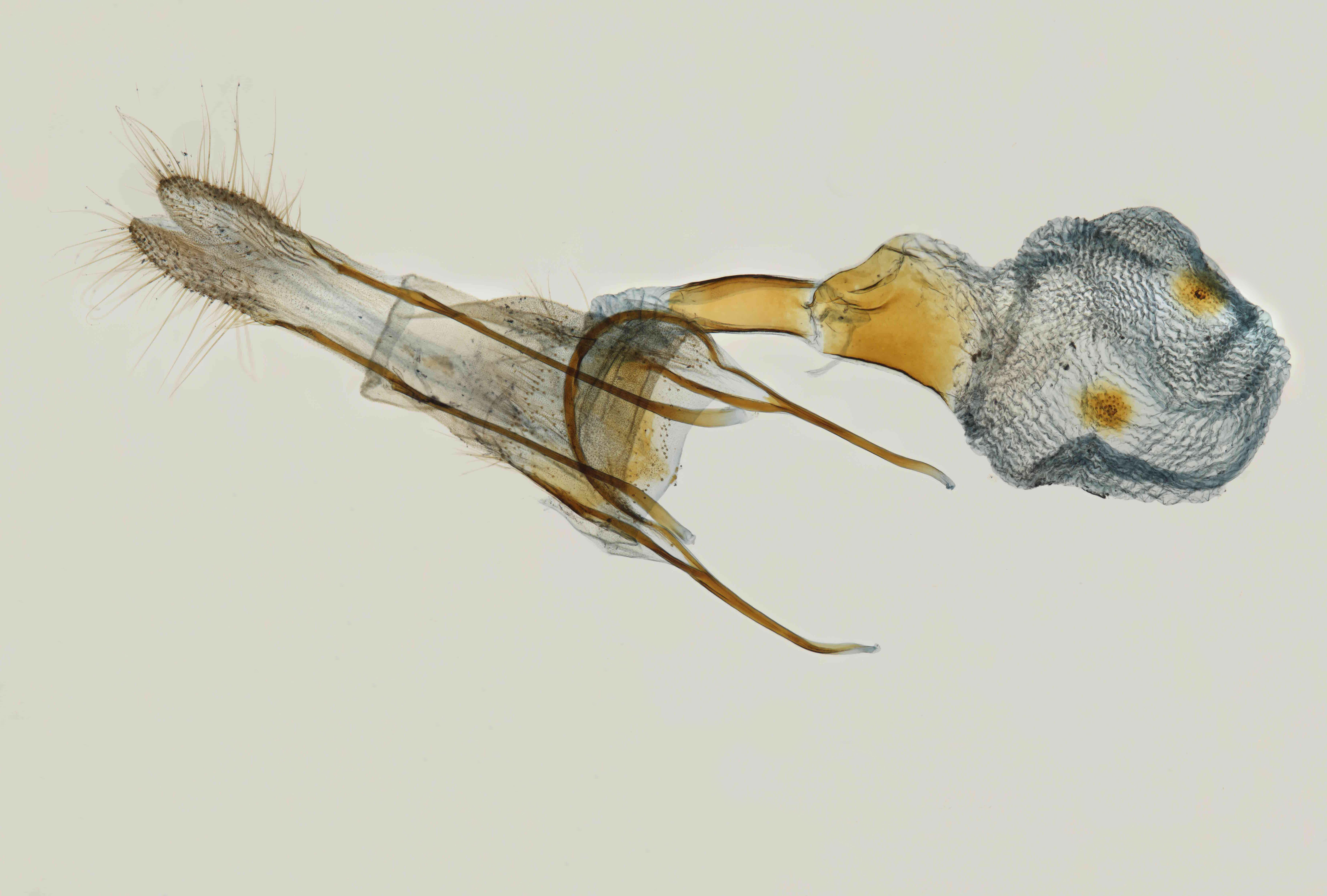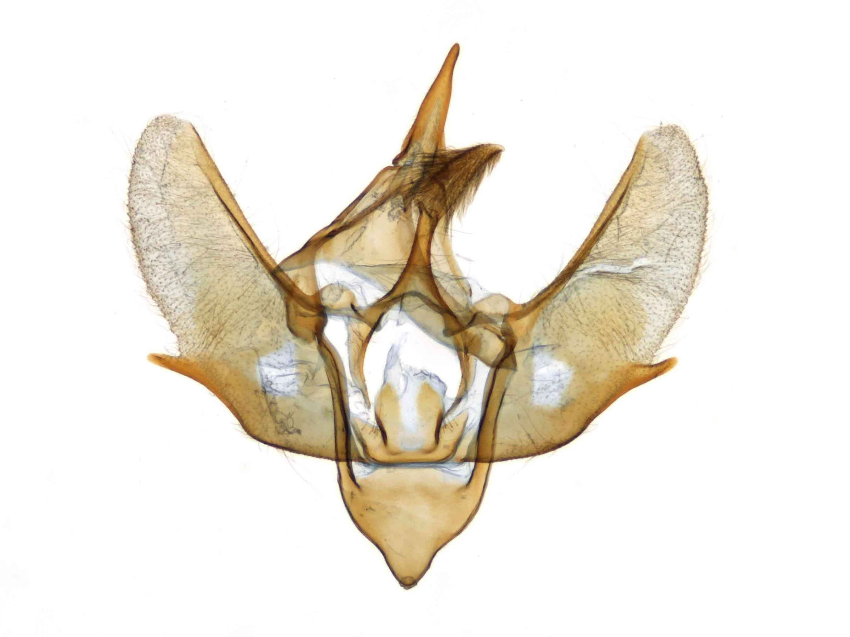 Männliches Genital. Deutlich zu sehen der Fortsatz am Ventralrand der Valven. Dresden, Junge Heide, 30.09.1962, leg. Skell, coll. Senckenberg Museum für Tierkunde Dresden.
