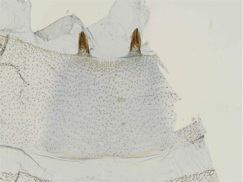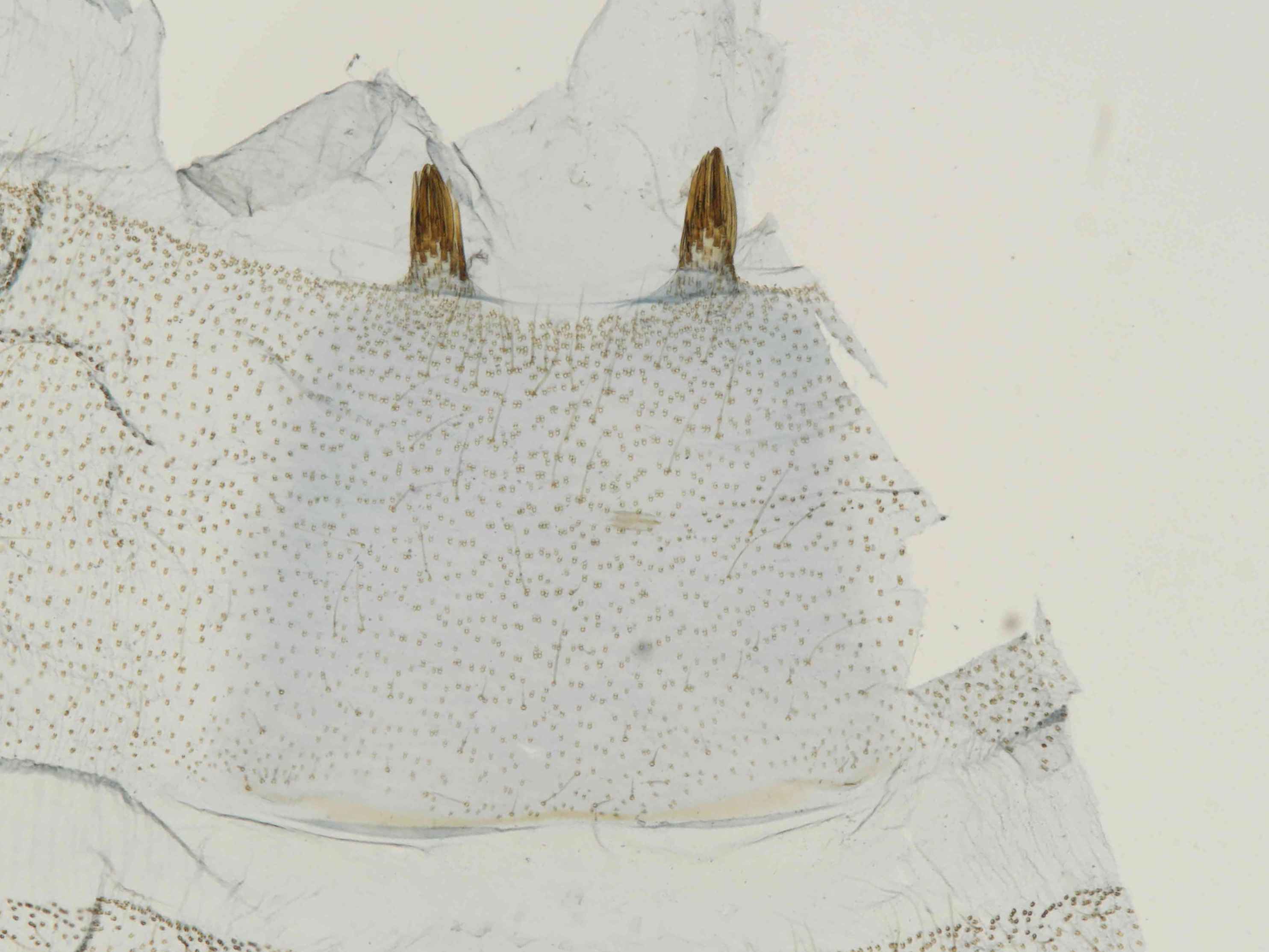 Hinterrand des 8. Sternits mit langen und weit auseinander stehenden Fortsätzen. Dresden, Junge Heide, 30.09.1962, leg. Skell, coll. Senckenberg Museum für Tierkunde Dresden.