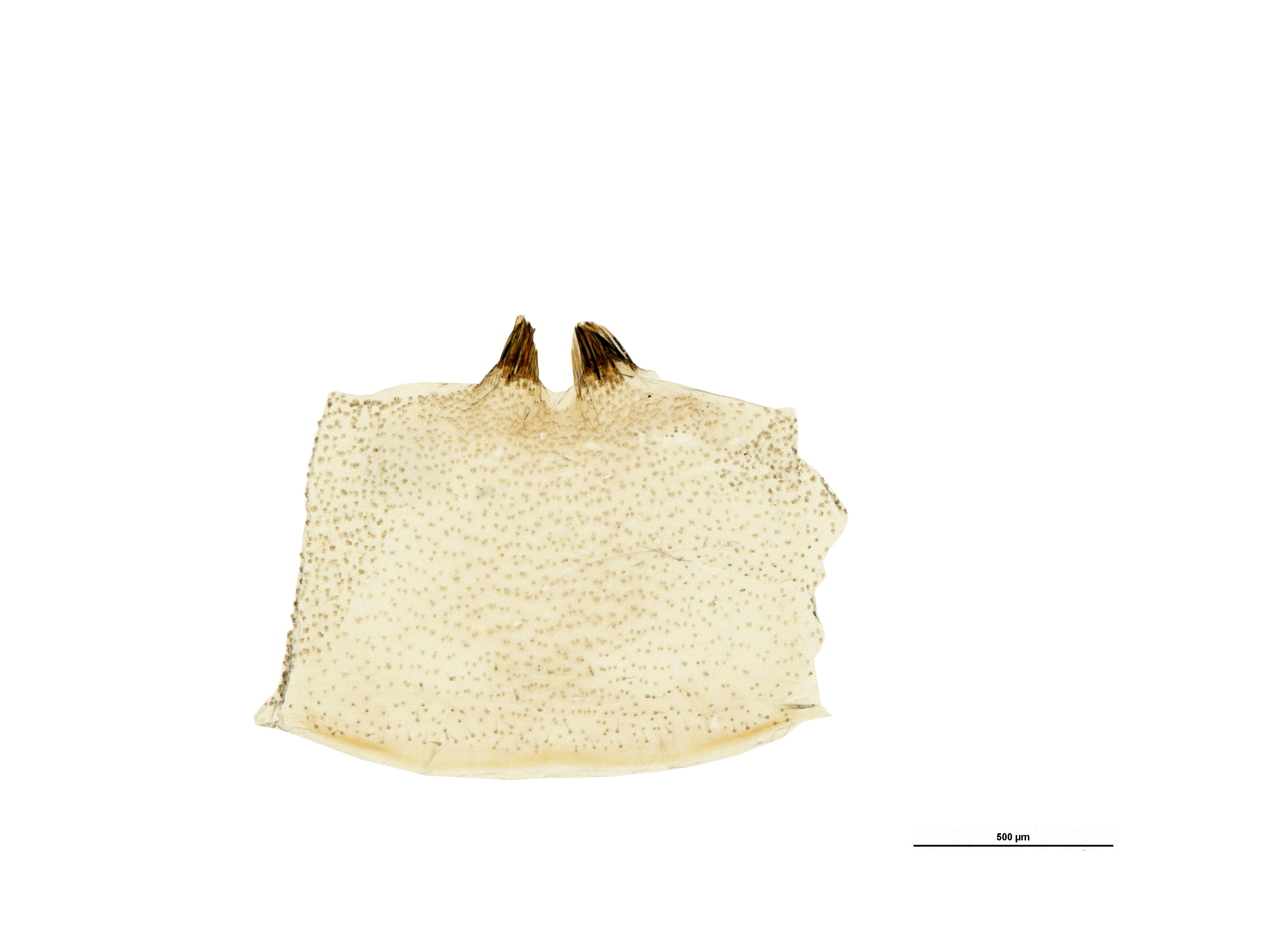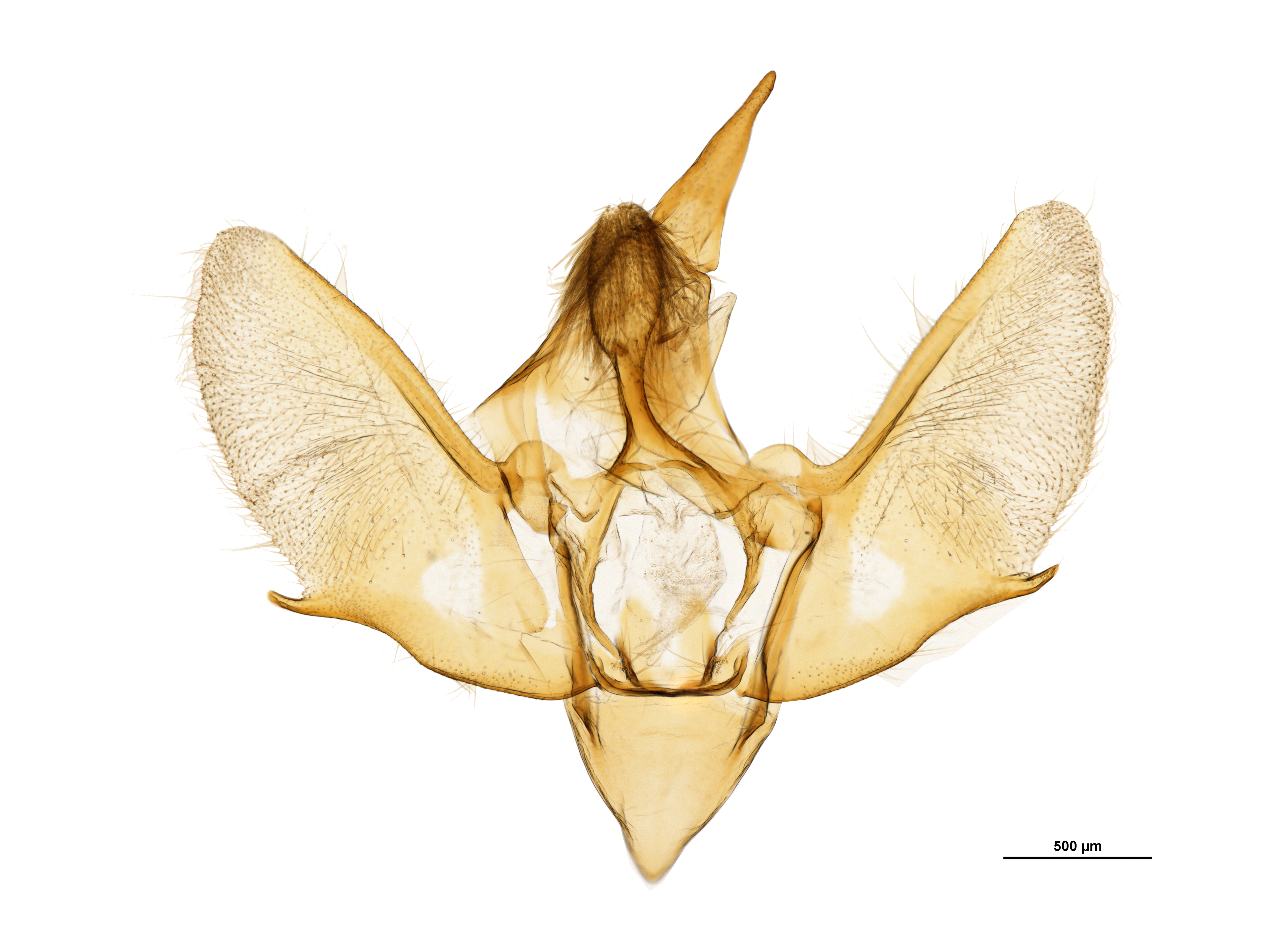 Die beiden Fortsätze am Hinterrand des 8. Sternits werden nach vorsichtigem Abpinseln der Schuppen ventral am Abdomenende sichtbar.