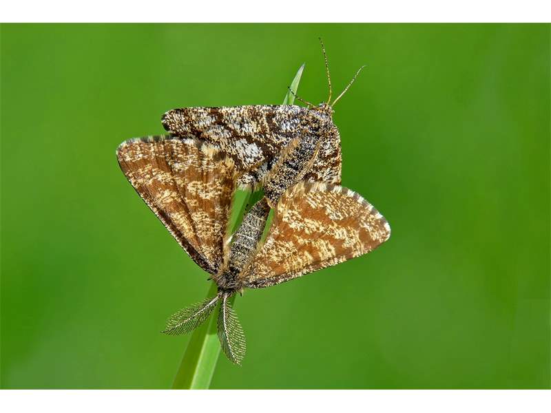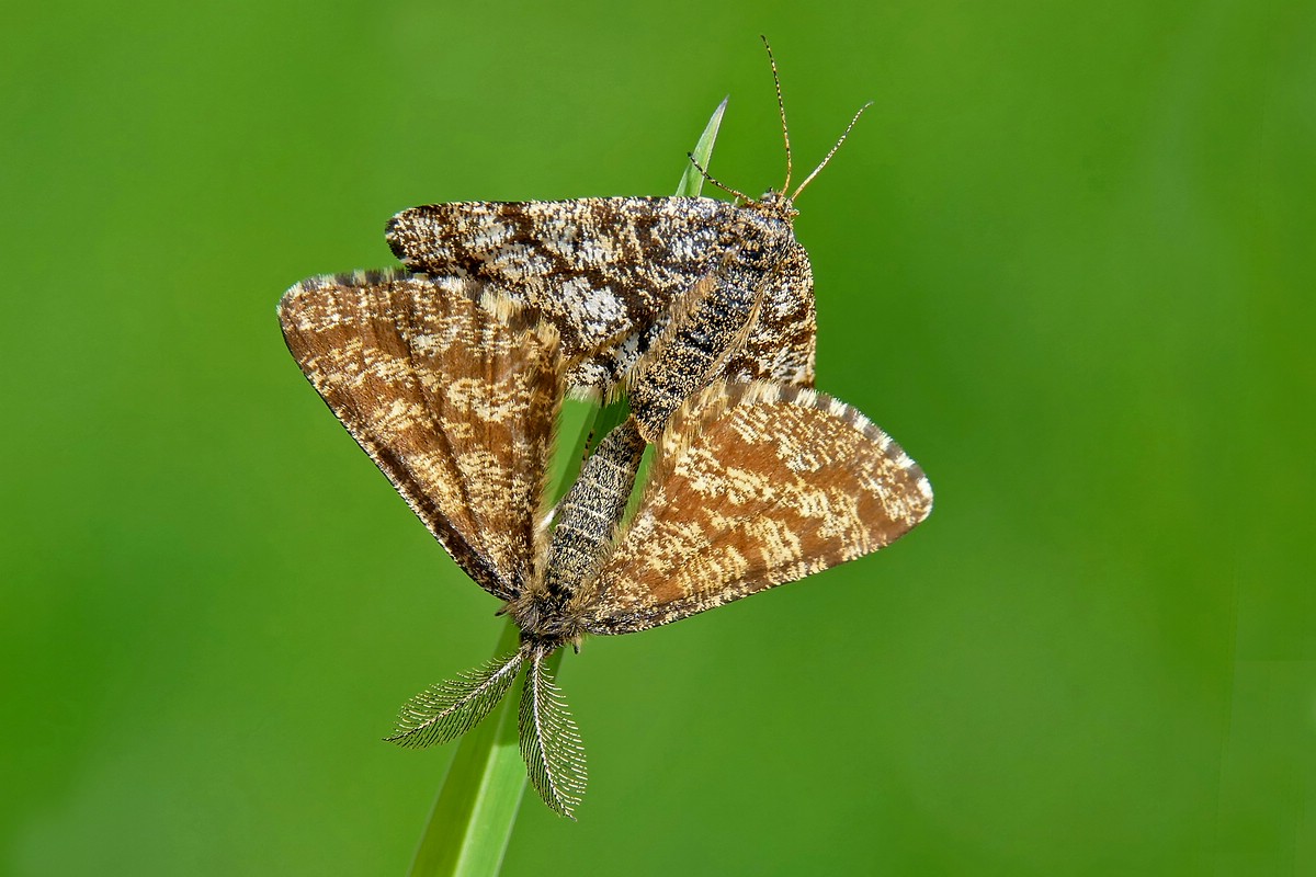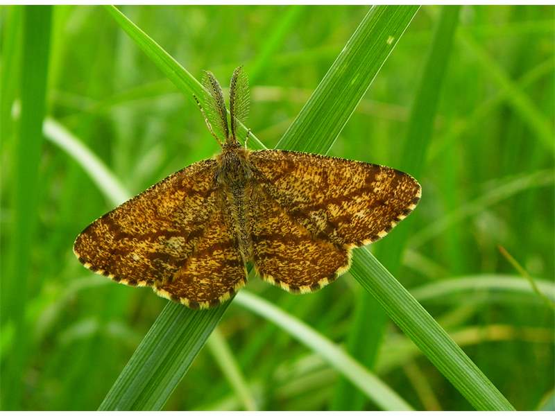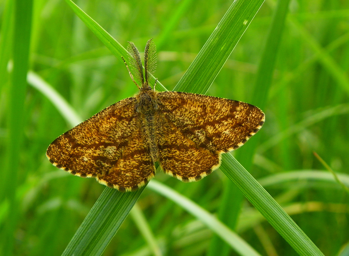 Männchen des Heidespanners Mitte Mai 2011 in Weischlitz. Deutlich zu sehen sind die zweiseitig gekämmten Fühler.