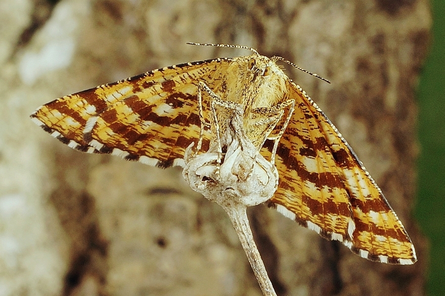 Als Nahrungspflanzen für die Larven wurden bisher ca. 15 verschiedene Arten festgestellt, so z. B. Johanniskraut (Hypericum sp.), Beifuß (Artemisia sp.), Heidekraut (Calluna sp.), Hornklee (Lotus sp.), und verschiedenen Ginsterarten (Genista sp.).
