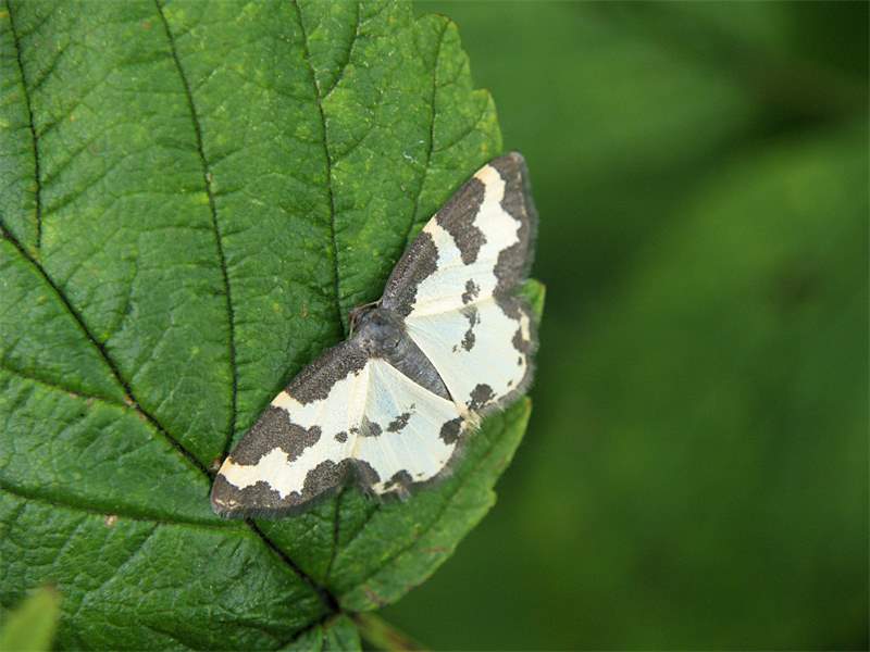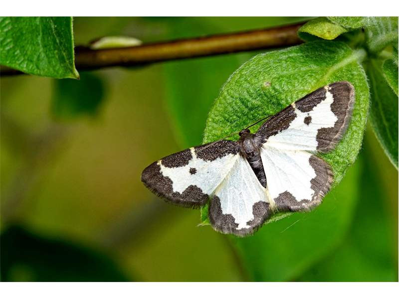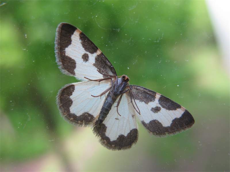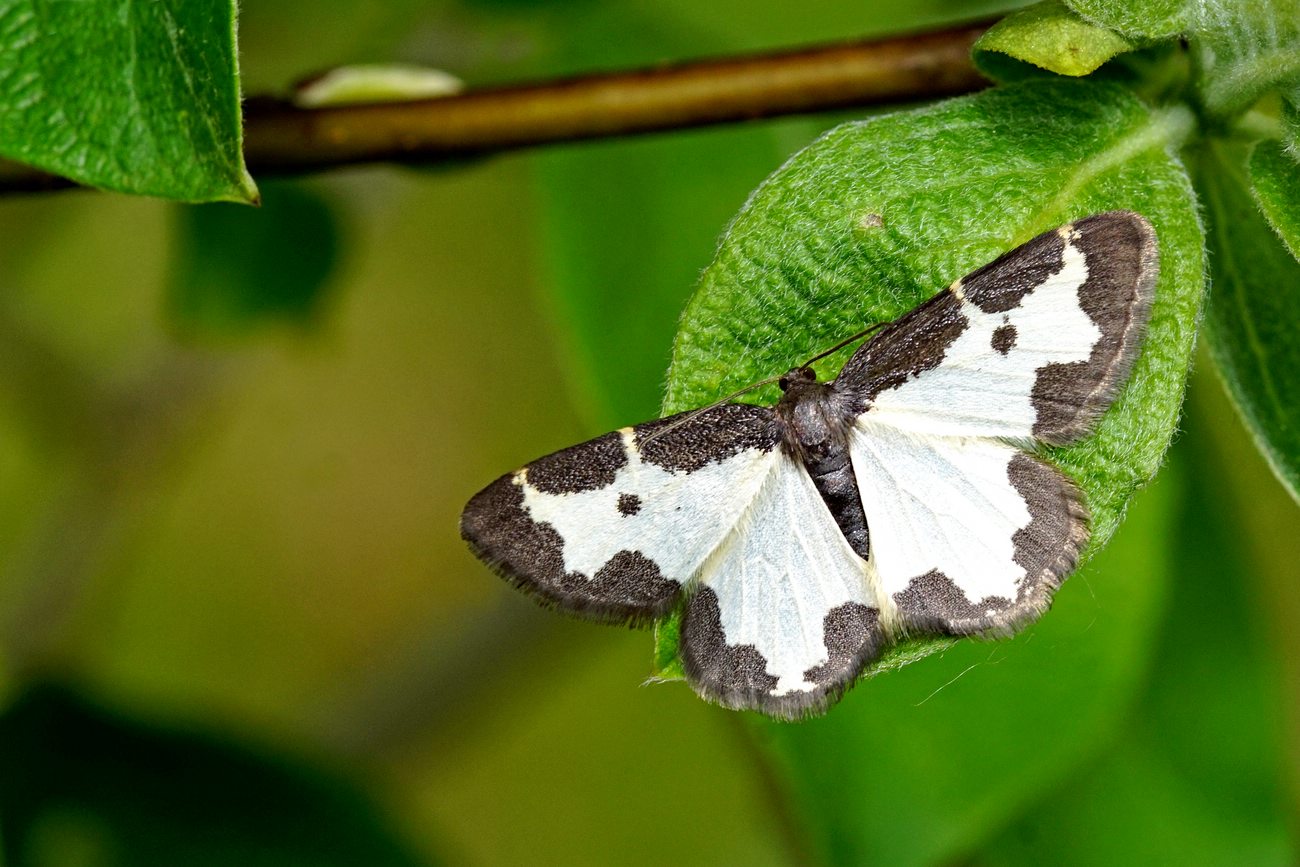 Flügel weiß, von ausgebuchteten schwarzen Säumen eingefasst; in der Mitte der Vorderflügel ein schwarzer Punkt, der mit dem schwarzen Saum am Vorderrand verbunden sein kann. Die Unterseite der Flügel mit gleicher Zeichnung.