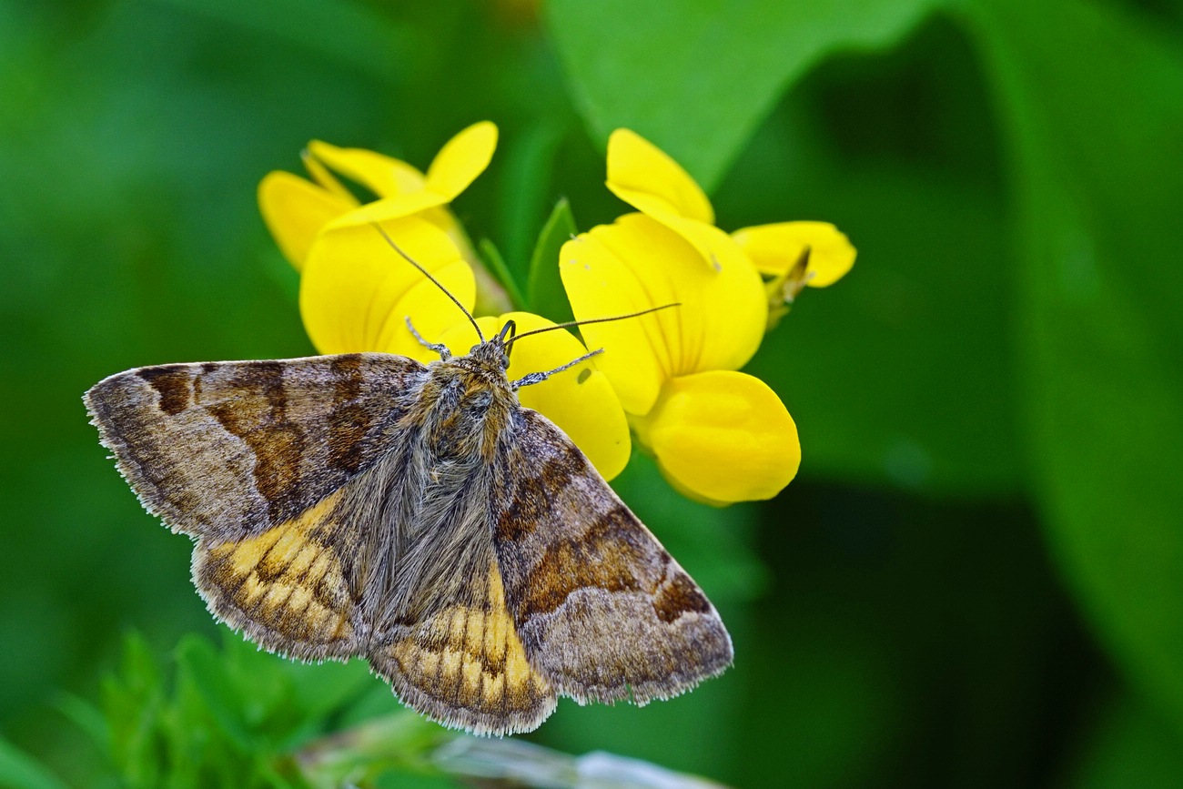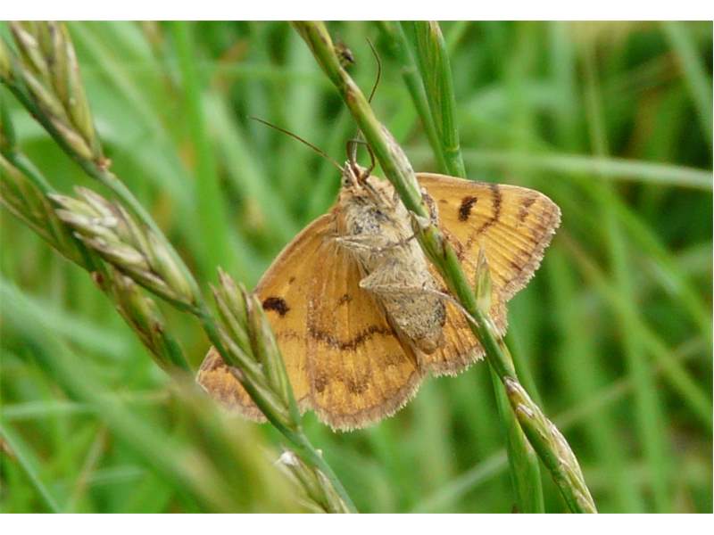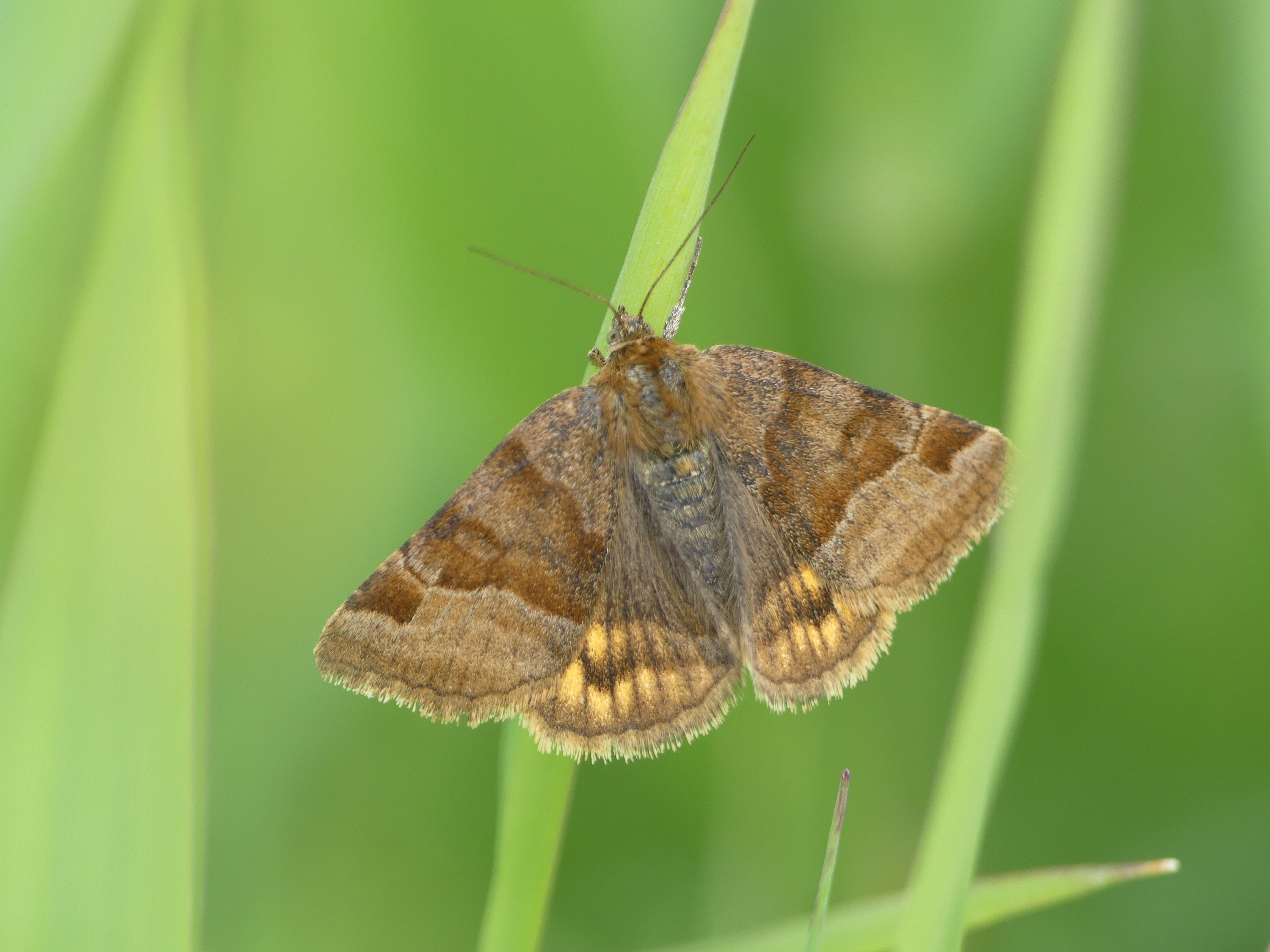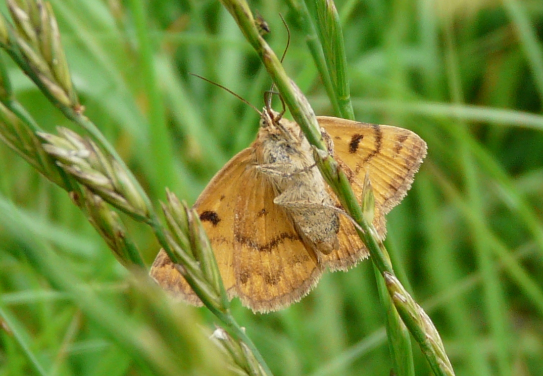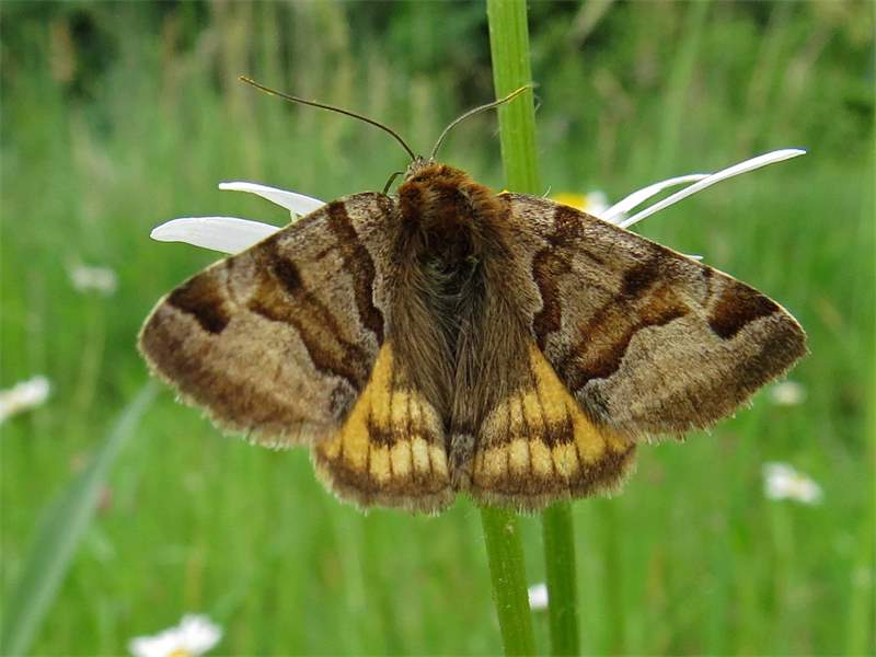 Flügelunterseiten: Gelb bis orange, mit schwarzem Mittelfleck im Vorderflügel und schwarzer äußerer Querlinie auf allen Flügeln.