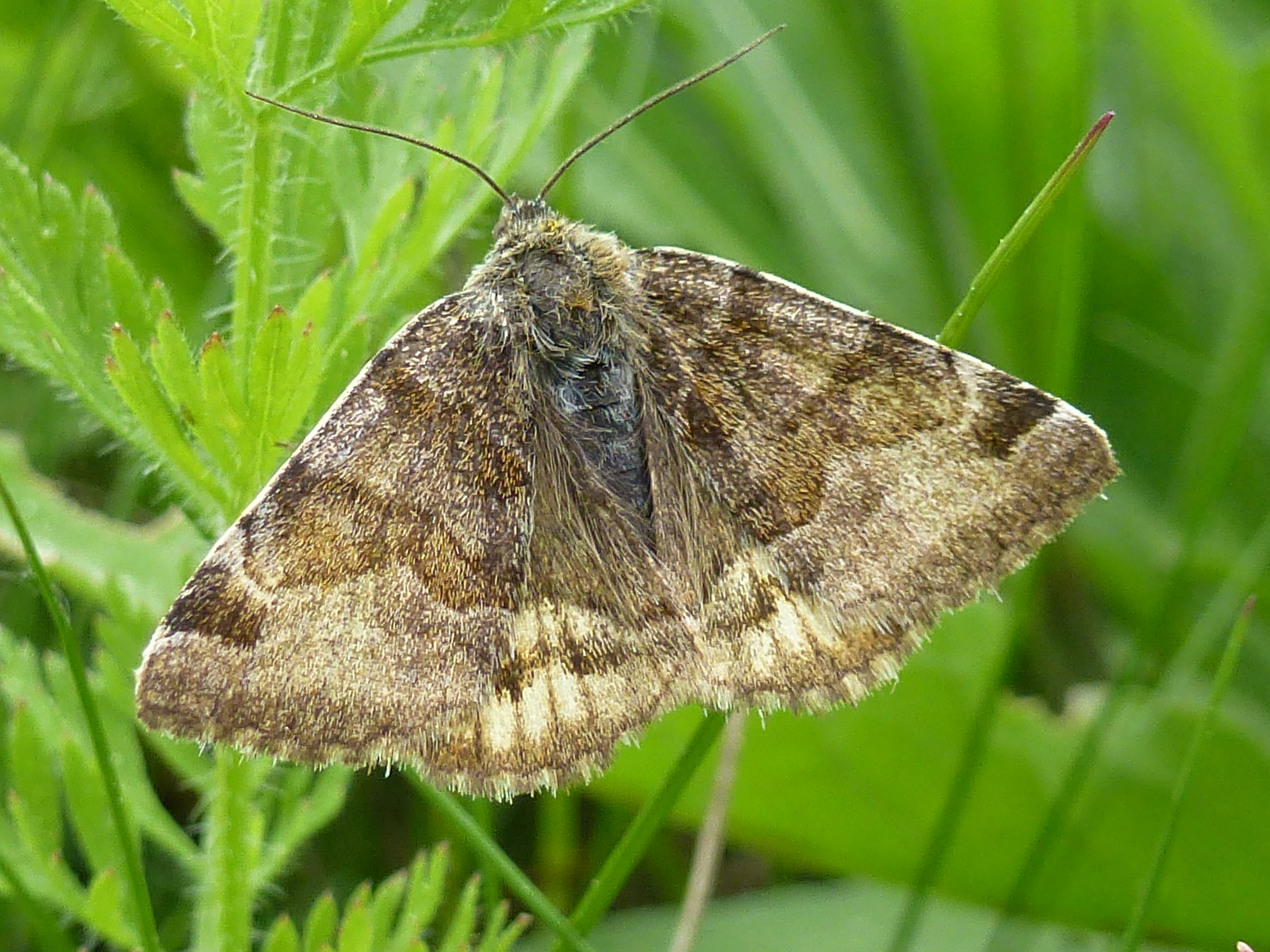 Vorderflügel: Hellbraun, mit zwei dunkelbraunen unregelmäßigen Querlinien und am Vorderrand vor der Flügelspitze ein größerer dunkelbrauner Fleck.