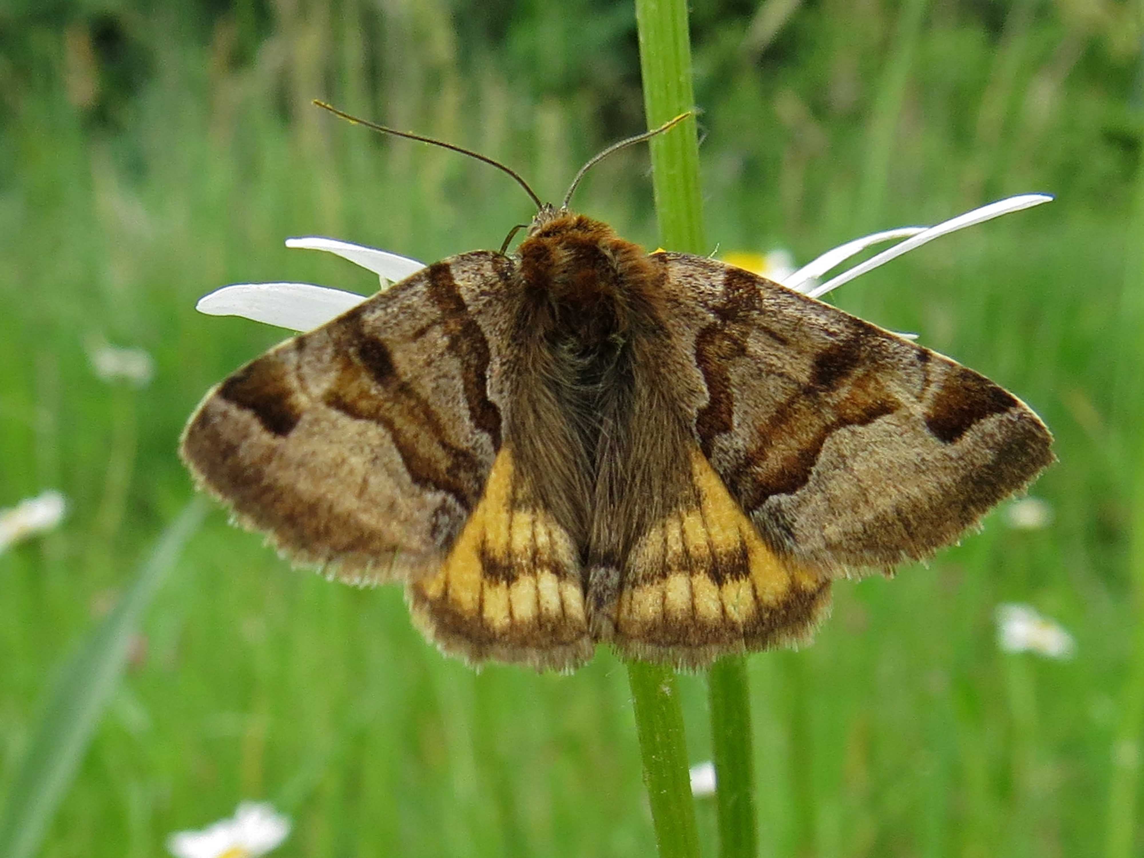 Hinterflügel: Von der Basis bis zur Mitte braun, dann auf gelbem Grund eine dunkelbraune unregelmäßige Querlinie sowie mit braunem Flügelrand.