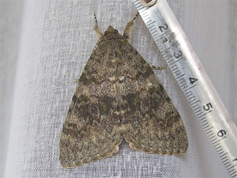 Vorderflügeloberseite: Grundfarbe verschiedene Grautöne, kontrastarm gezeichnet. Querlinien und Mittelschatten dunkler. Die äußere Querlinie ist annähernd regelmäßig gezackt, der Doppelzahn in Höhe des Nierenmakels ist kaum größer. Nierenmakel ist oft nur ein bräunlicher Fleck mit geringer Aufhellung im Kern und im Mittelschatten schwer erkennbar.