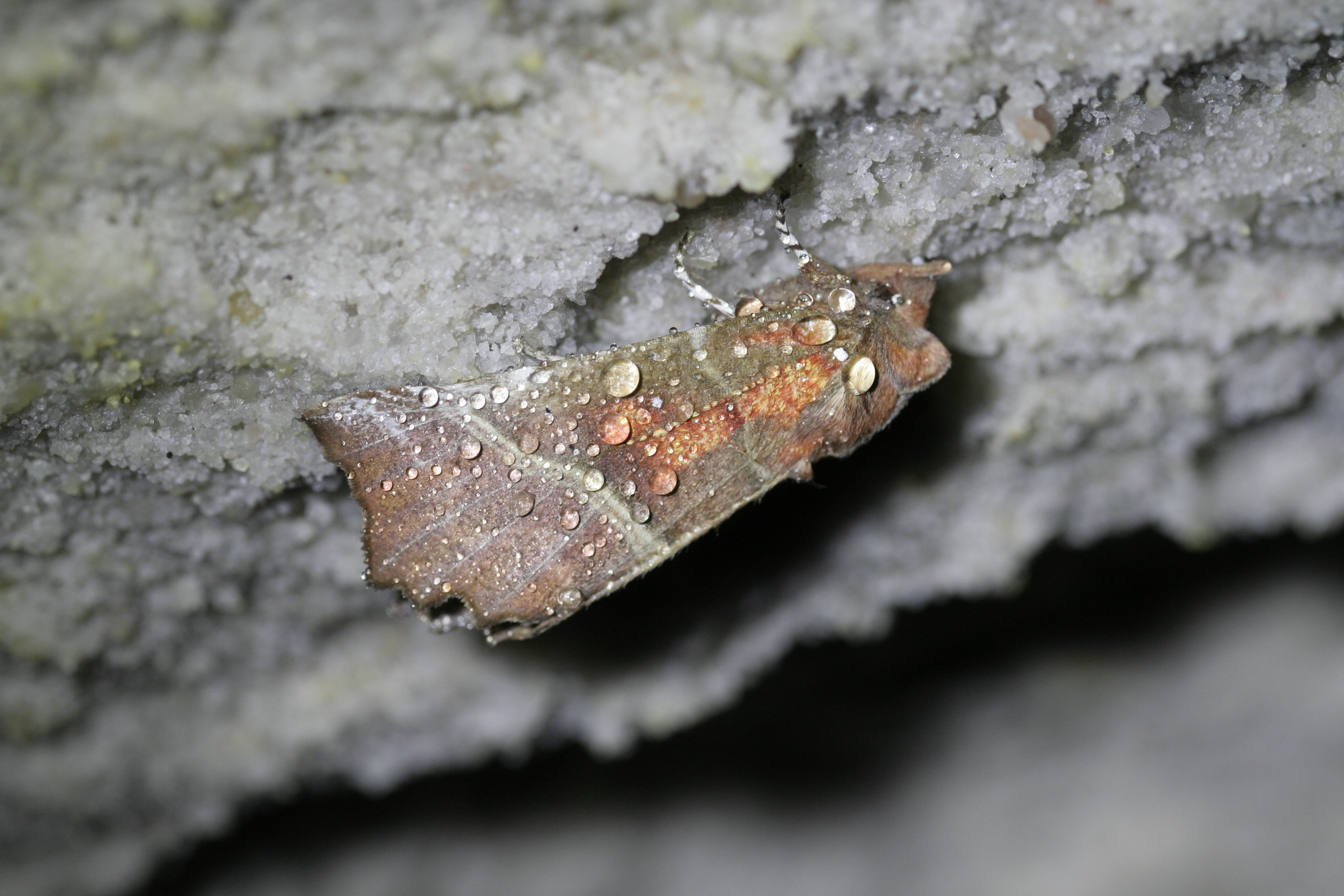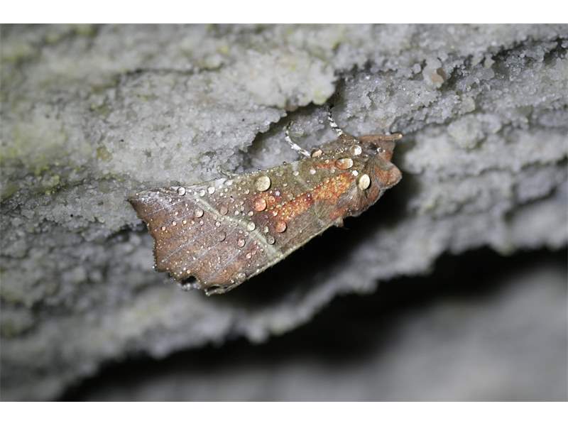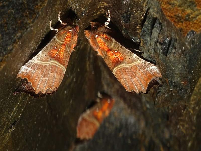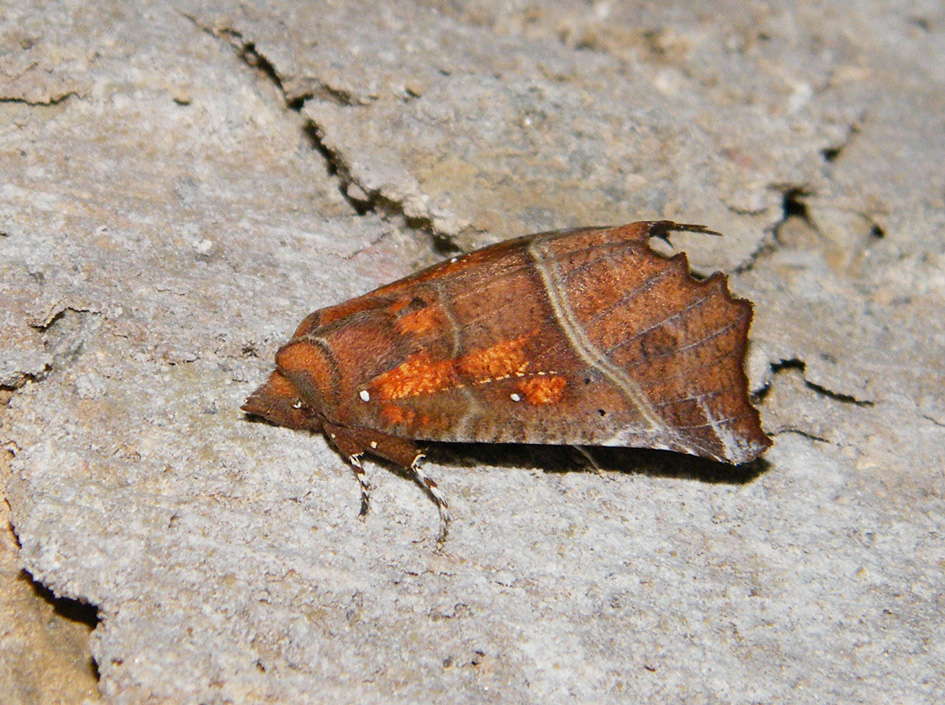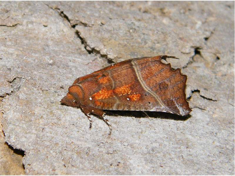 Vorderflügel hellbraun, mit zwei hellgrauen Querlinien, je einem weißen Punkt an der Flügelbasis und in der Flügelmitte sowie ausgedehnten, orangefarbenen Flecken, die sich auch auf Kopf und Thorax fortsetzen (Name!). Der Außenrand der Vorderflügel ist deutlich unregelmäßig geformt, was dieser Art auch den deutschen Namen Zackeneule einbrachte.