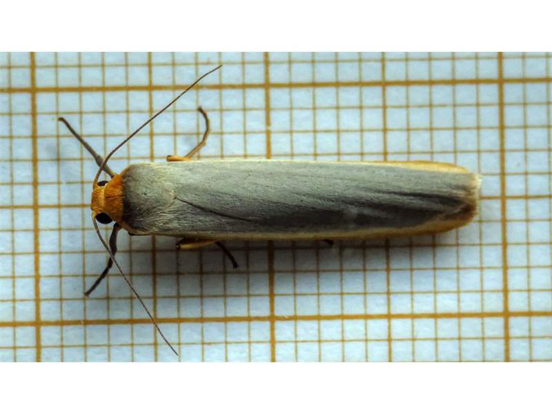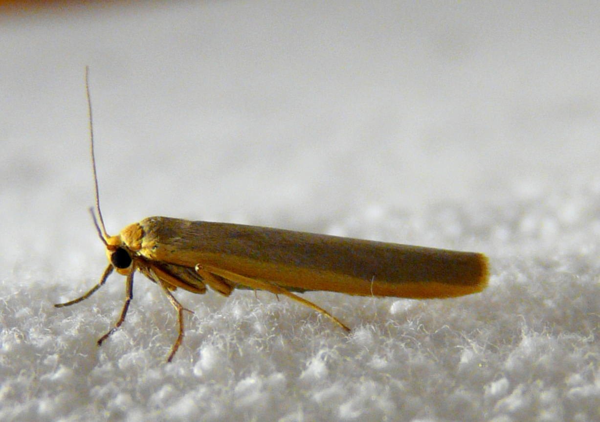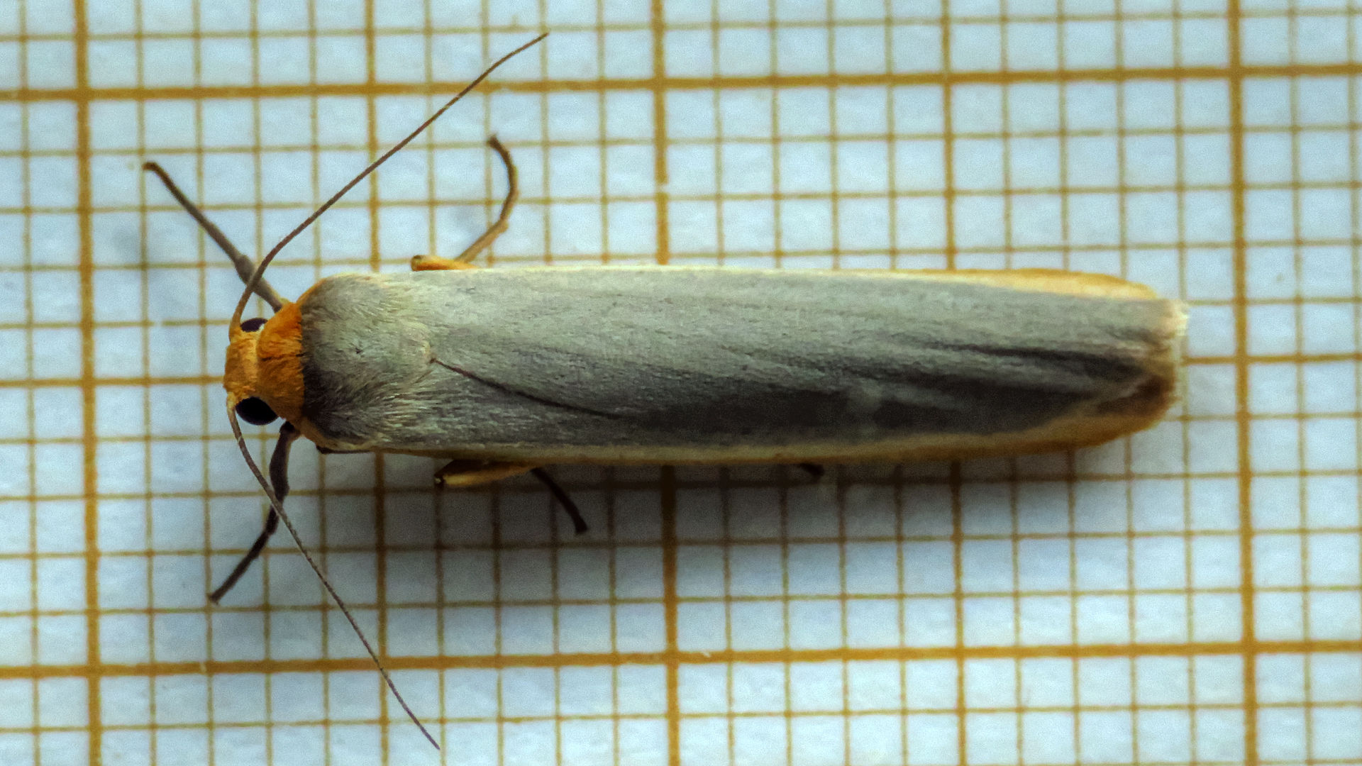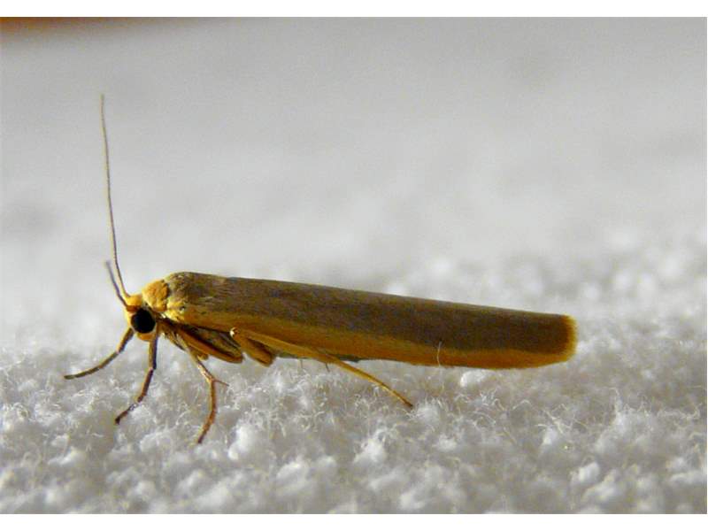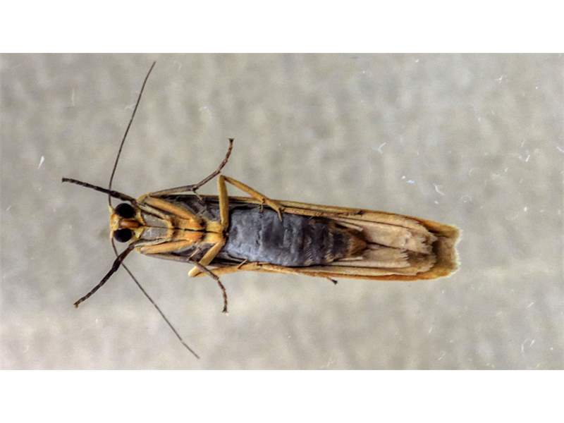 Die Falter legen ihre Flügel längs eingerollt über den Hinterleib. Vorderflügel grau, mit gelbem Vorderrand, der sich zur Flügelspitze nicht oder nur wenig verjüngt. Hinterflügel hellgelb. Abdomenende gelb. Ähnliche Arten: