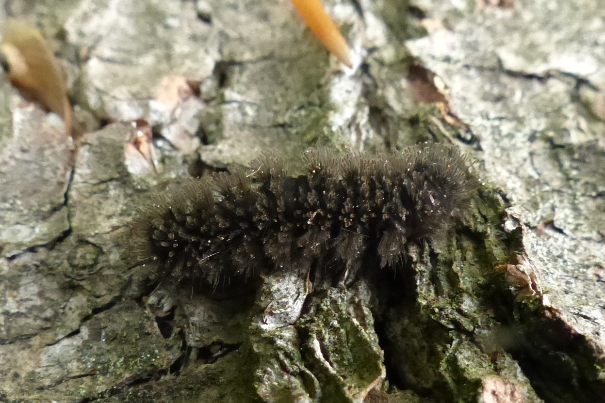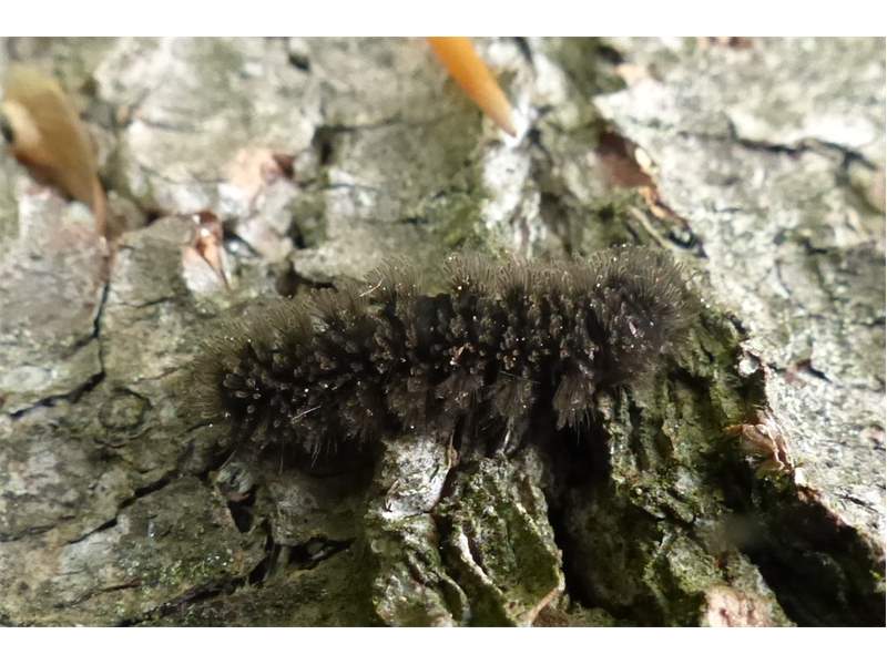 Die Larve hat einen schwarzen Körper und schwarze Brust- und Bauchbeine. Sie besitzt wie alle Bärenspinner (Arctiinae) lange Borsten, die jedoch bei dieser Art deutlich gefiedert sind. Ähnliche Borsten trägt in Sachsen nur das Weißfleckwidderchen AS_Amataphegea (auch bei dieser Art handelt es sich um einen Bärenspinner, nicht um ein Widderchen!), deren Borsten jedoch braun, die Beine rötlichbraun und die Kopfkapsel rotbraun gefärbt sind. Cybosia mesomella hingegen besitzt bis zum vorletzten Larvenstadium eine schwarze, im letzten Stadium dann eine dunkelbraune Kopfkapsel. Sie erreicht eine Länge von etwa 2,5 cm.