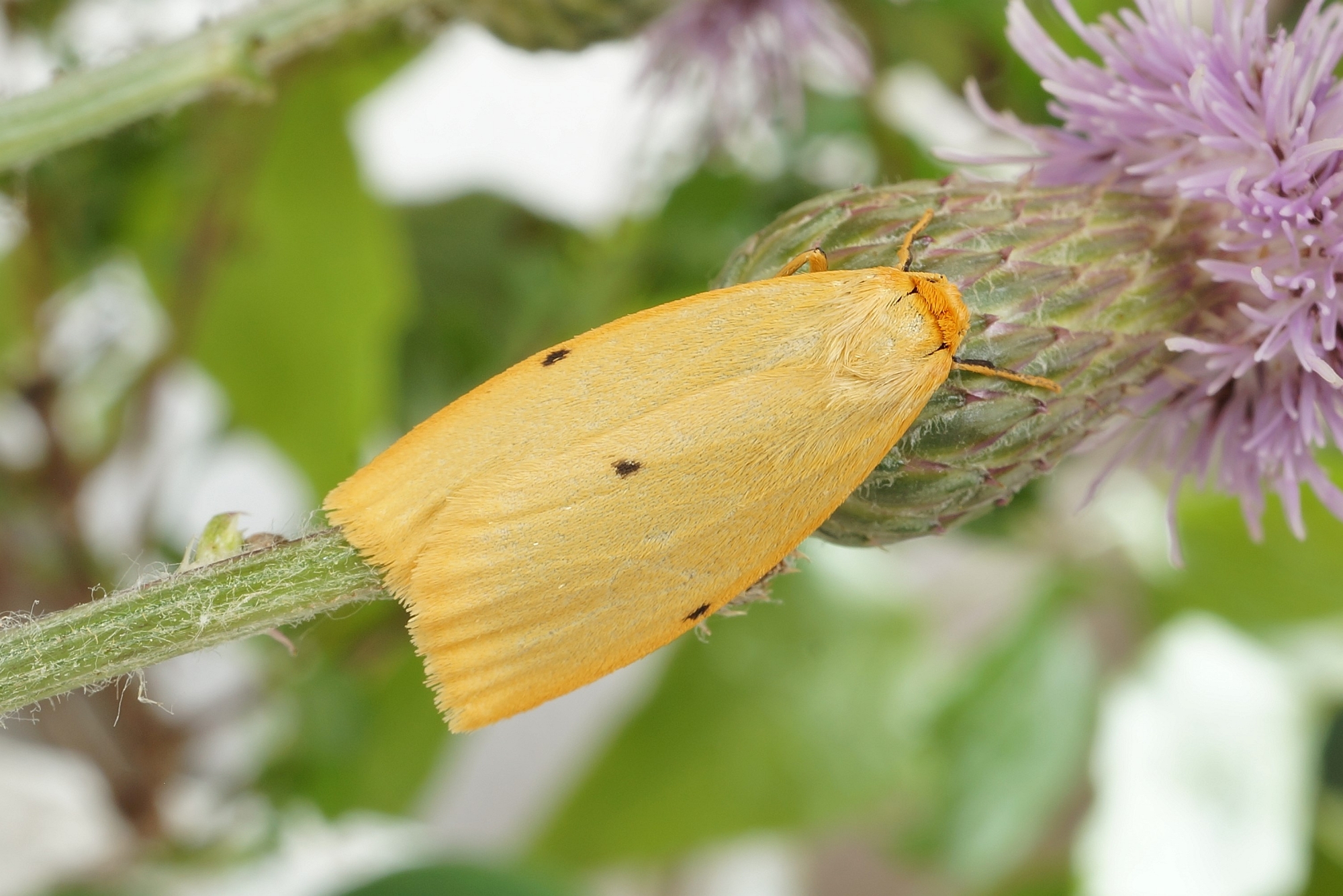Vorderflügel elfenbeinfarben, an den Rändern mit undeutlich abgesetztem orangefarbenem Saum. Hinterflügel grau mit orangefarbenem Fransensaum. Auf jedem Vorderflügel mittig ein schwarzer Punkt an der Flügelaußen-, und ein schwarzer Punkt an der Innenkante. Kopf und Prothorax orangefarben.