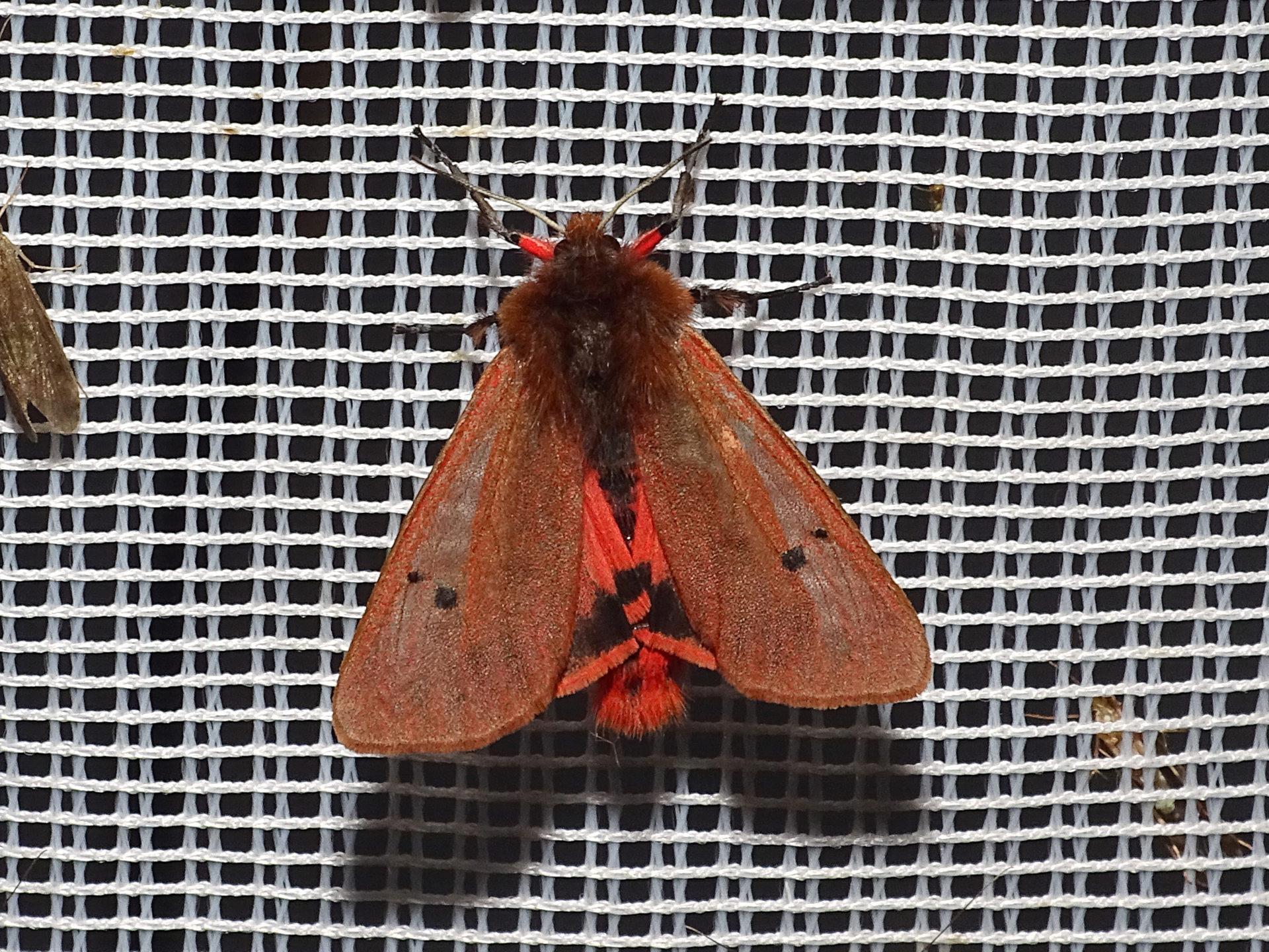 Hinterleib rot mit dunklem Rückenstreifen und schwarzen Punkten an den Seiten.