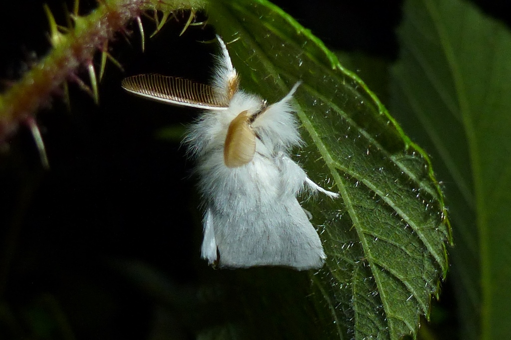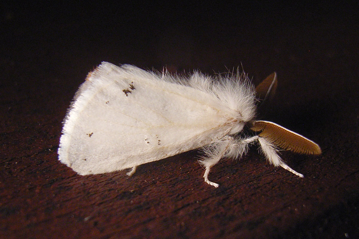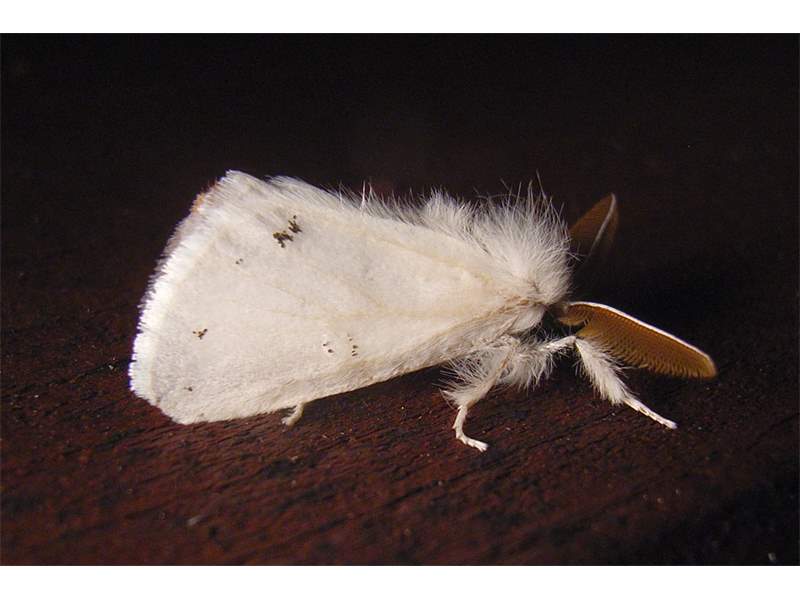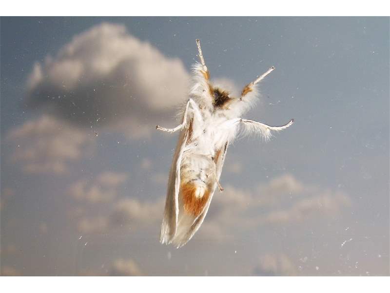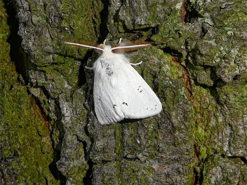 Alle Flügel rein weiß, ohne Zeichnung oder mit wenigen eingestreuten schwarzen Schuppen. Körper weiß, Abdomenende beim Männchen mit hellgelbem, beim Weibchen mit dunkelgelbem Afterbusch (deutscher Name!). Männchen mit deutlich gekämmten Fühlern.