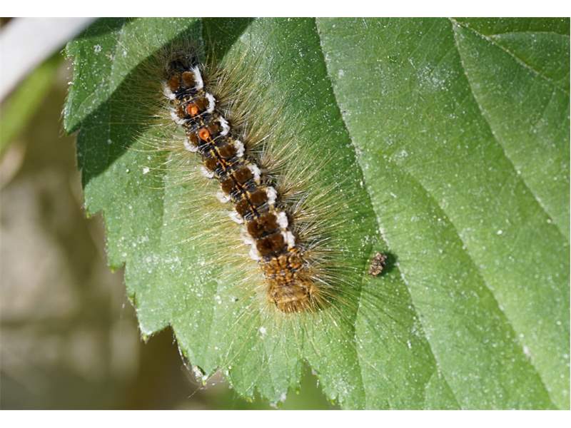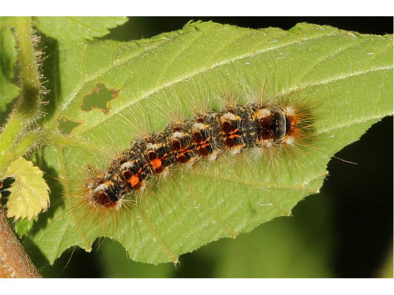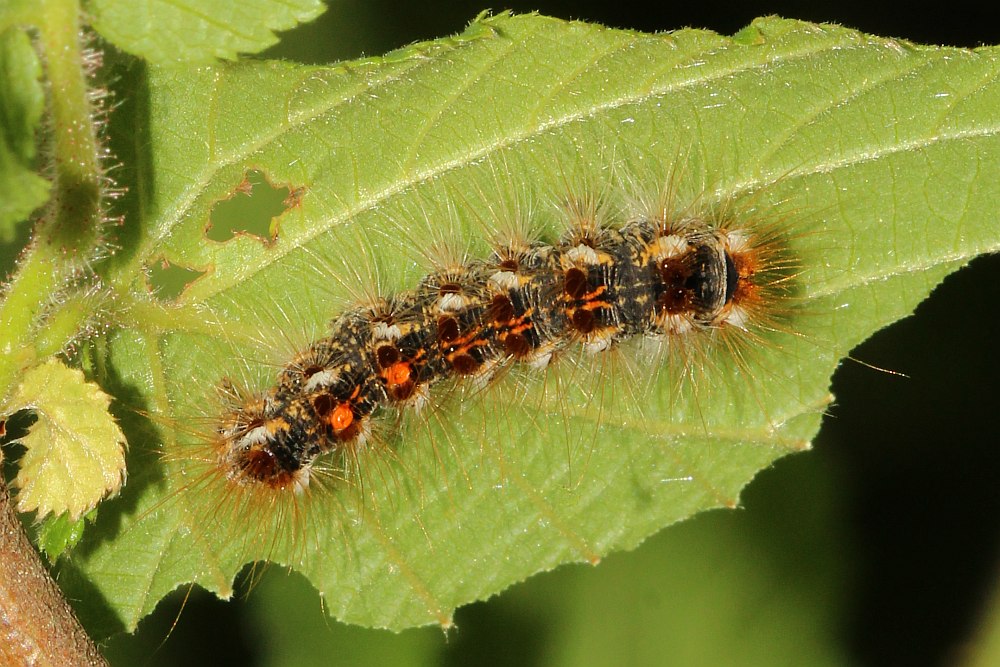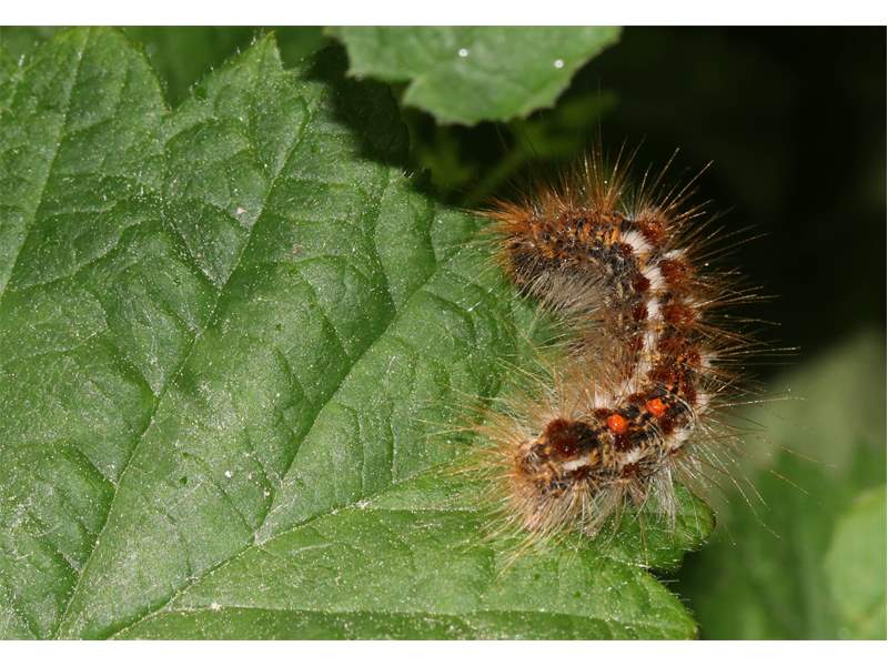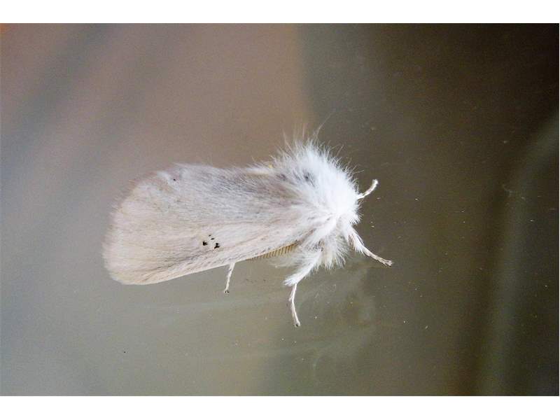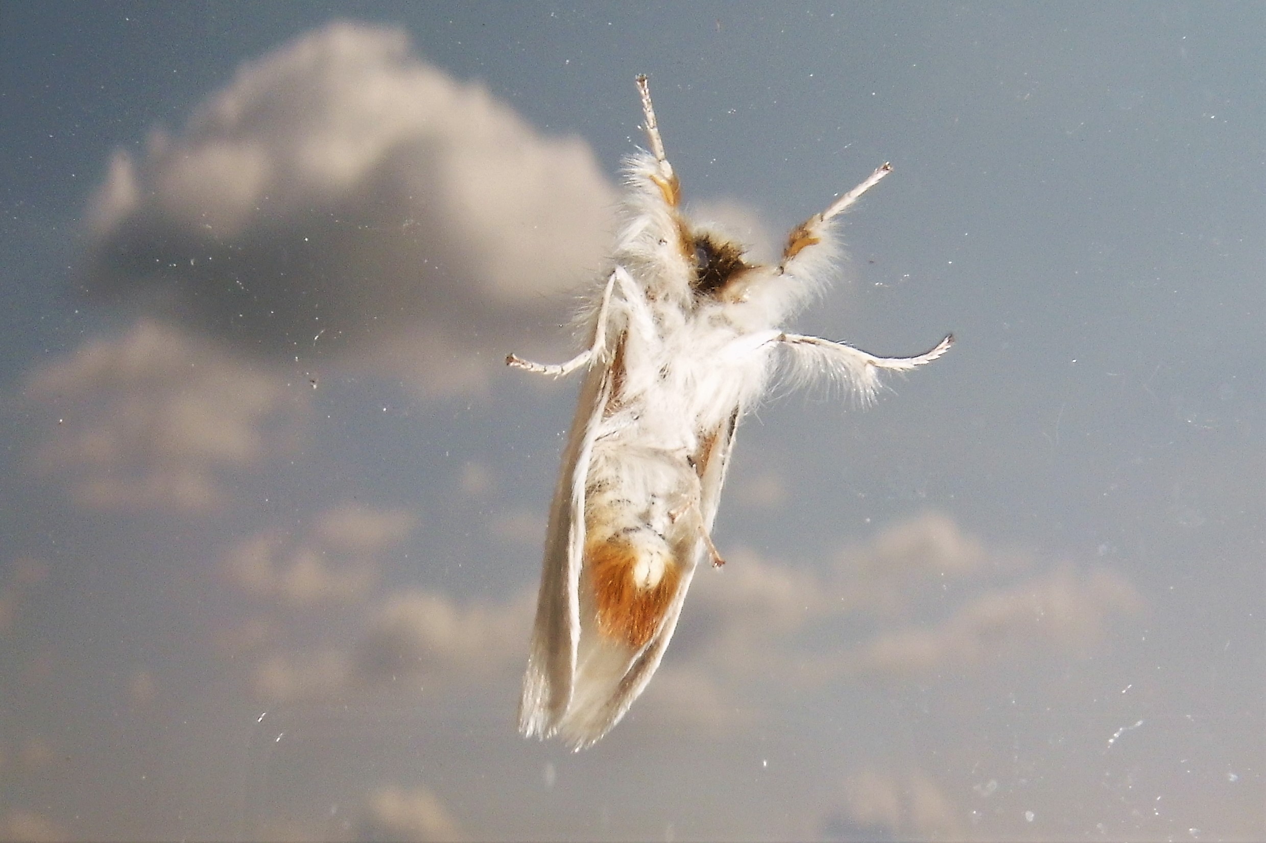 Alle Flügel rein weiß, ohne Zeichnung oder mit wenigen eingestreuten schwarzen Schuppen. Körper weiß, Abdomenende beim Männchen mit hellgelbem, beim Weibchen mit dunkelgelbem Afterbusch (deutscher Name!). Männchen mit deutlich gekämmten Fühlern.