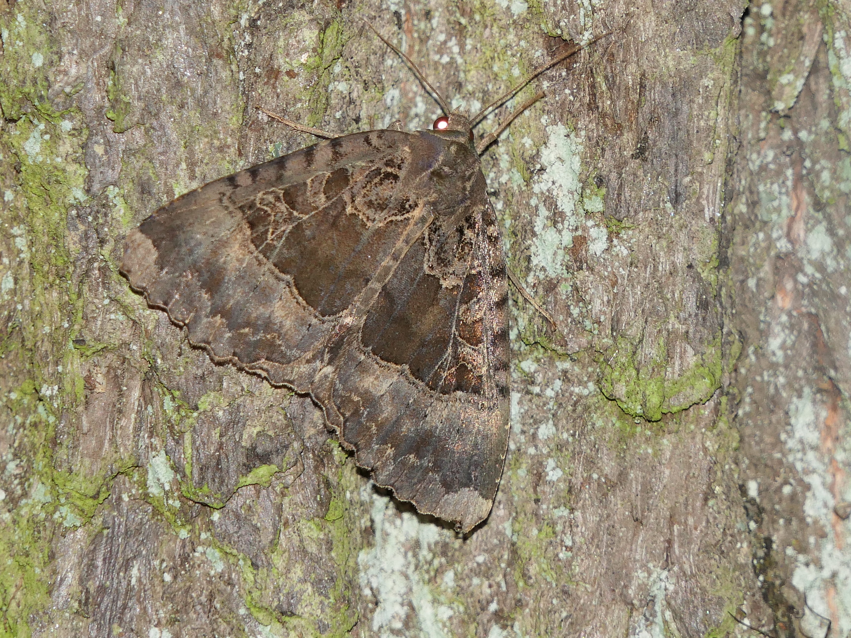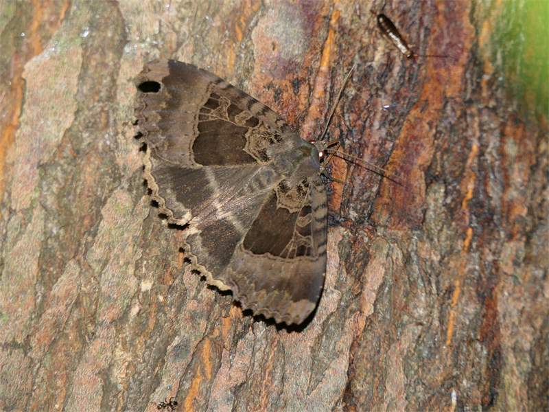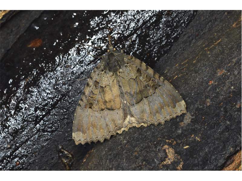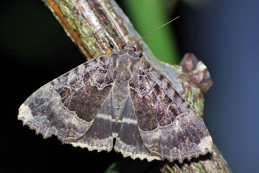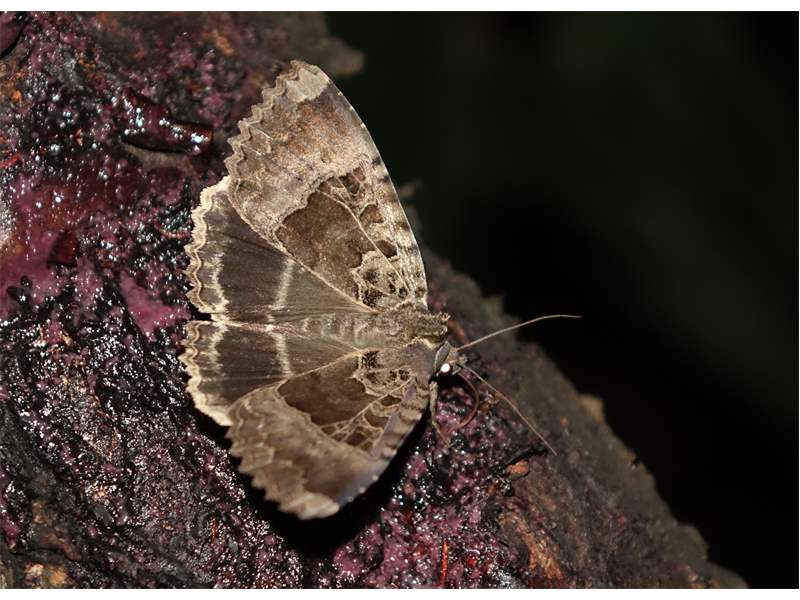 Hinterflügeloberseite: In der Flügelmitte und und kurz vor dem Außenrand zwei helle Linien, Bereich dazwischen dunkler als die benachbarten Flächen.