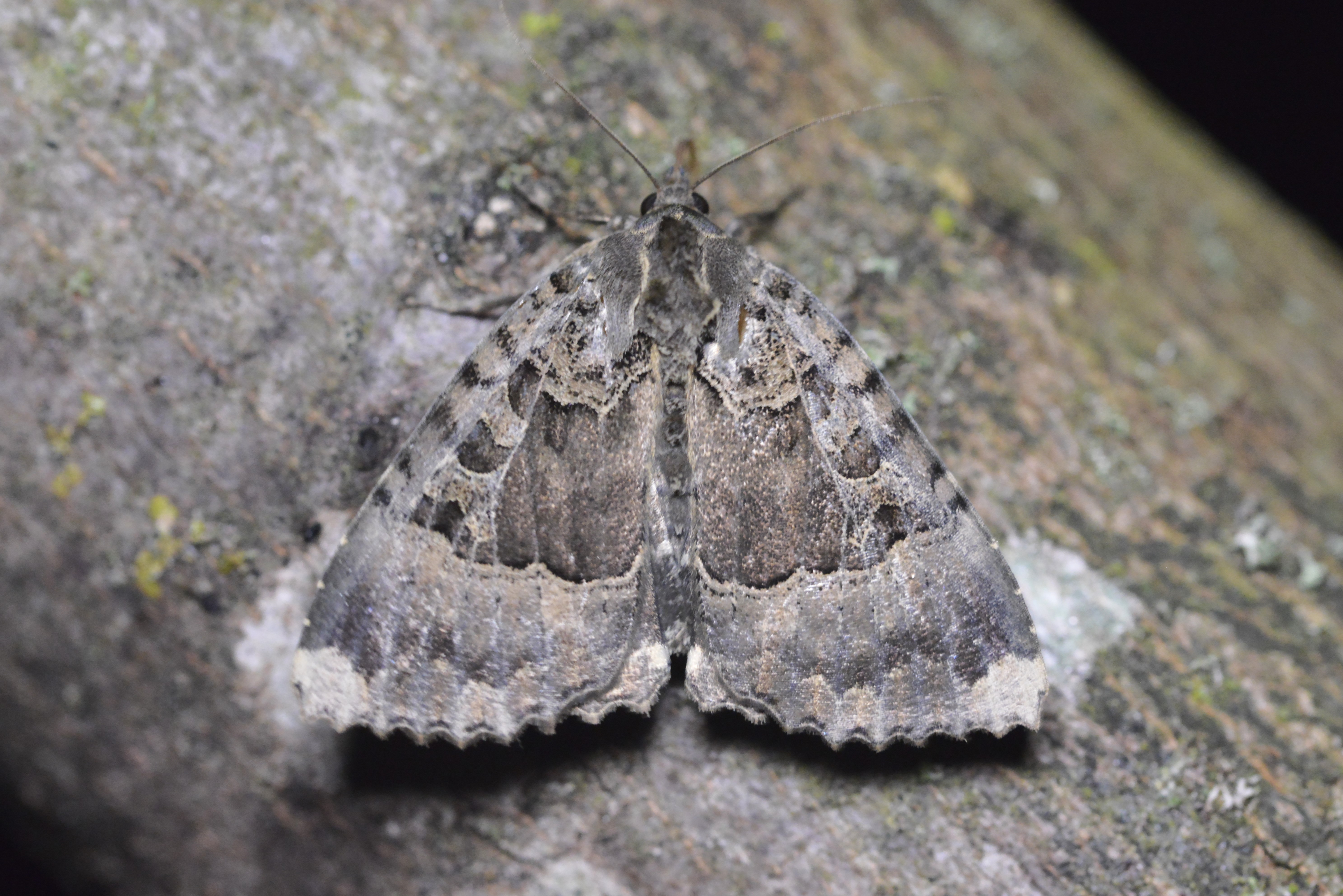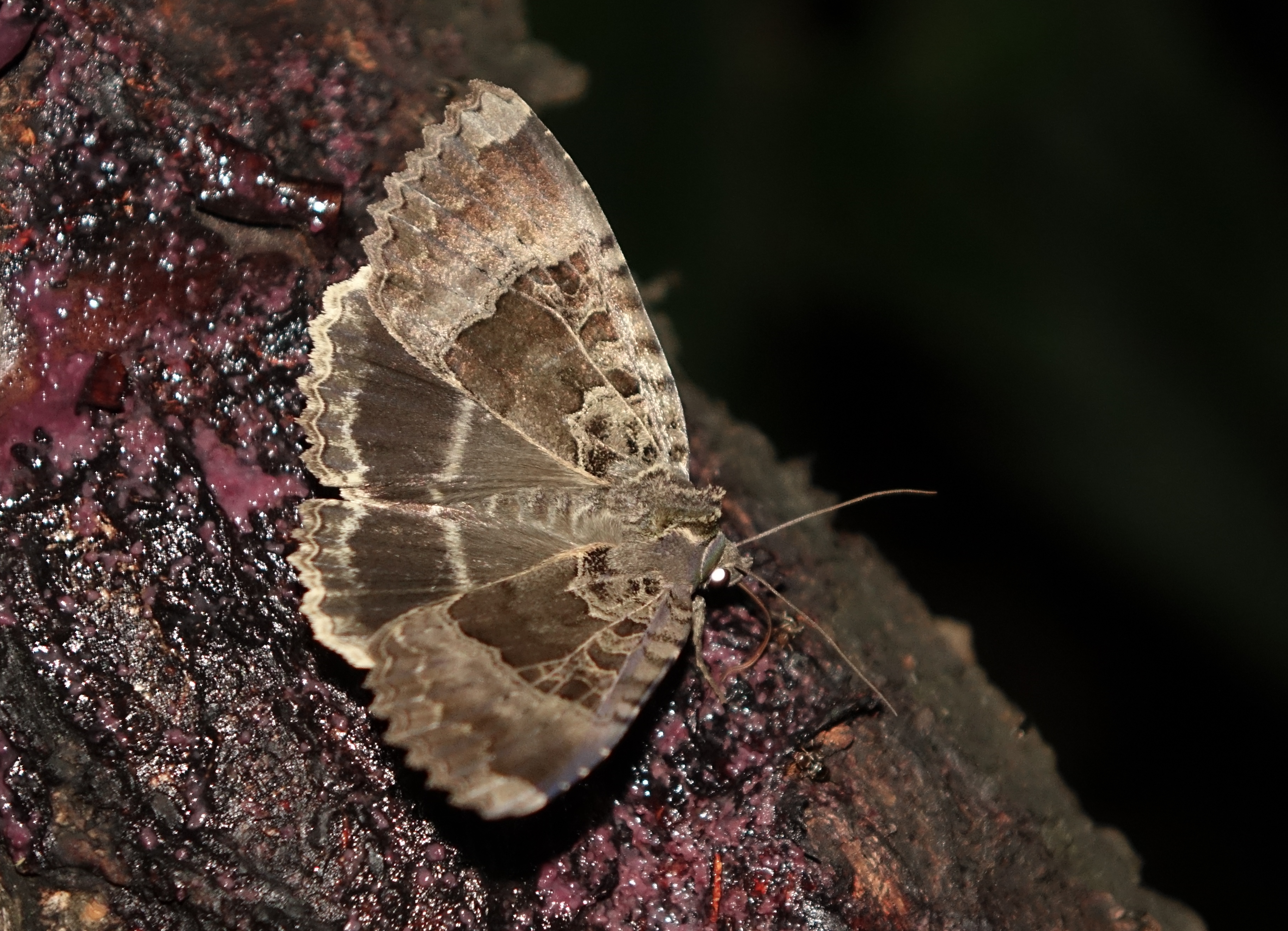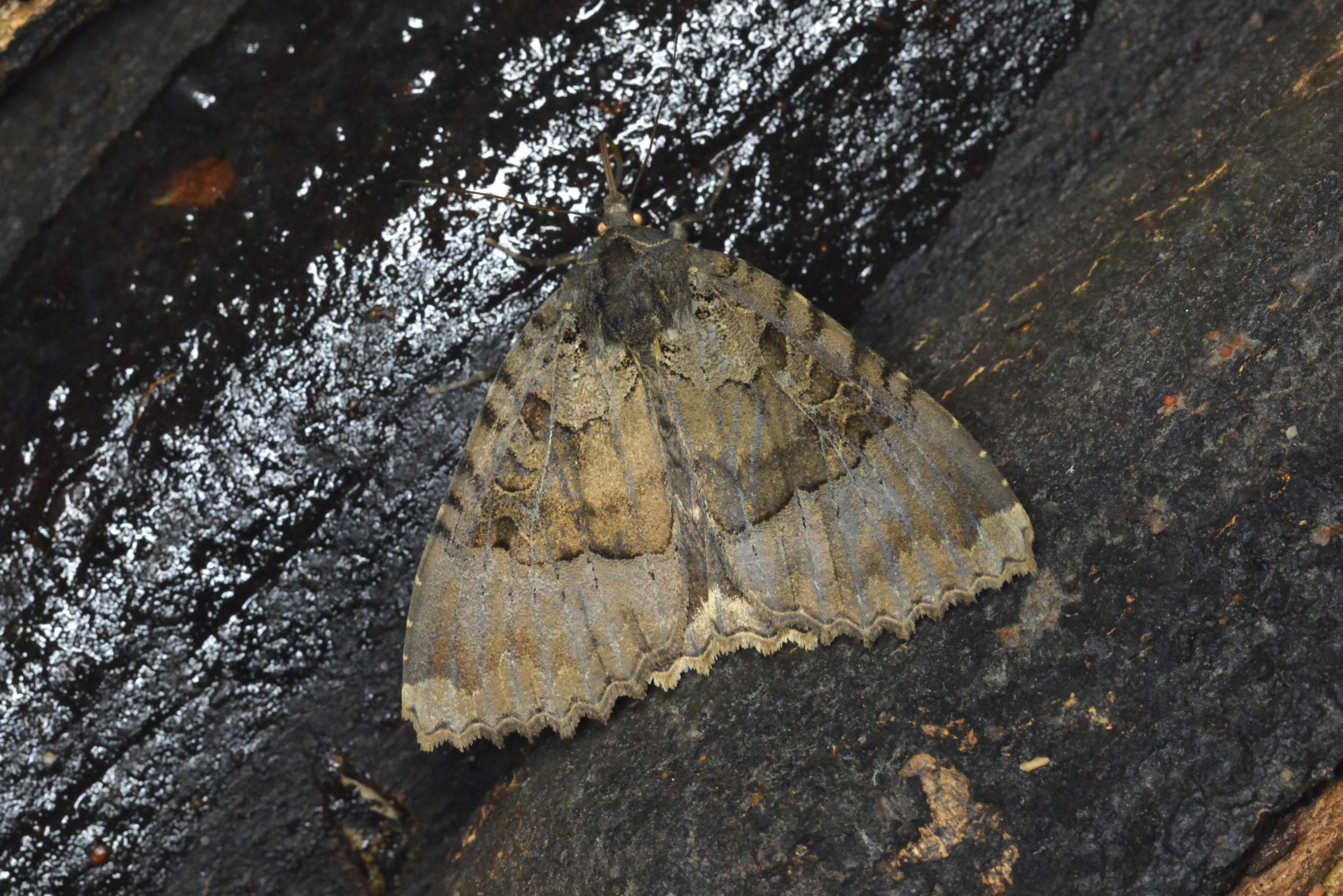 Hinterflügeloberseite: In der Flügelmitte und und kurz vor dem Außenrand zwei helle Linien, Bereich dazwischen dunkler als die benachbarten Flächen.