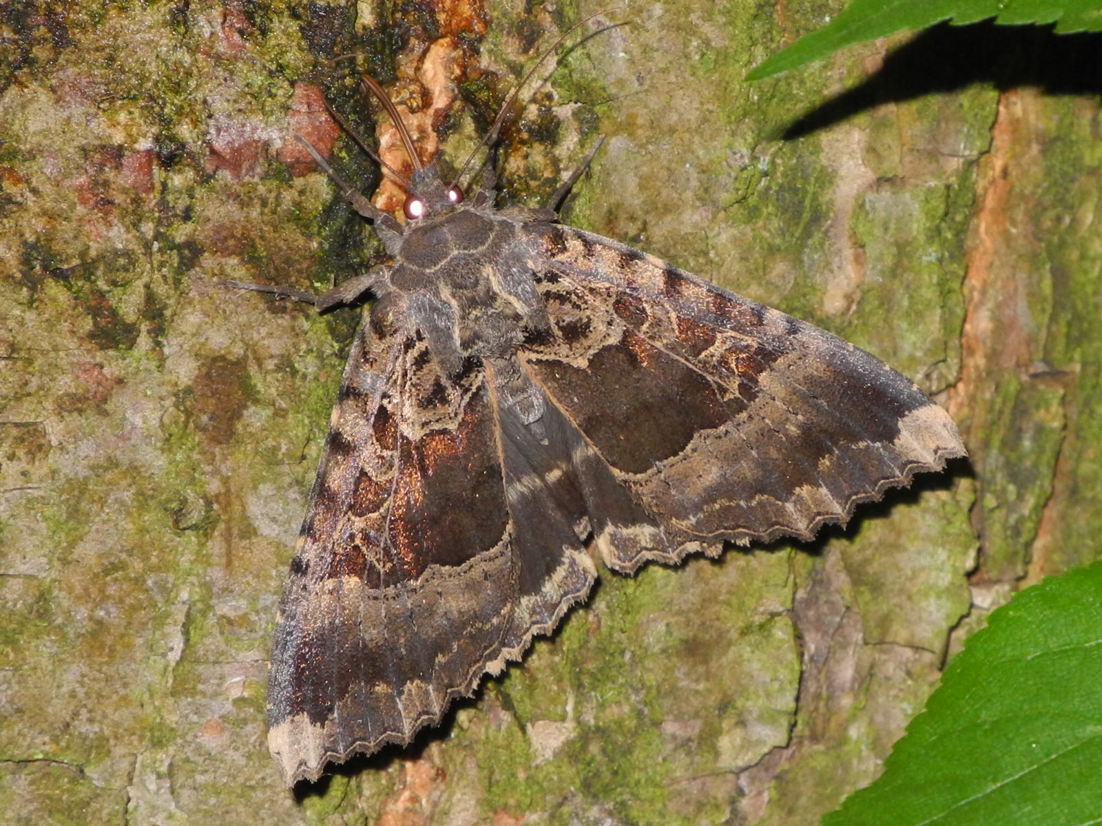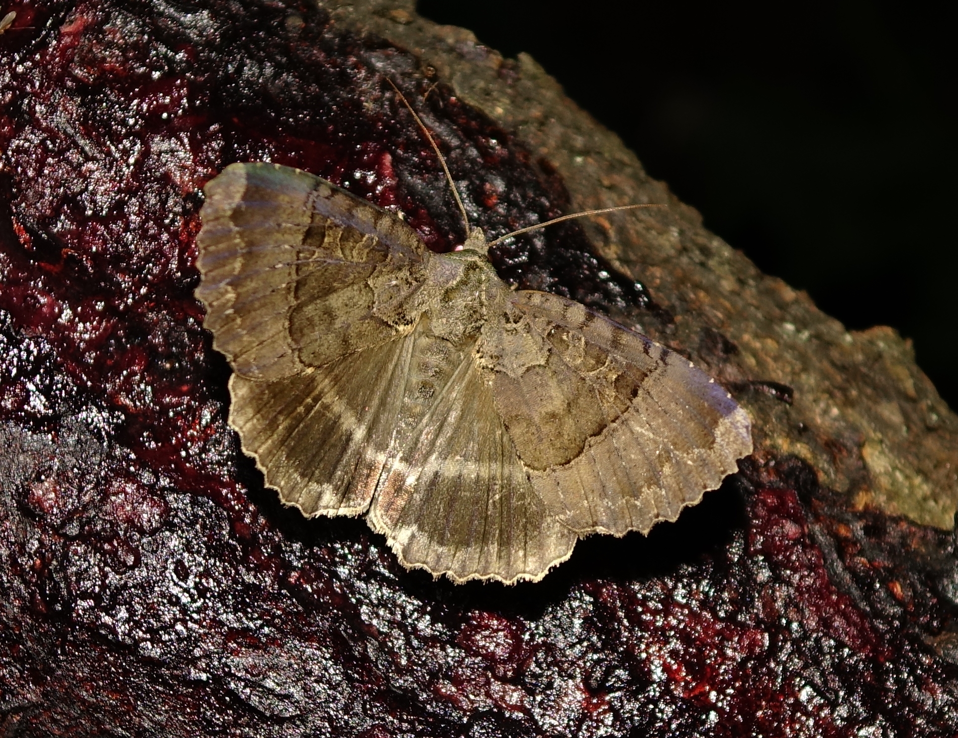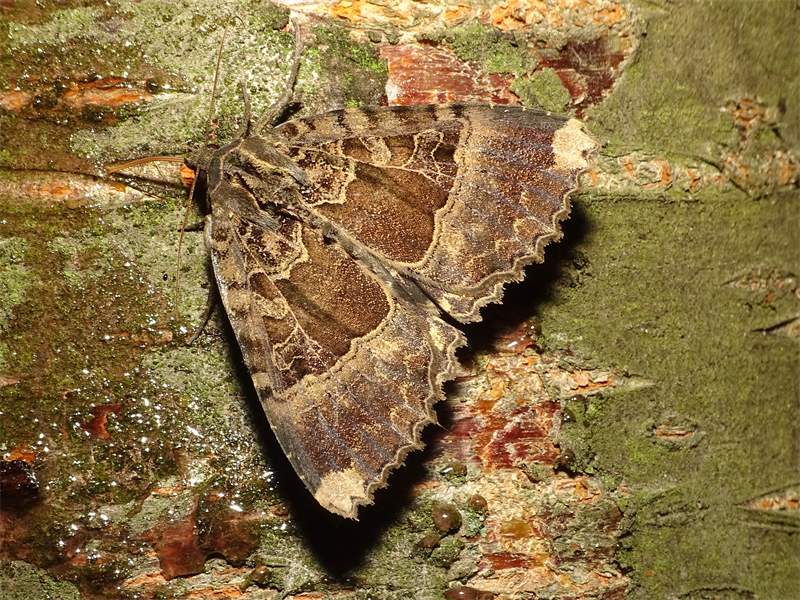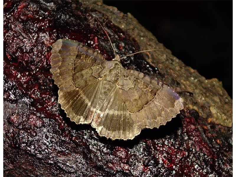 Grundfarbe der Vorder- und Hinterflügeloberseiten dunkelbraun, olivbraun bis schokoladenbraun. Außenrand beider Flügel gewellt.
