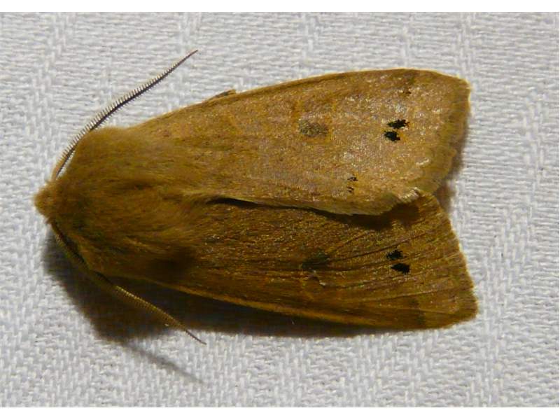 Vorderflügeloberseite: Grundfarbe: graugelb, rötlichgelb bis bräunlich. Beide Querlinien, Wellenlinie und Makeln heben sich kaum von der Grundfarbe ab, Makeln sind schwach hell umrandet, Nierenmakel im unteren Teil meist etwas verdunkelt. Aufgrund der ziemlich kontrastarmen Zeichnung fallen die zwei charakteristischen schwarzen (manchmal nur rotbraunen) Flecken (Name!), die sich etwa in der Mitte innen an der hellen, kaum erkennbaren Wellenlinie befinden, besonders auf. Innen an der Wellenlinie können sich optional noch weitere dunkle (meist nicht schwarze) Flecken in den Bereichen des Flügelinnenrandes/Flügelvorderrandes befinden.